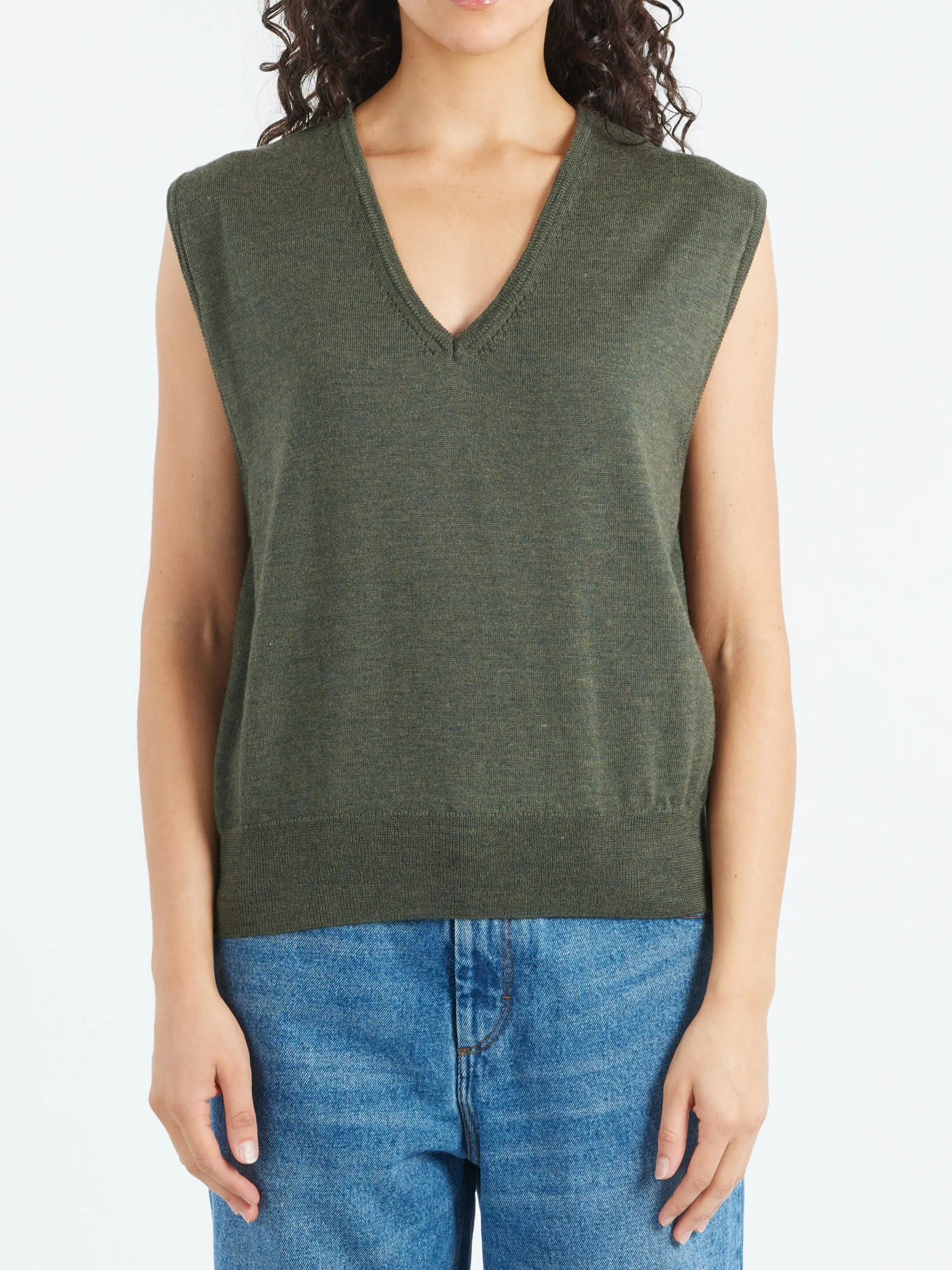 A sleeveless, deep v-neck merino wool vest. Straight cut tightened with a ribbed edge.