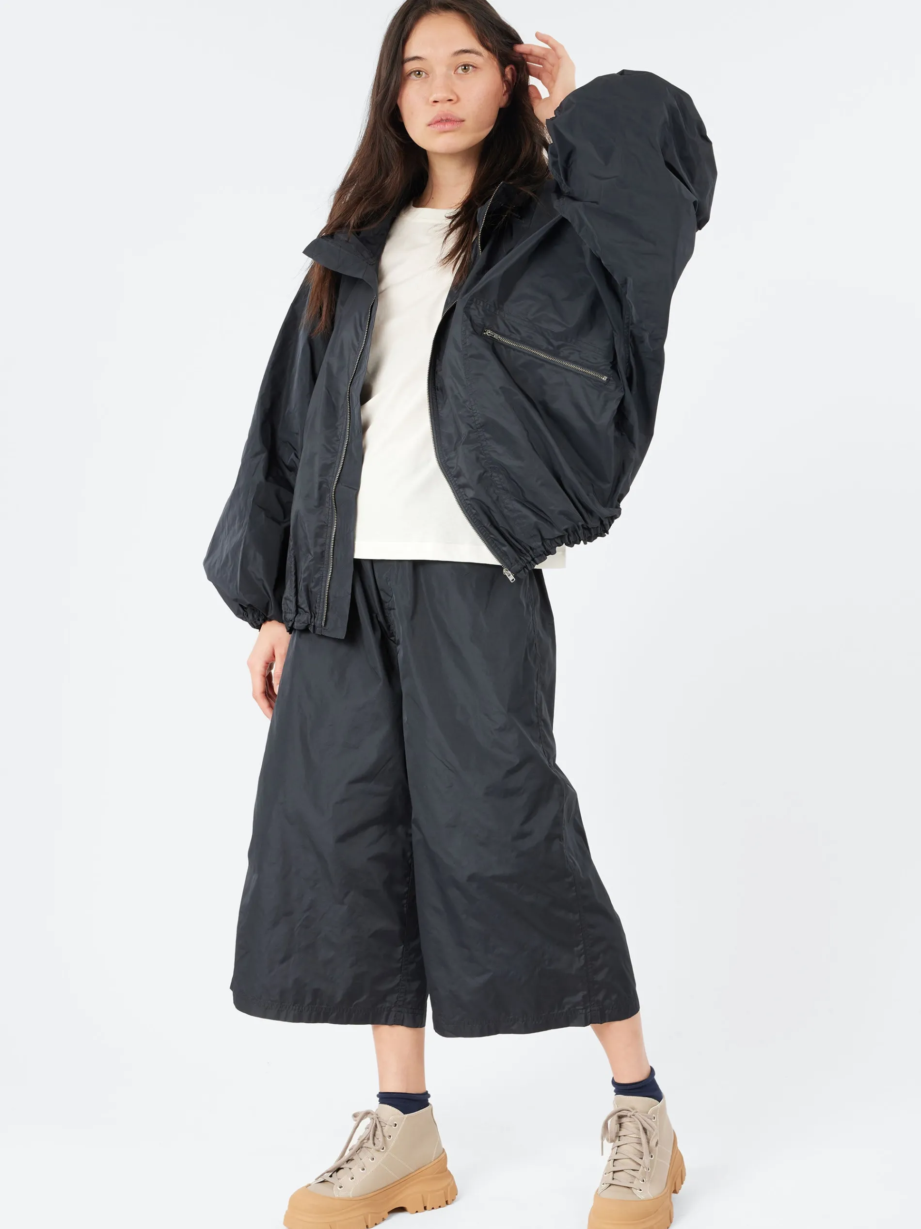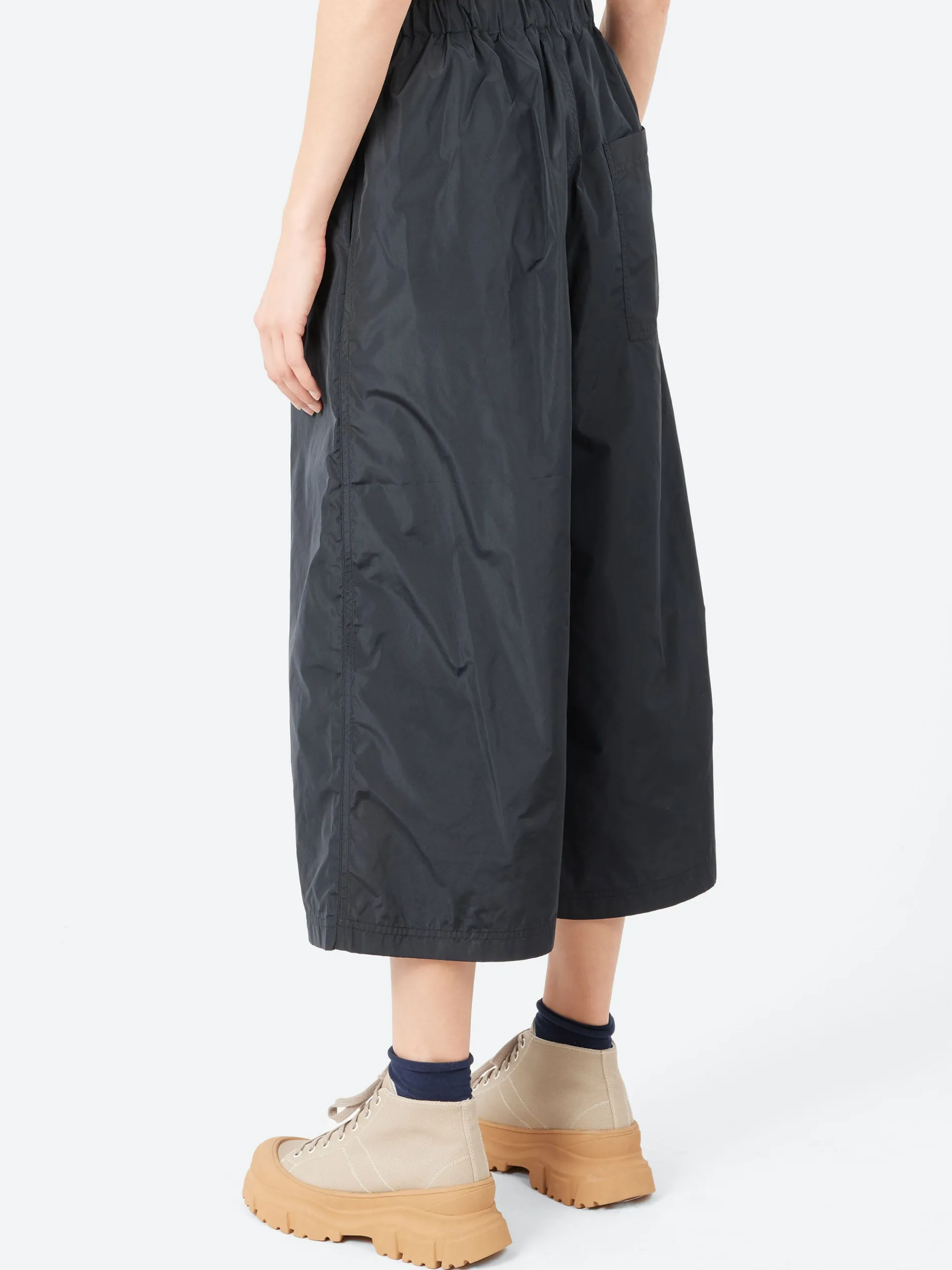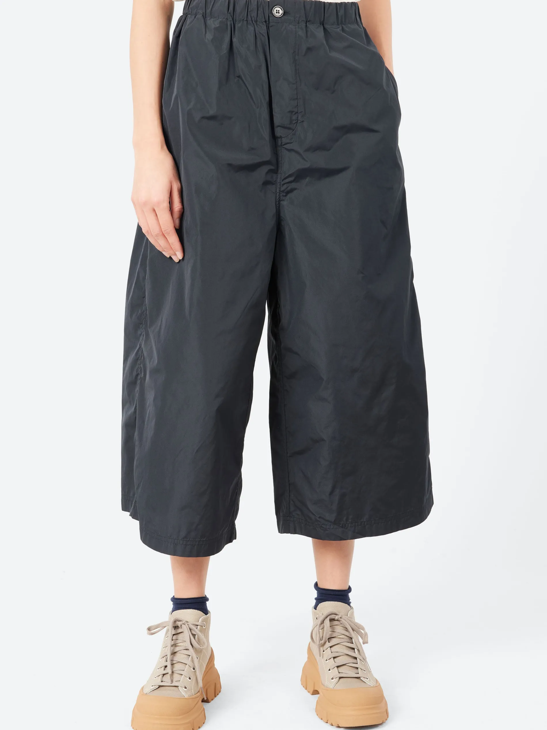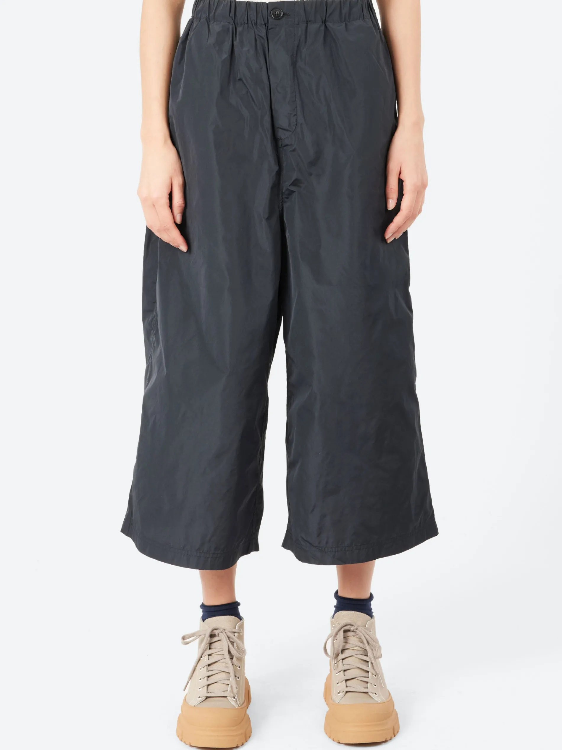 The Sofie D’Hoore Ponce Pant is a relaxed, cropped wide-leg pant made from poly taffeta. It features a button fly and an elastic waistband for comfort and ease. The design includes side pockets and a single back patch pocket, combining functionality with a modern, minimalist aesthetic. These pants offer a versatile, stylish option for casual and smart-casual looks.