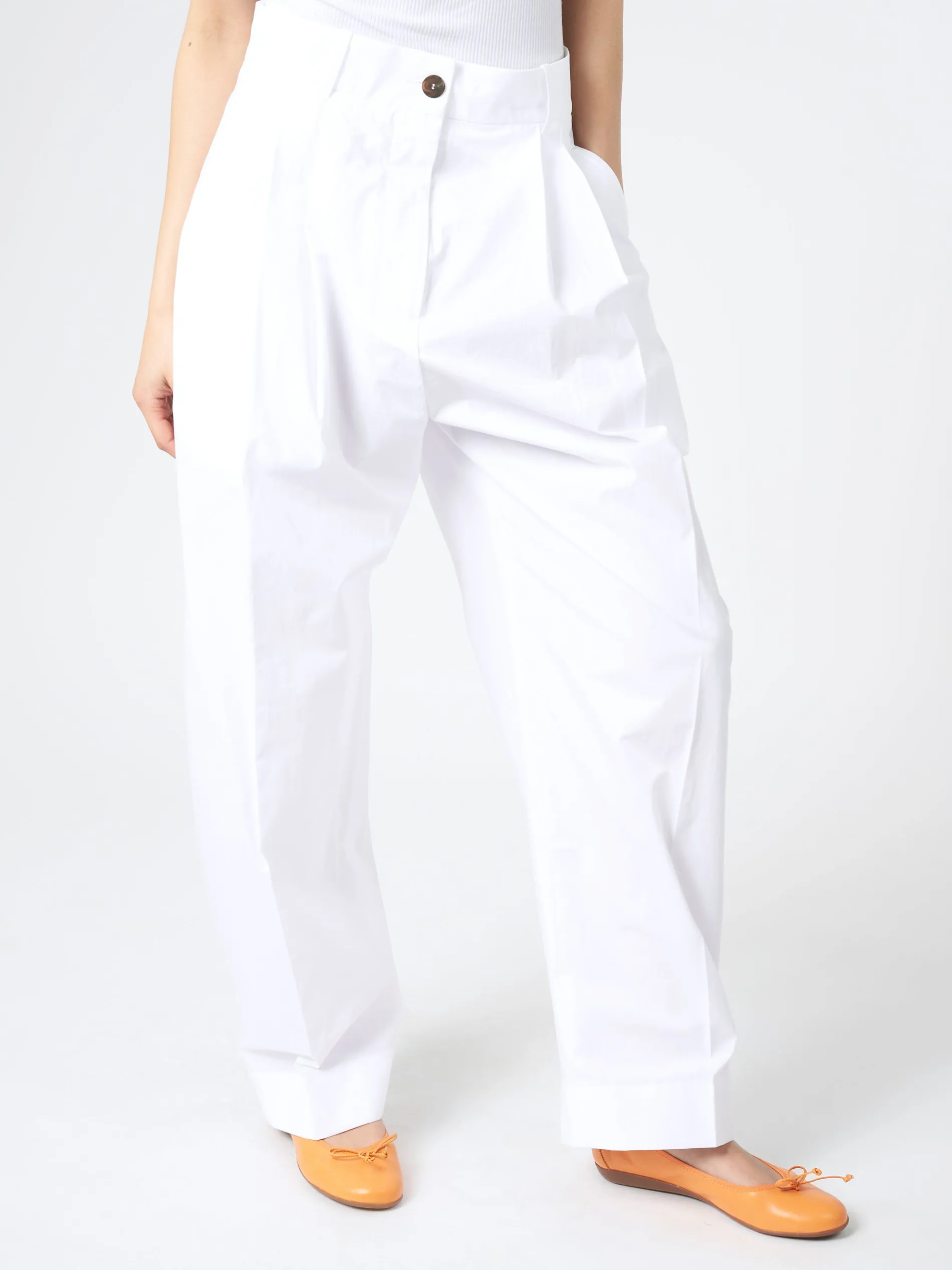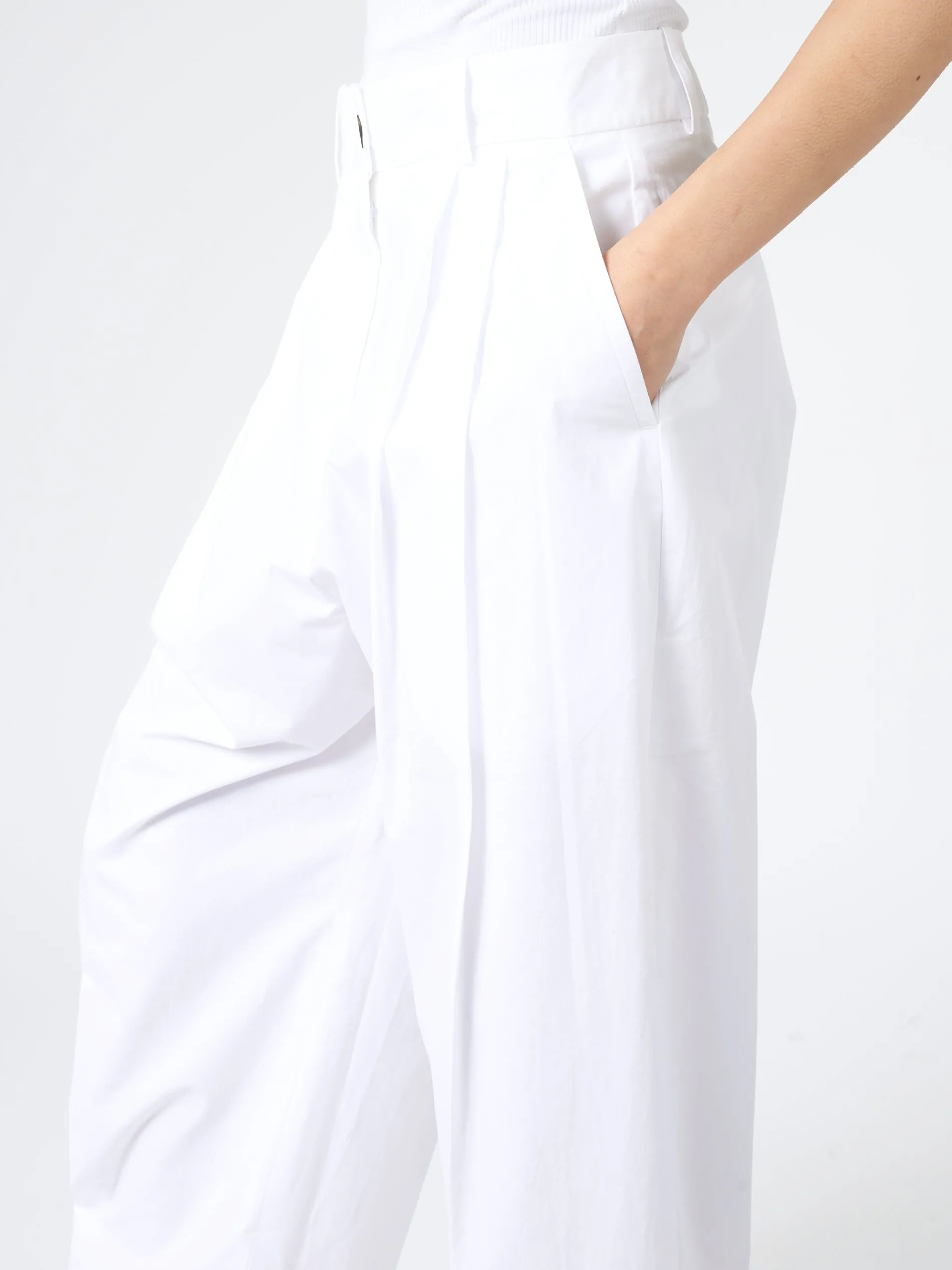The Acuna pant from Studio Nicholson, crafted in a crisp powder cotton, combines a high rise with voluminous double pleats and a wide, flowing leg.