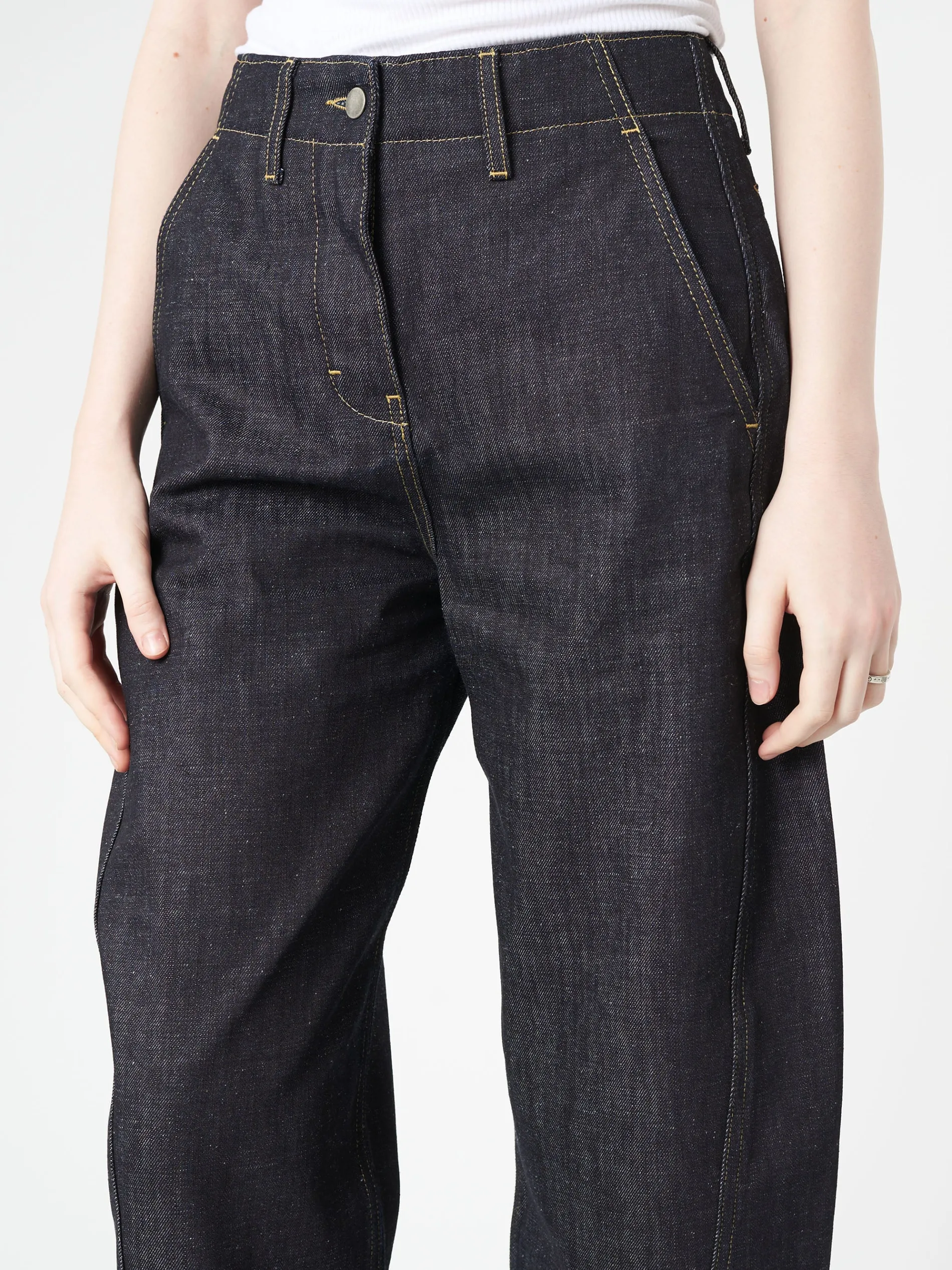 High waisted curved leg denim pant made from ISKO’s sustainable raw R-TWO™ denim.