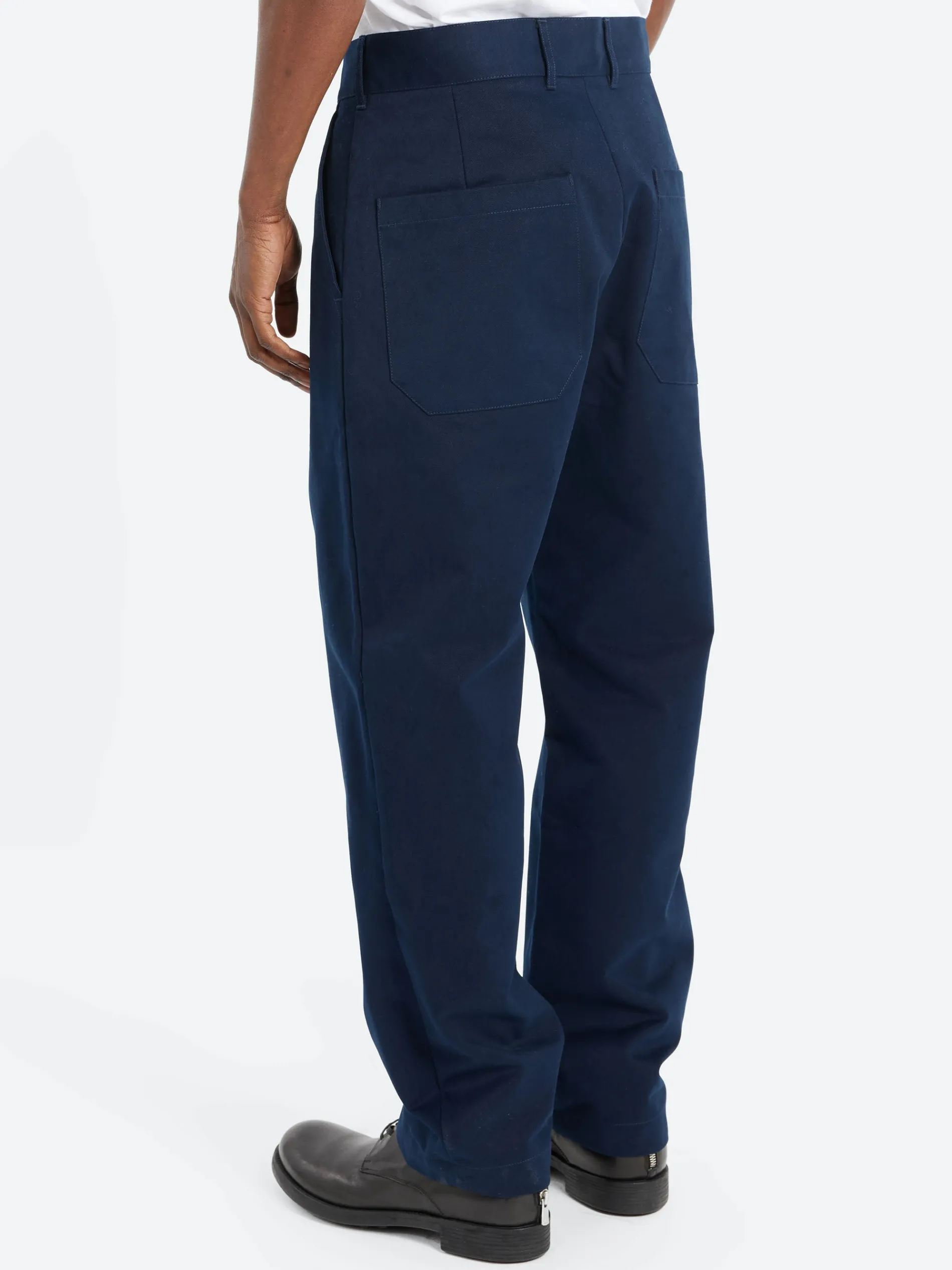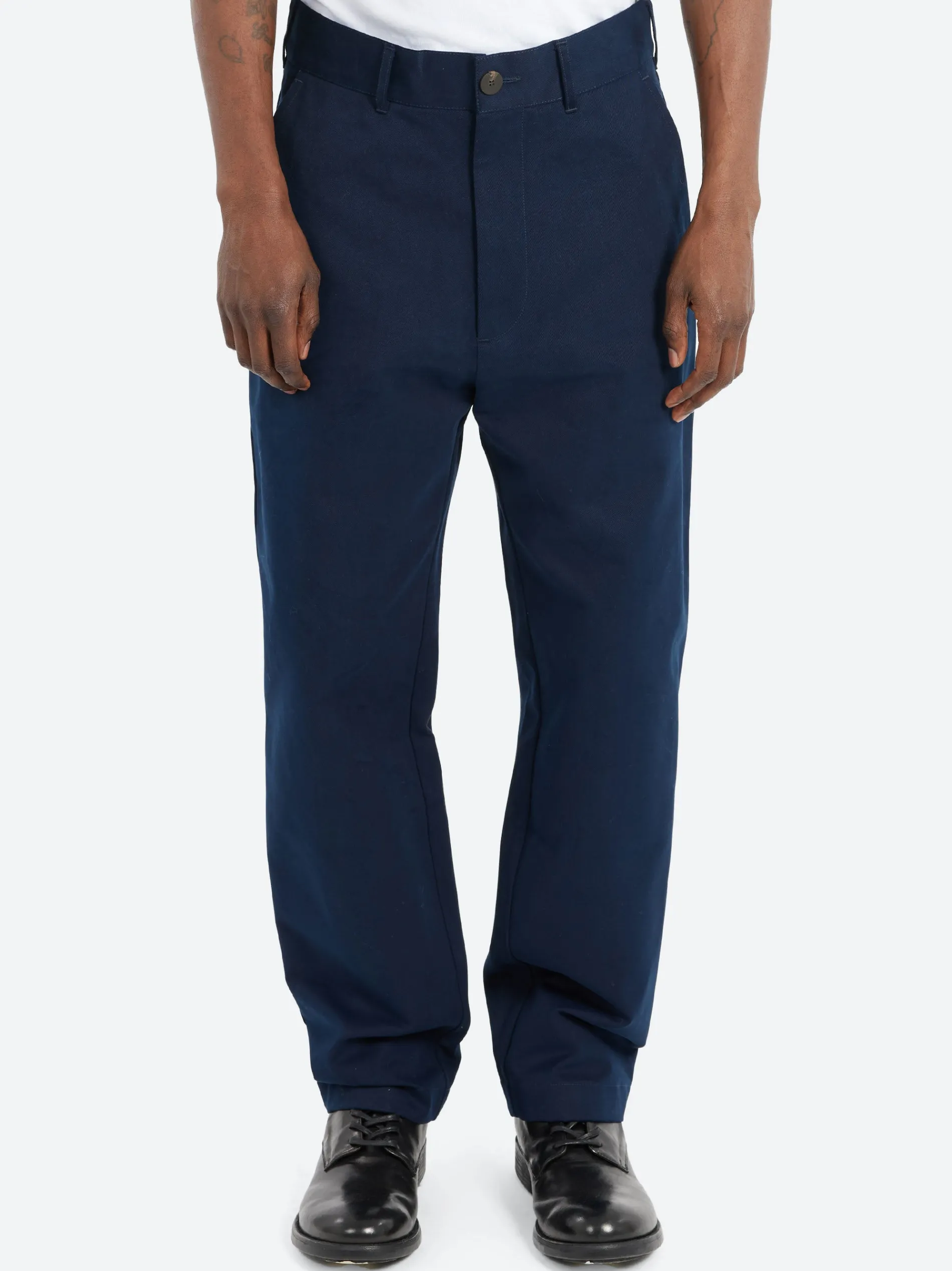 High-waisted flat front pant made from Studio Nicholson’s signature Italian peached cotton.