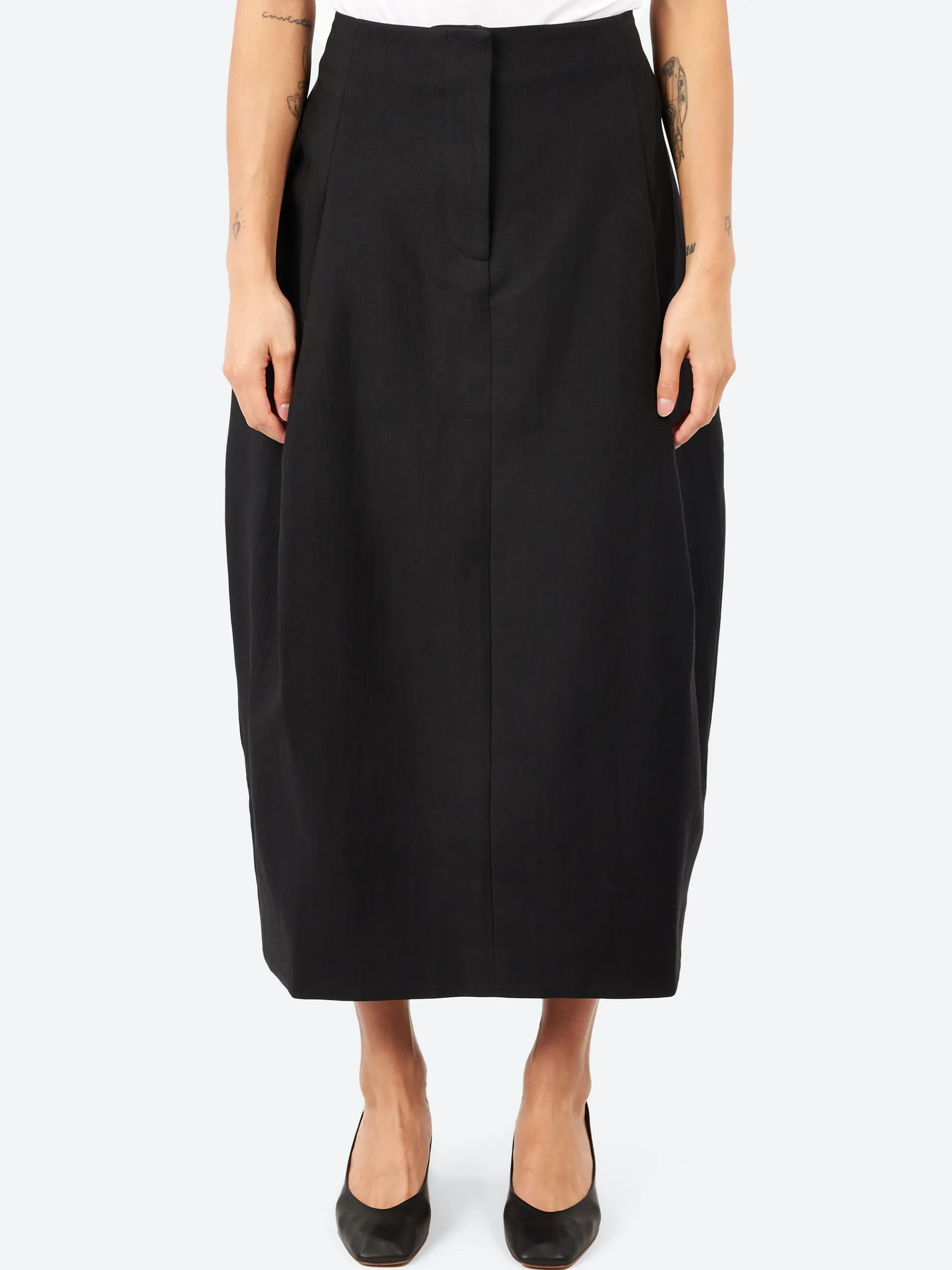 The Carson skirt is cut from a textured double cotton that’s woven to a twill weave, creating a soft structure that helps lend a sculptural bell-like shape to the silhouette. It has deep inverted pleats that are cleverly folded to create extra volume and which also draw the eye down to a thick folded midi hem that stops at the calf.