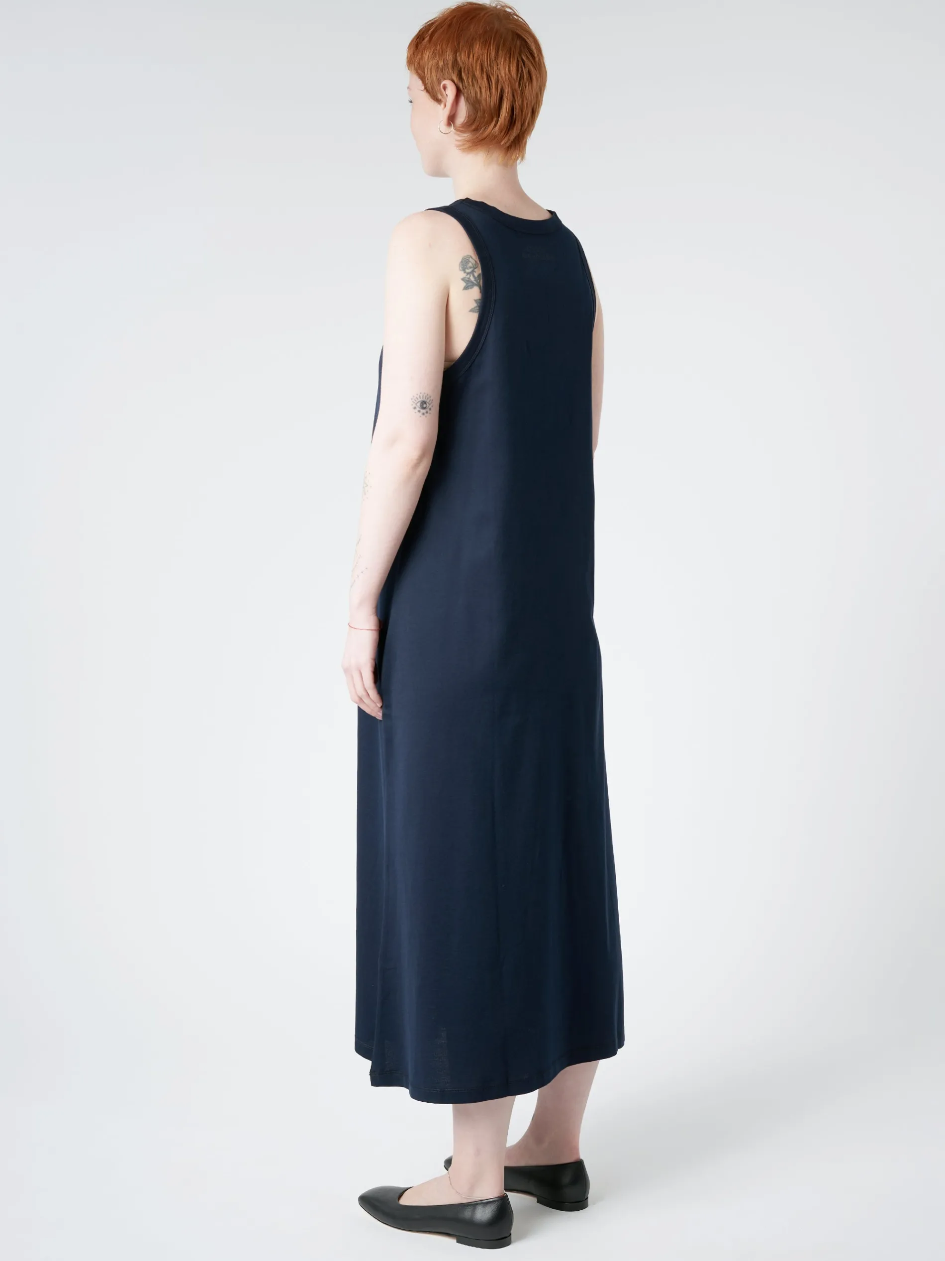 A fluid tank dress made from a mid-weight cotton jersey featuring a round ribbed neck and armholes.