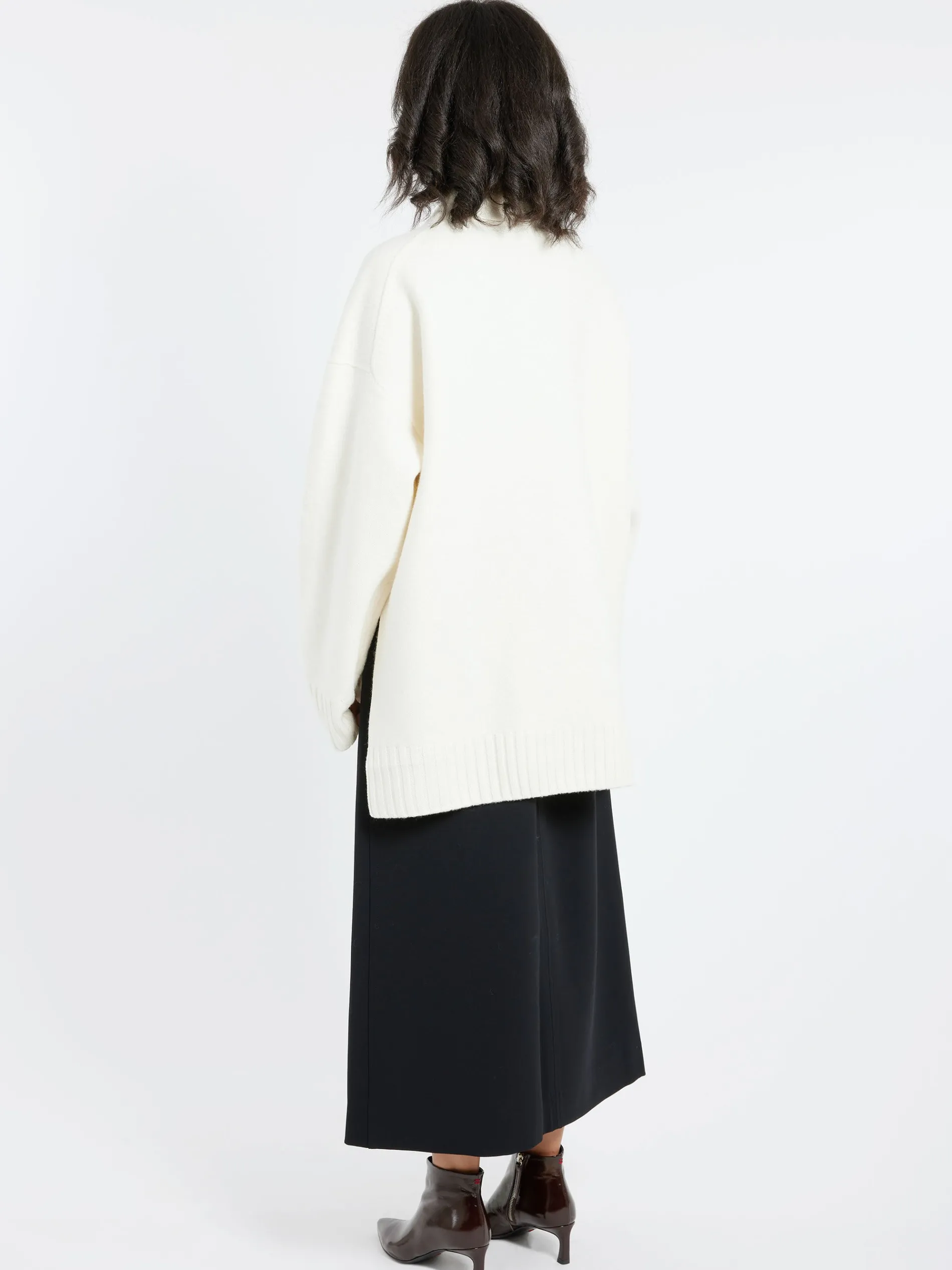 Hozu has a square body shape and a high neck that combine to create a flattering, minimalist silhouette. The softly boiled wool has an extraordinarily fleecy texture.