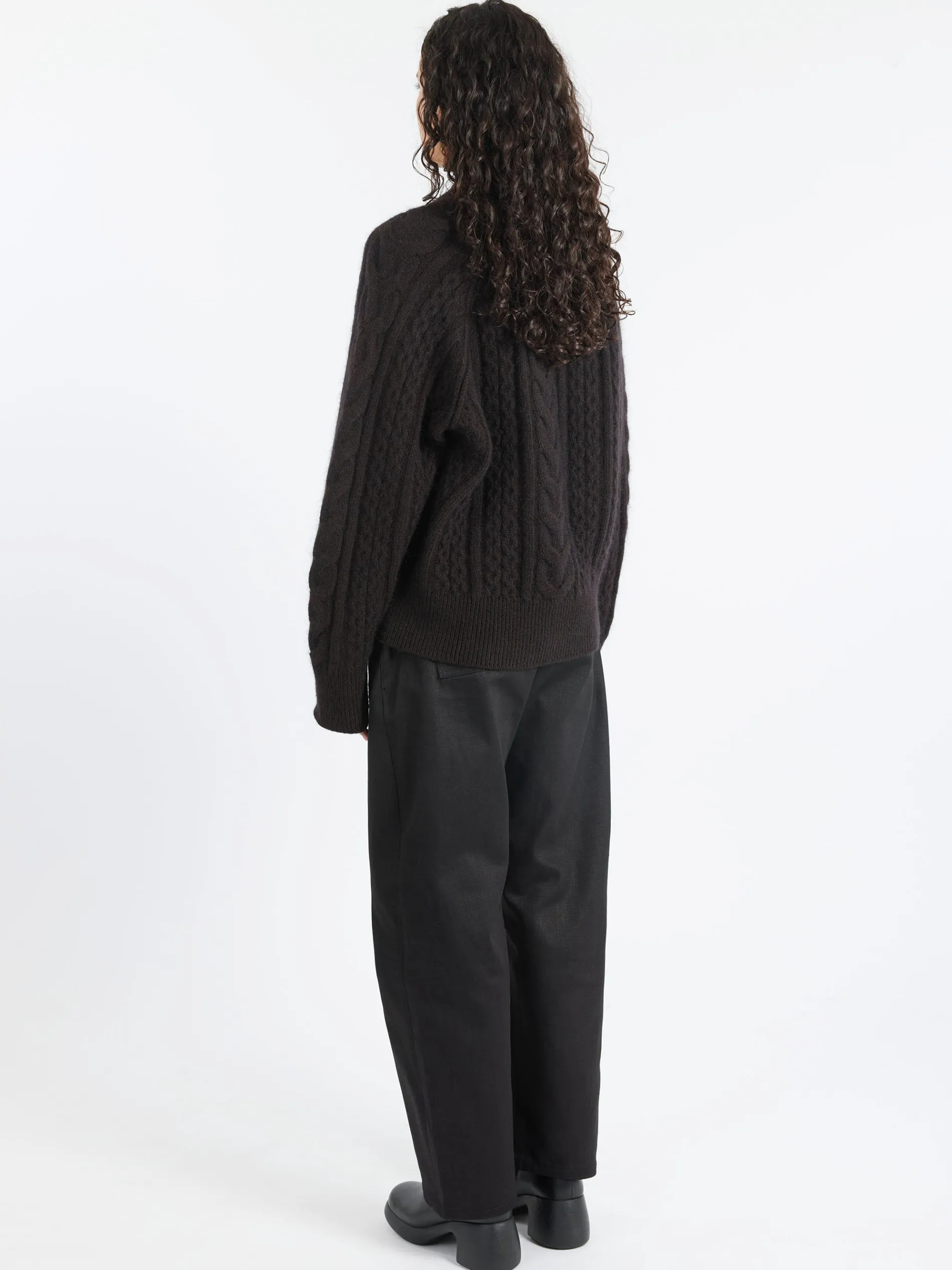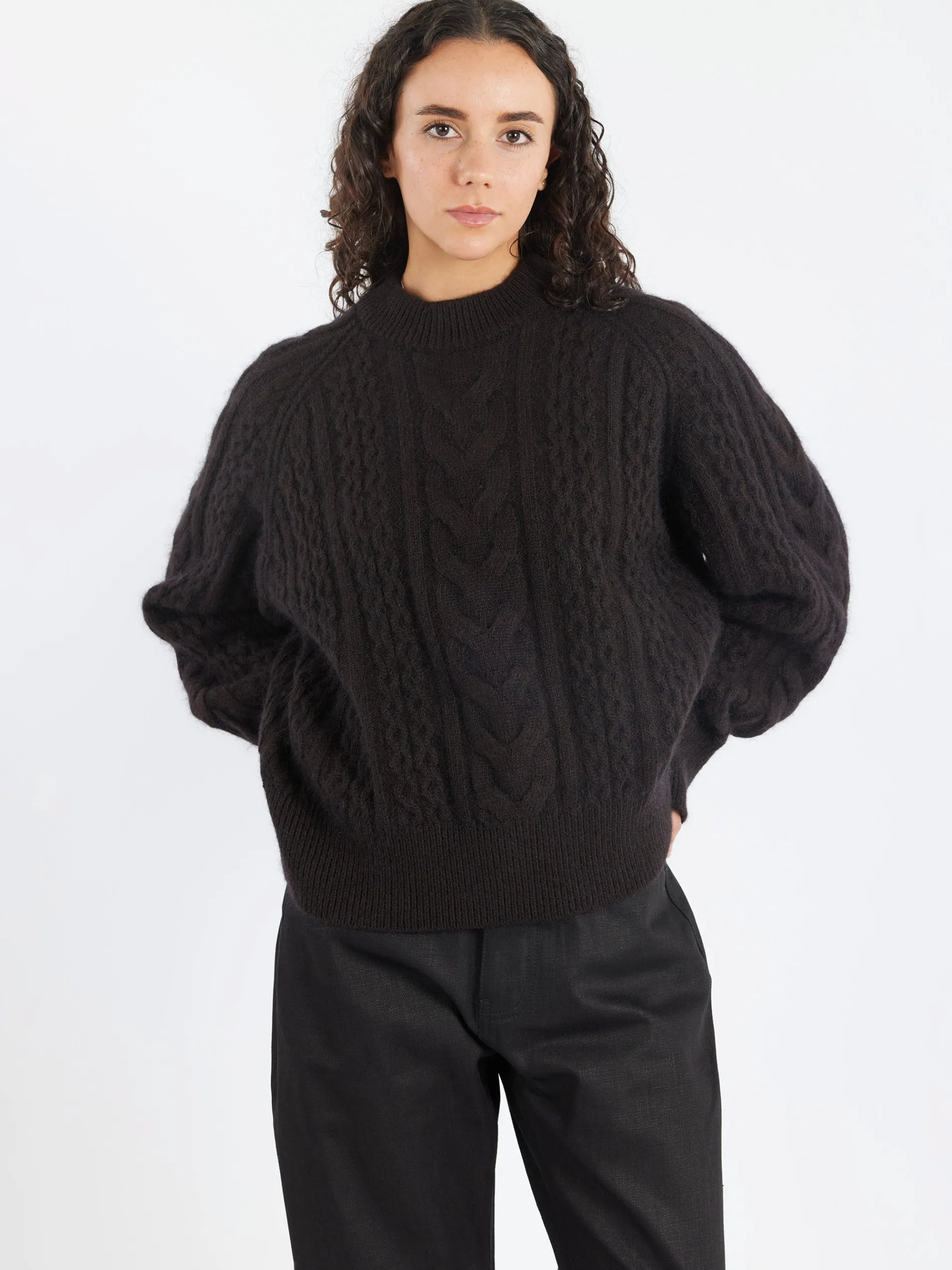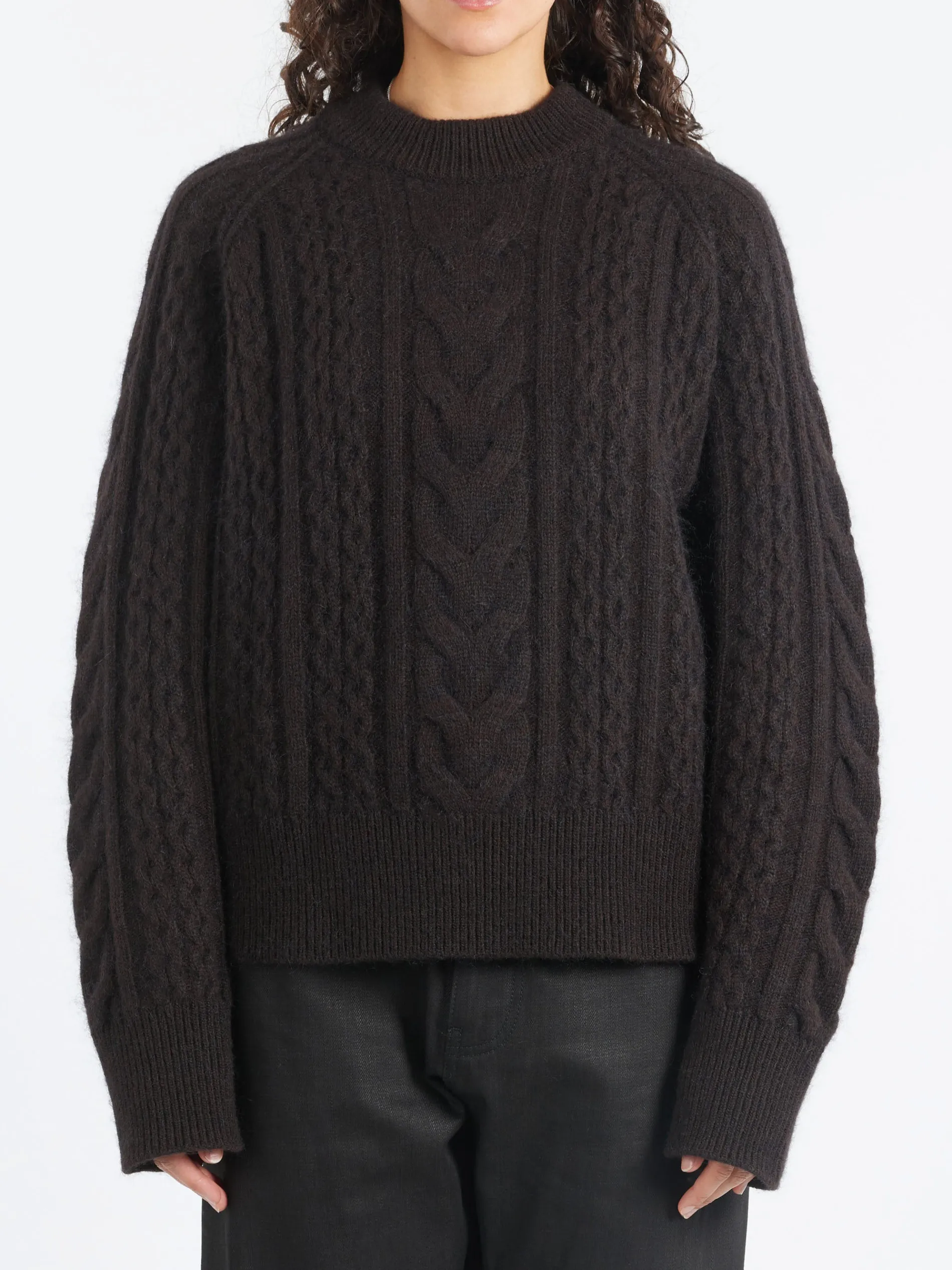 Studio Nicholson Molve jumper is spun from unbrushed mohair Aran yarns that result in a soft, fluffy handle and gentle luster. It is accented with cable knits in varying sizes for textural interest and has chunky ribbed stitching at the neck and hem to hold its shape.