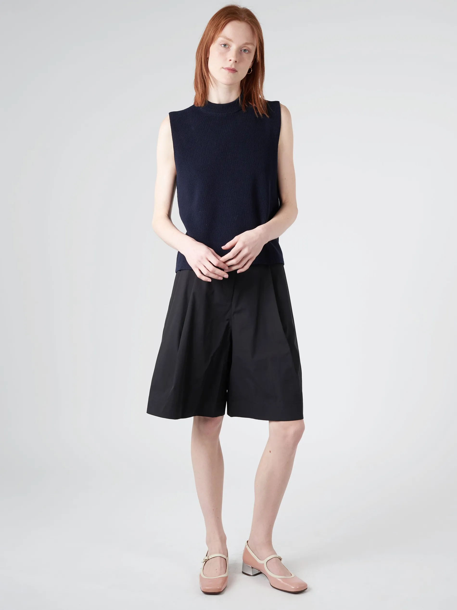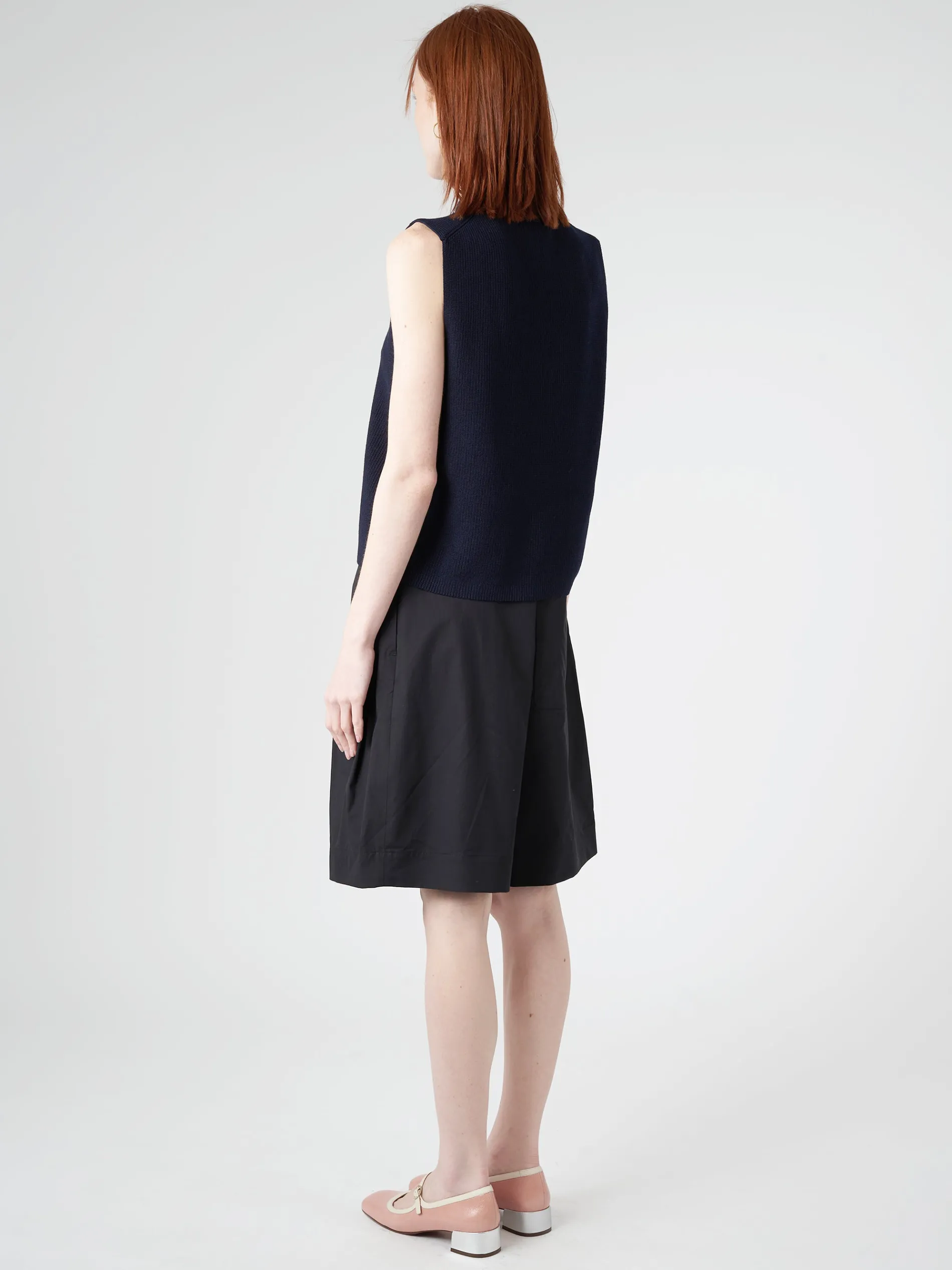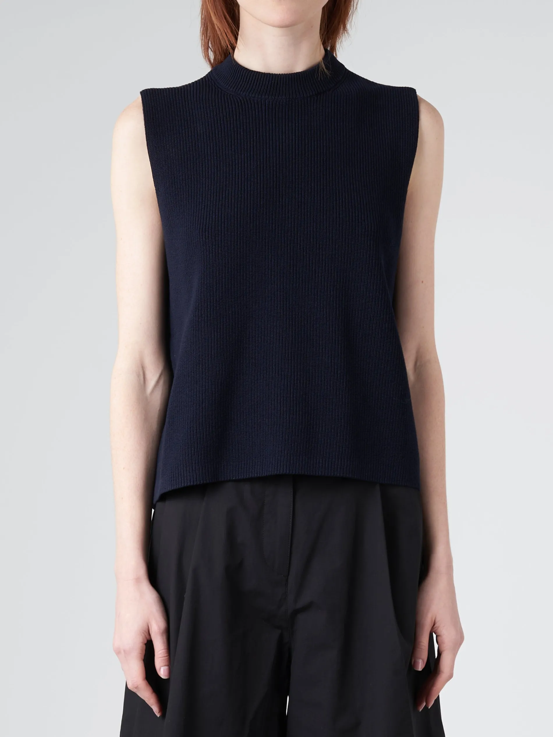 Sumire is knit in a substantial dry high-twist cotton with clean cutoff sleeves and a flat cast-off hem.