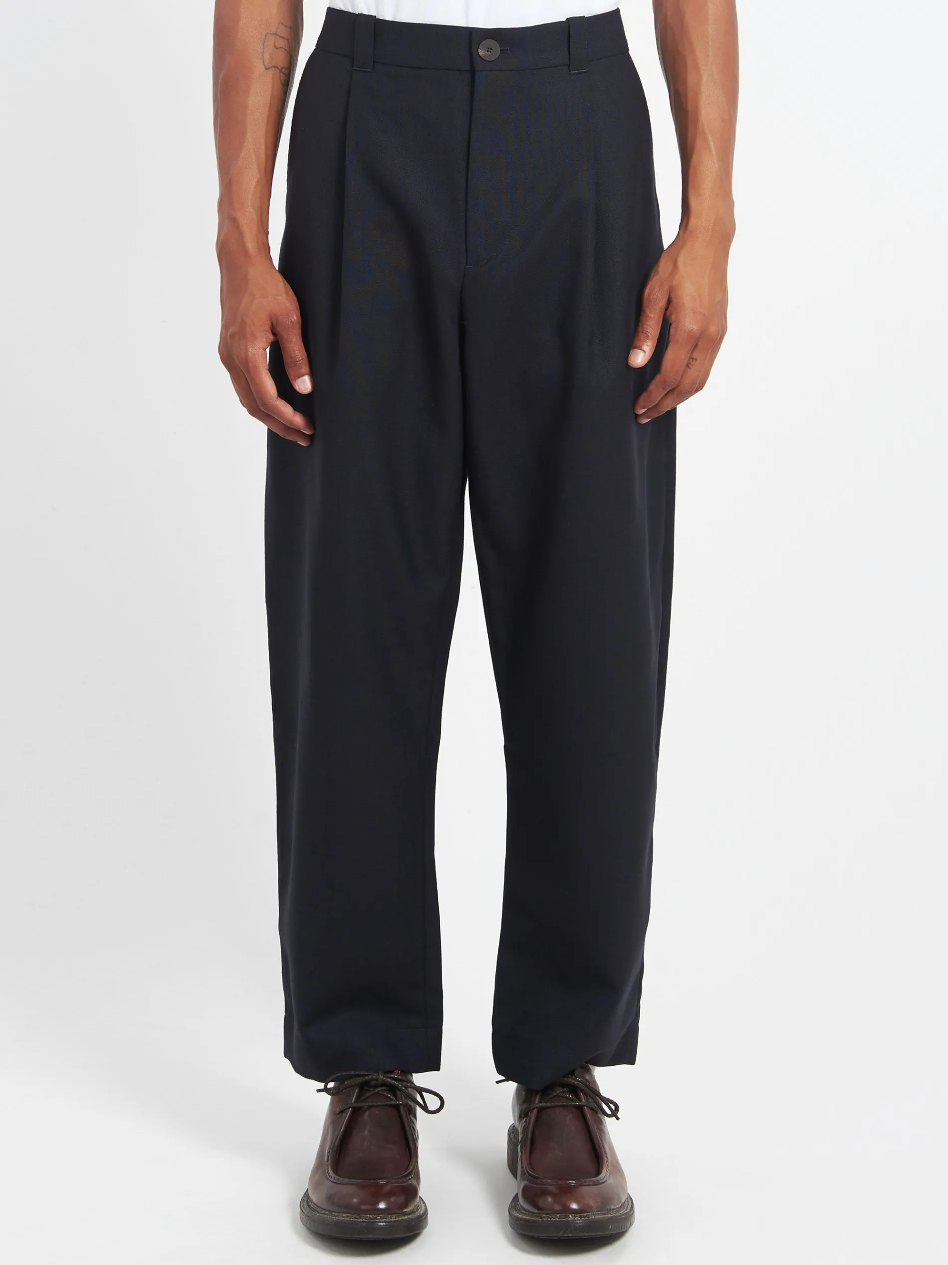 The Tuck pants have a cropped leg with a gently rounded shape. A single pleat front and mid-rise nod to traditional tailoring. They are cut from springy, airy tropical wool fabric.