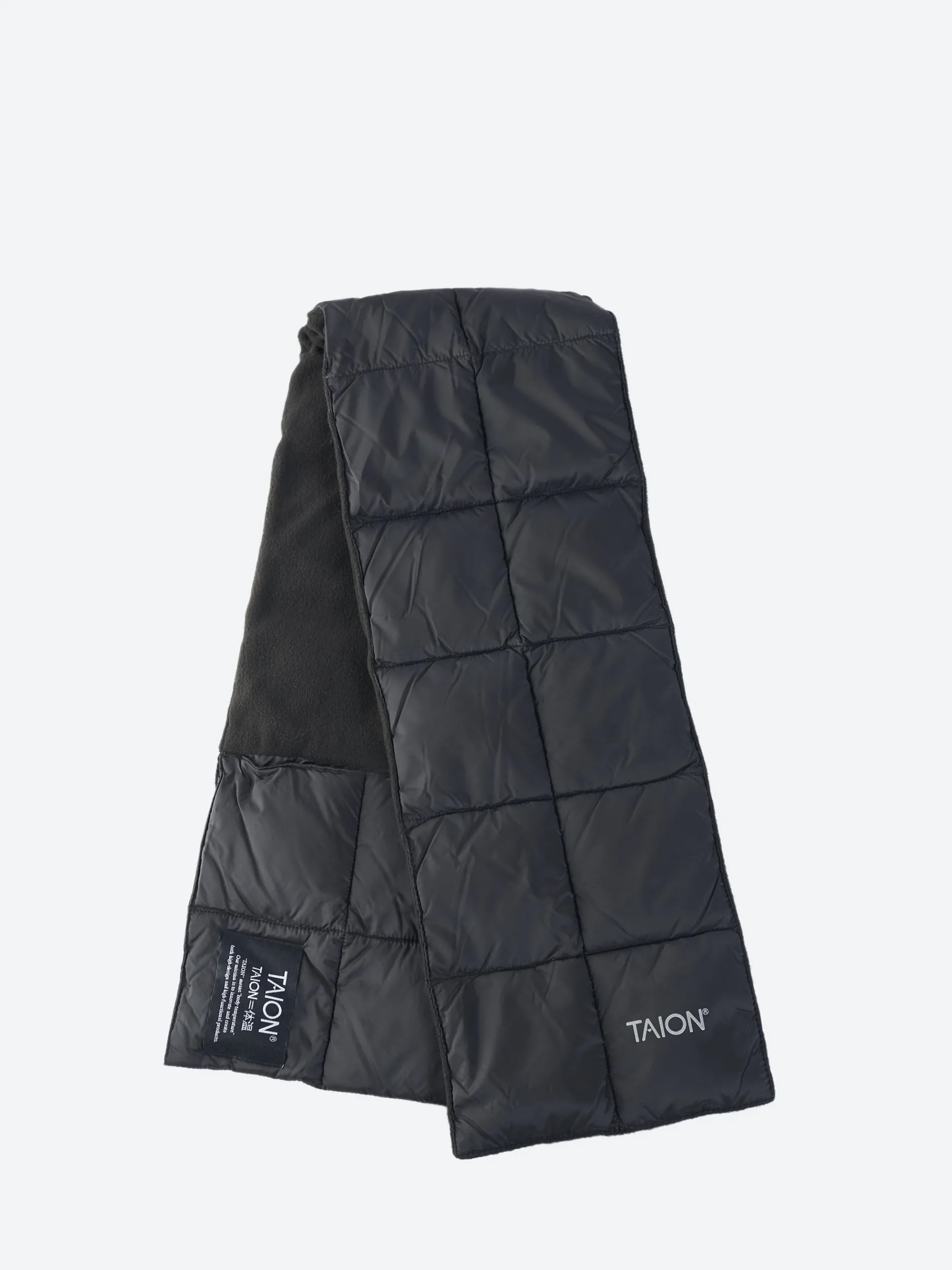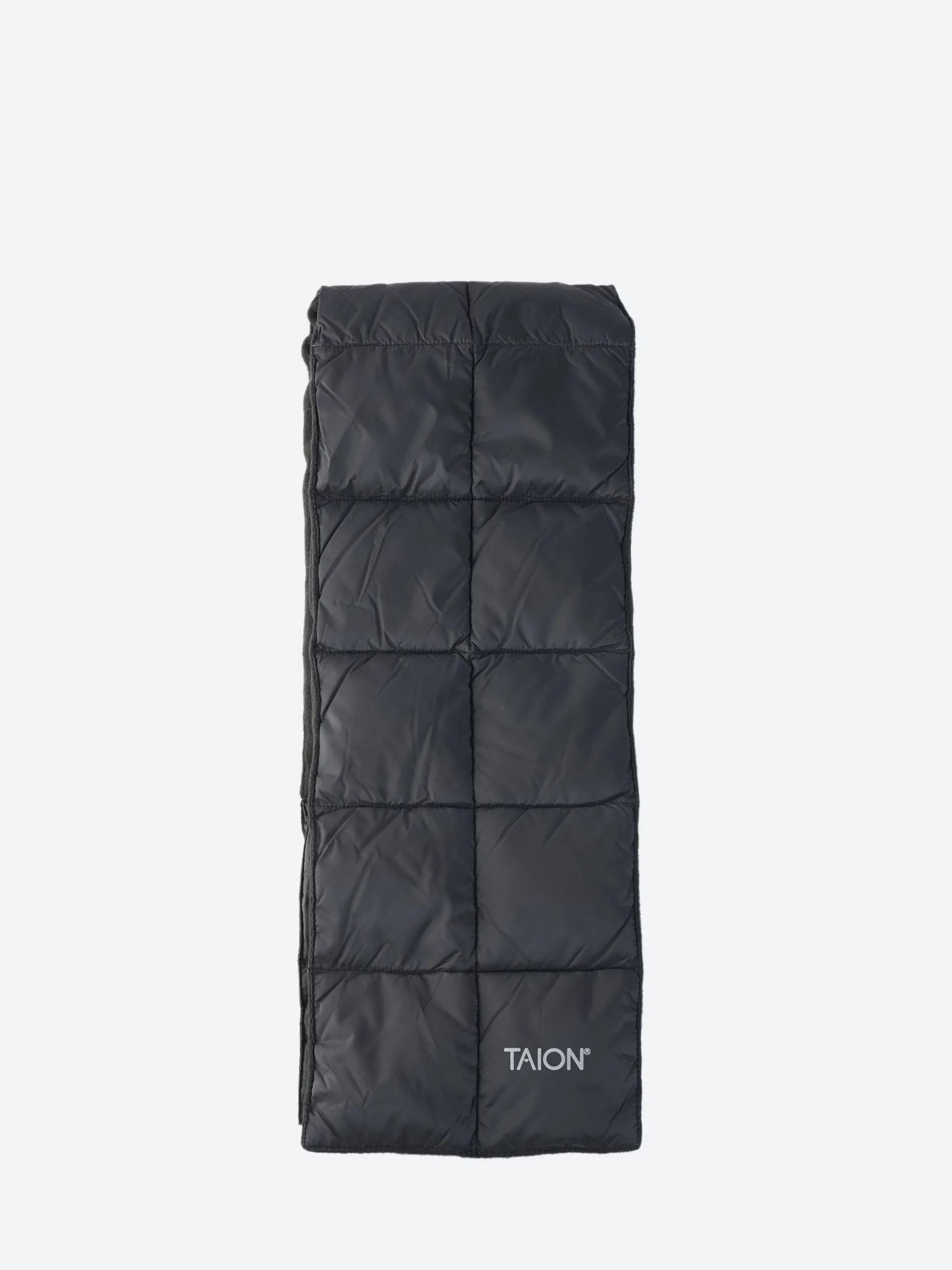 TAION down scarf with a fleece back side. Made from nylon taffeta with water-repellent treatment. It’s packable and perfect for going out or travelling.