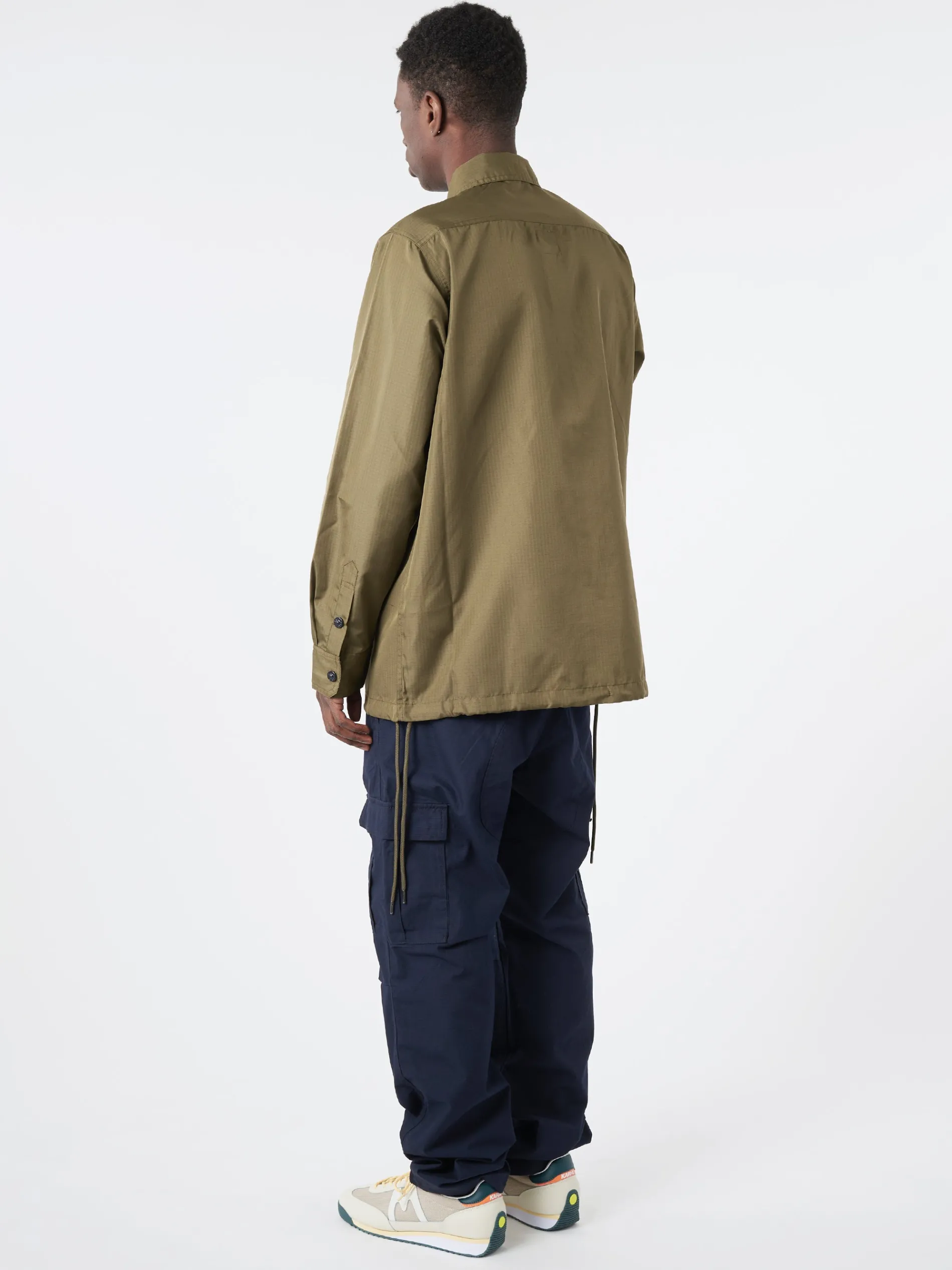 Military long sleeve shirt made from a 5mm square ripstop fabric. The strings visible from the left and right side hems can be hung or tied, and the width and length can be adjusted.