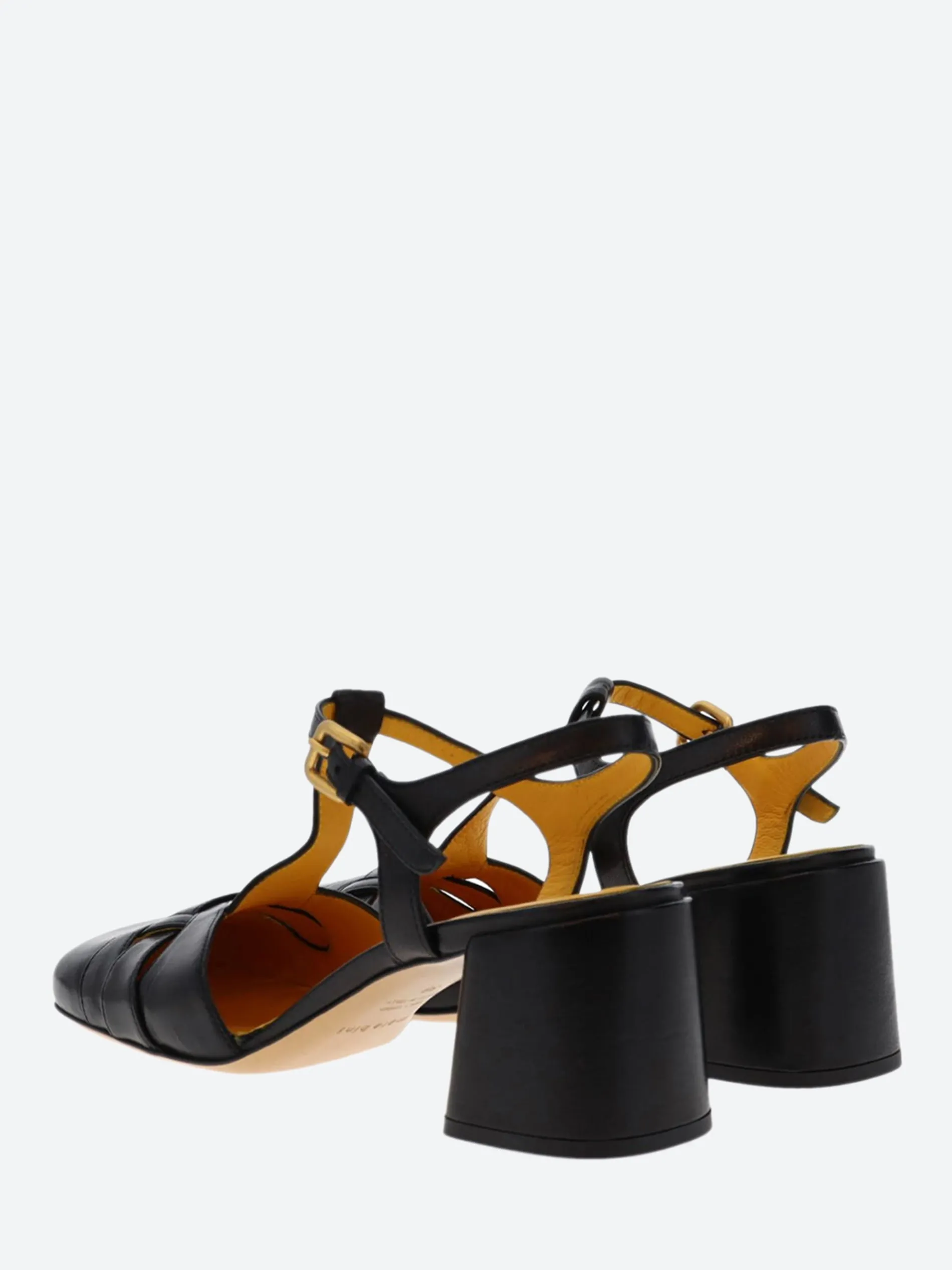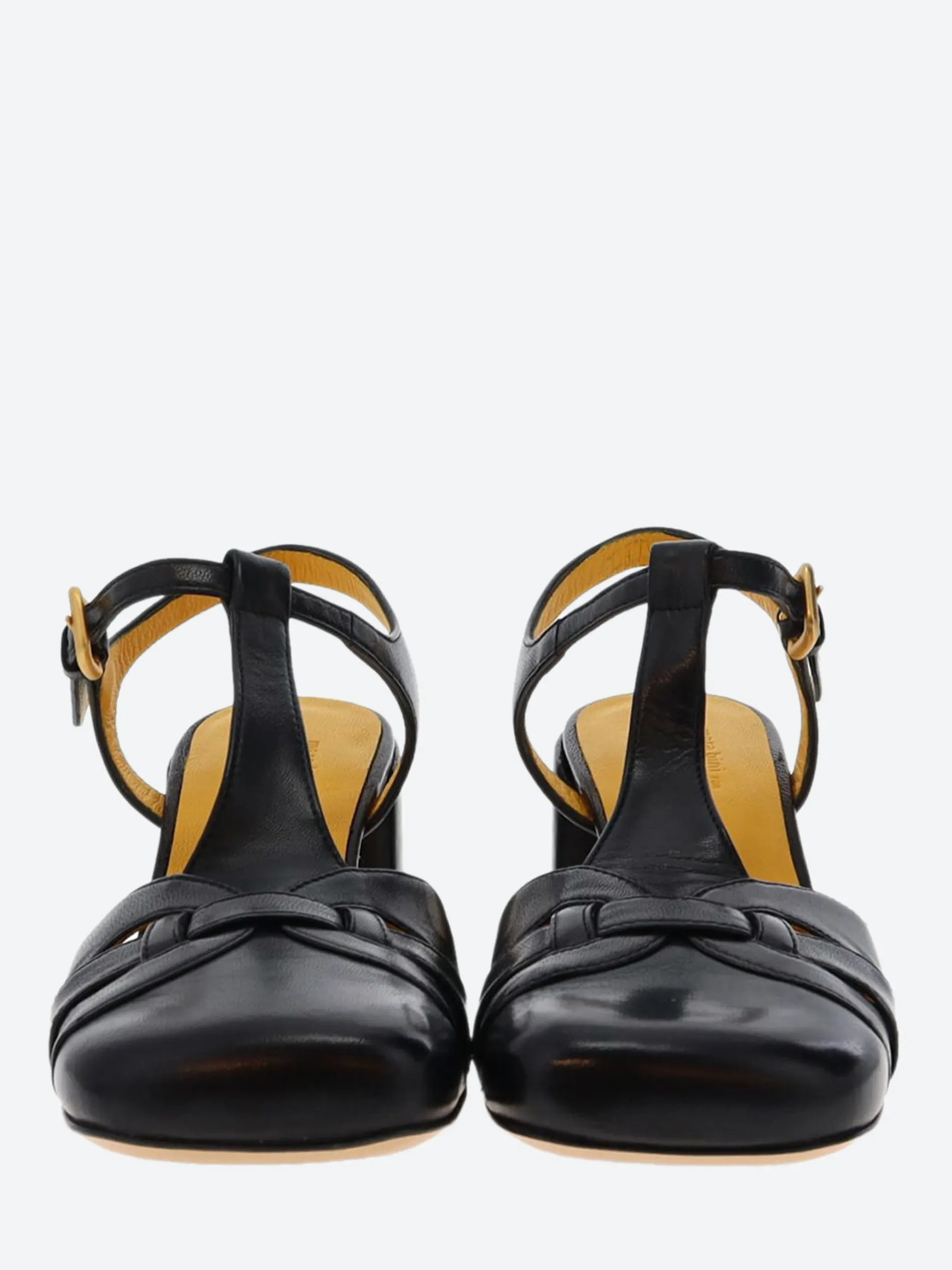 - Adjustable T-strap with gold-tone buckle