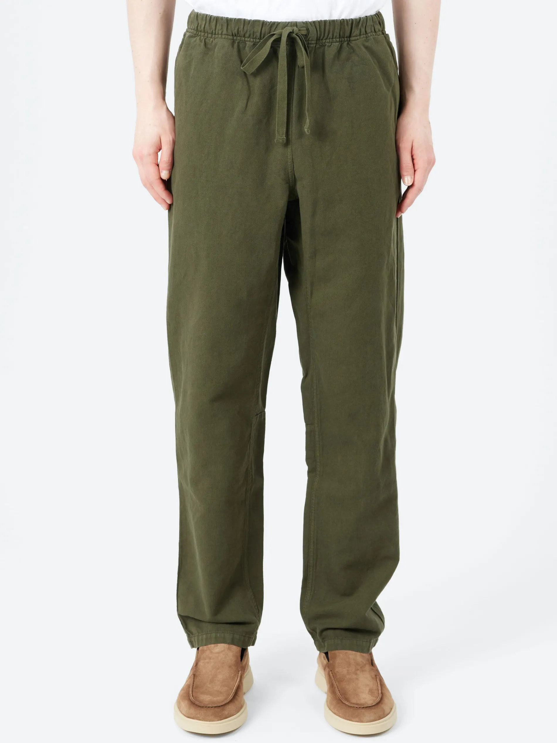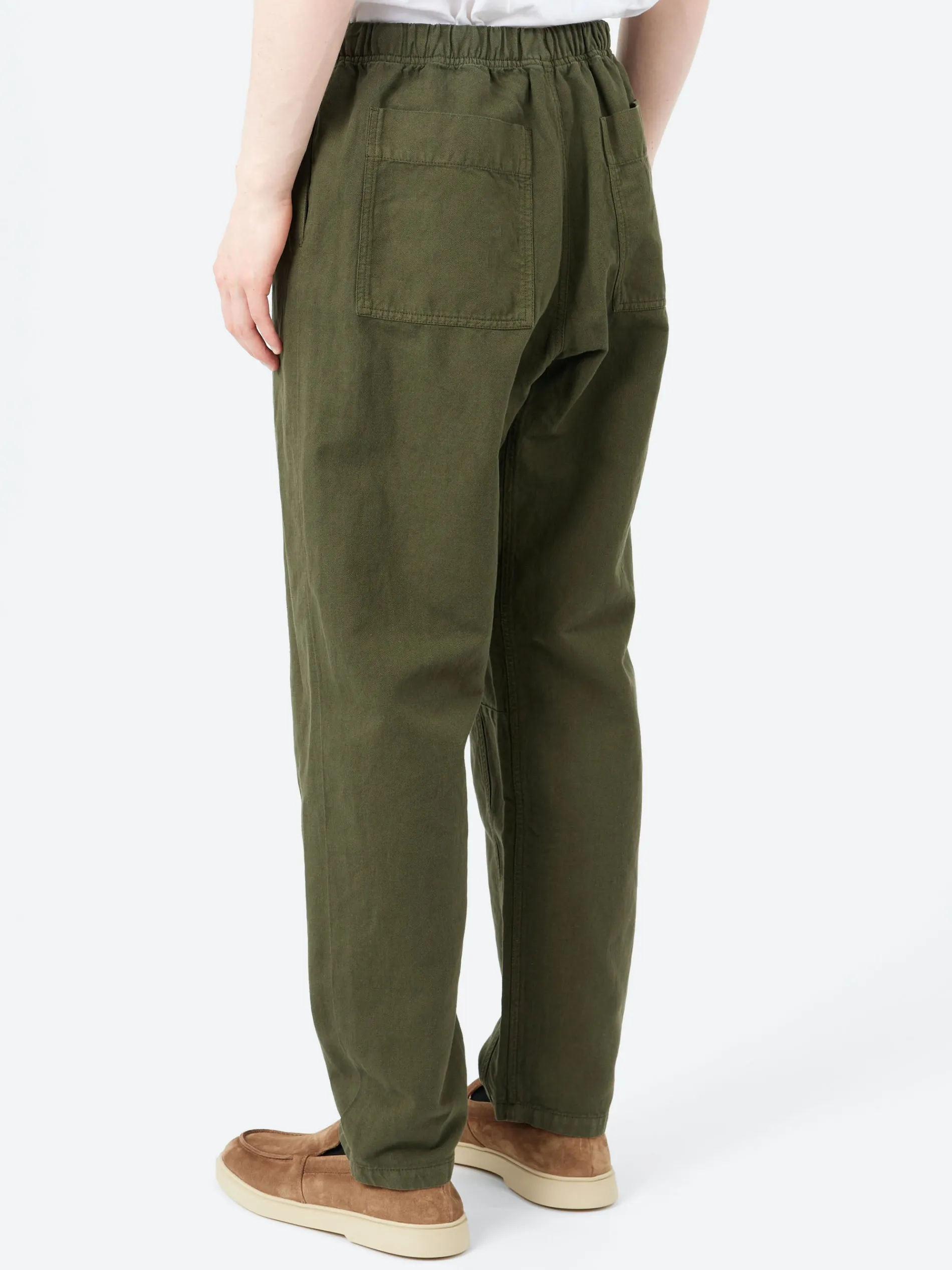 Alfie trousers are made from supple herringbone woven in Italy, which is garment-dyed, a process which gives each piece a unique texture and natural color variation. Shaped with an elasticated drawstring waist for comfort, falling to tapered legs with inner panels, then finished with back patch pockets.