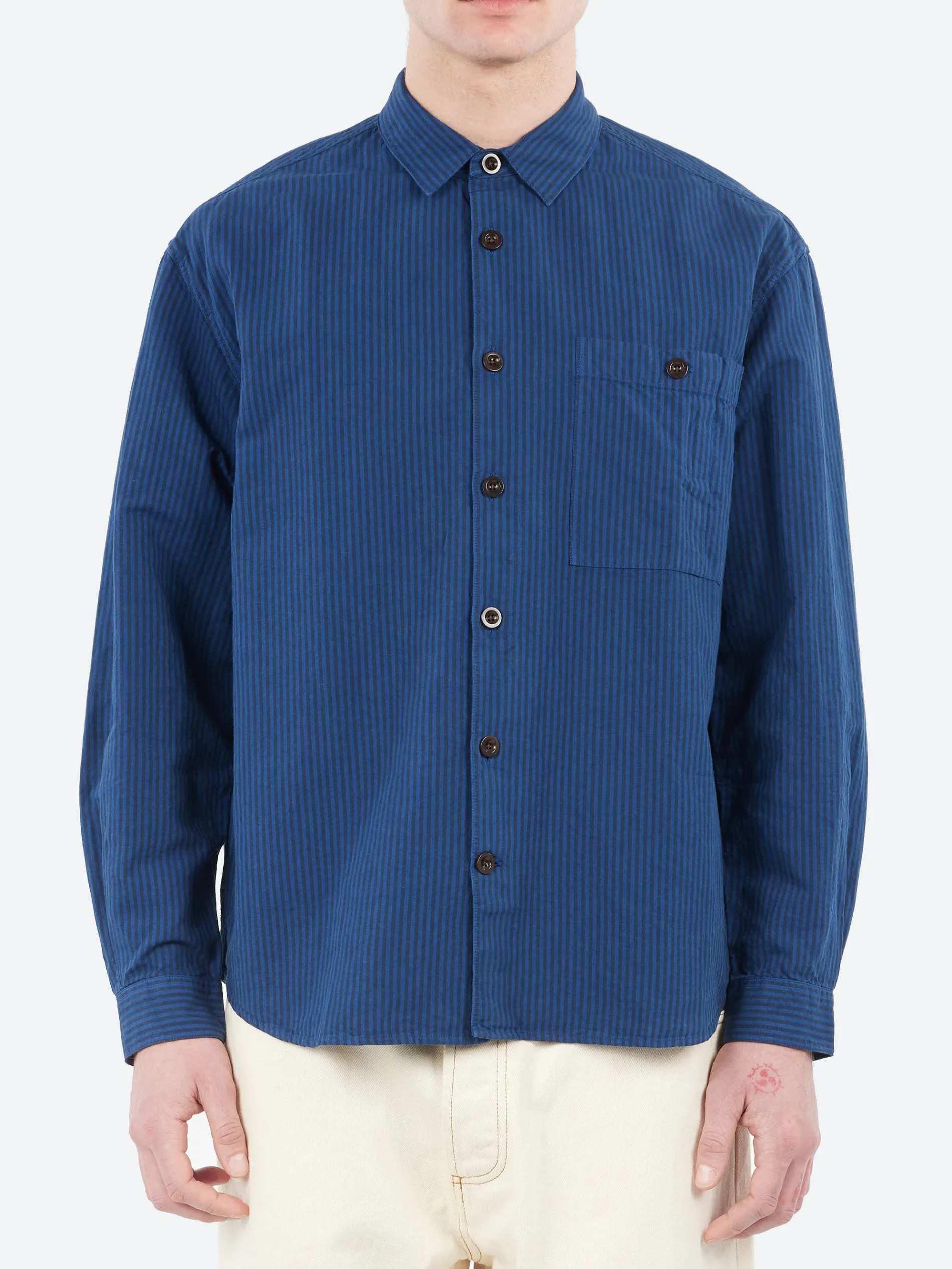 TOAST striped cotton and linen shirt is overdyed as part of the garment-dyeing process and accented by workwear-inspired stitching. Cut to a relaxed shape with a single patch pocket featuring a vertical knife pleat.