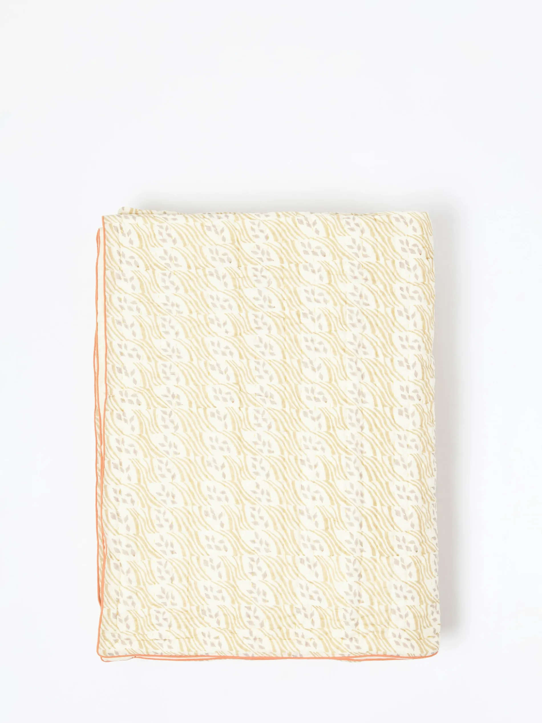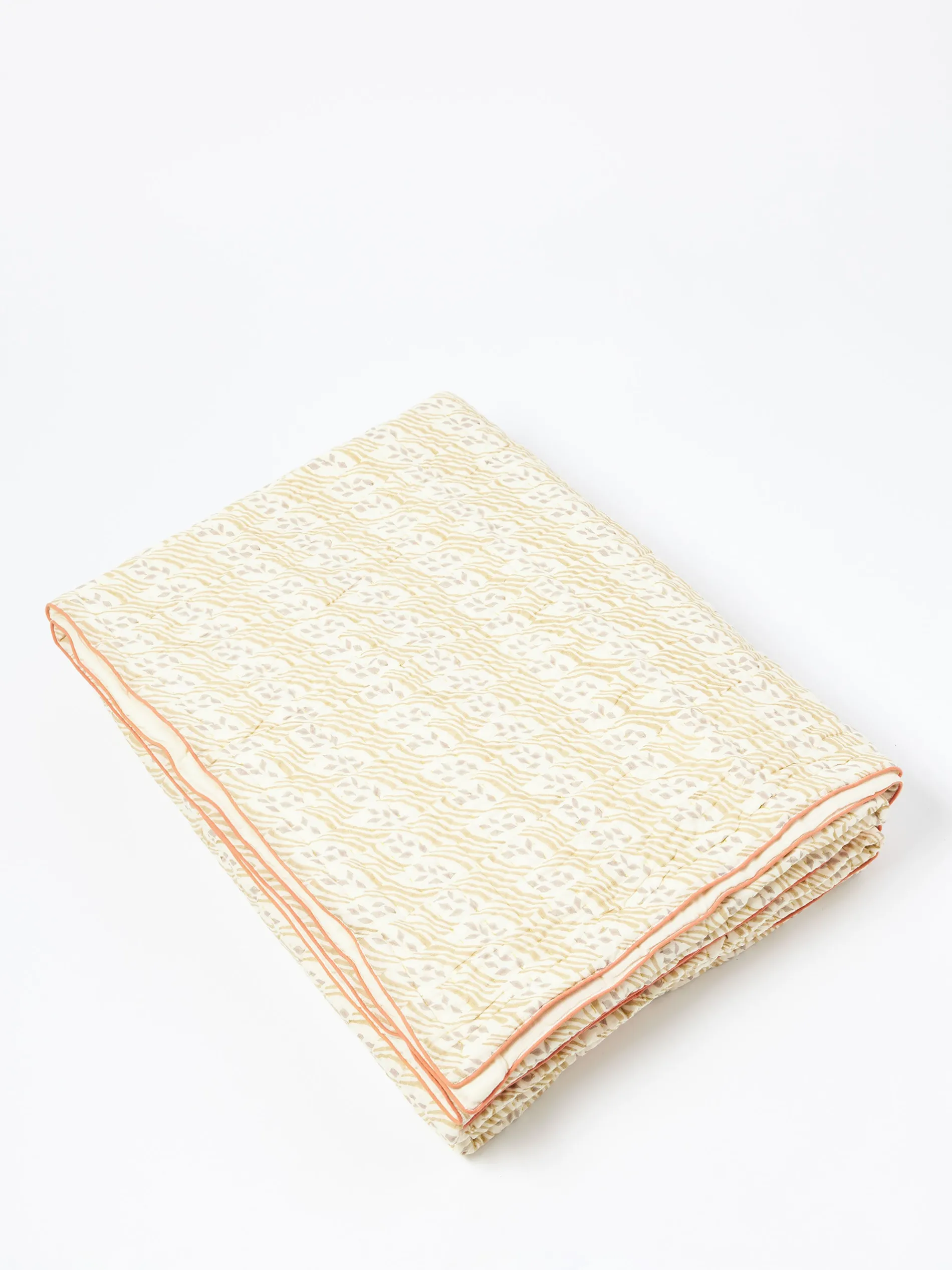Soft cotton quilt hand block-printed by artisans in Jaipur. Filled with cotton wadding, then hand-stitched. With a plain cotton reverse and contrasting piped edge.