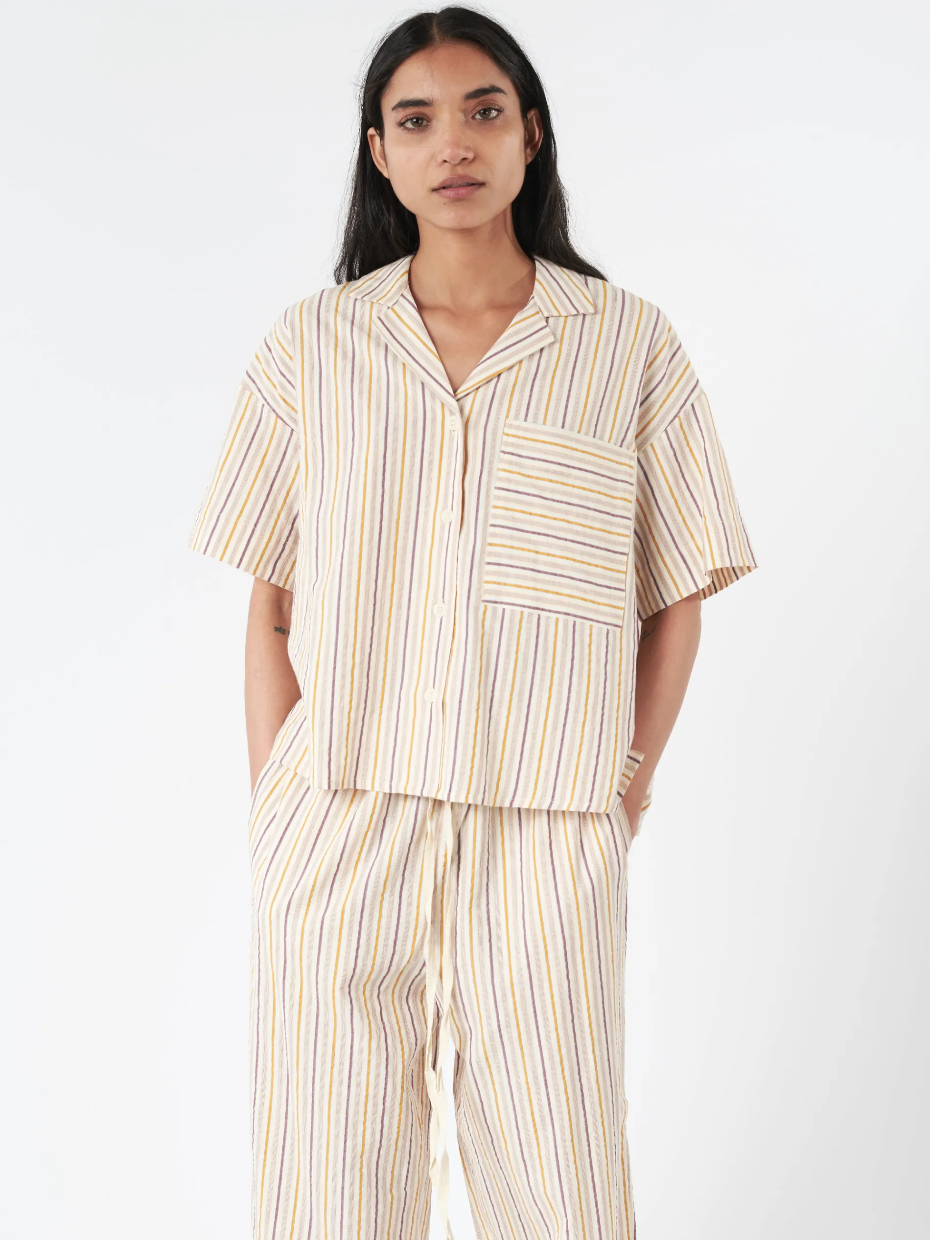 An oversized shape underscores the nostalgia behind TOAST’s Scout stripe cotton pyjamas.
