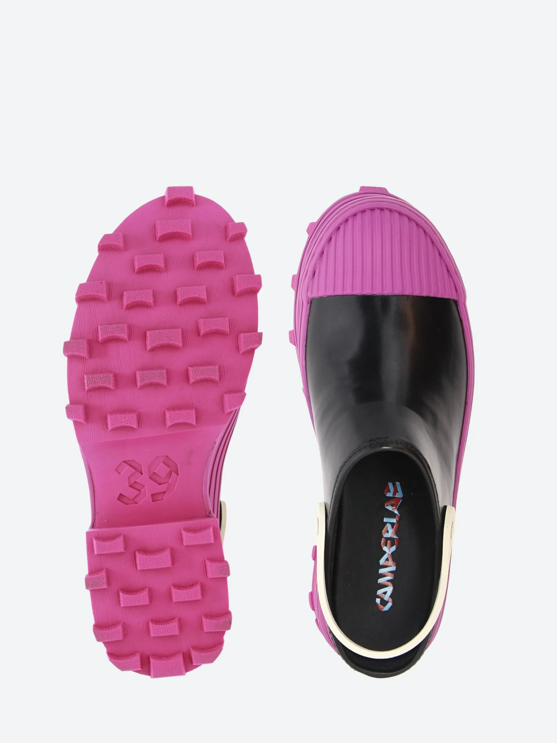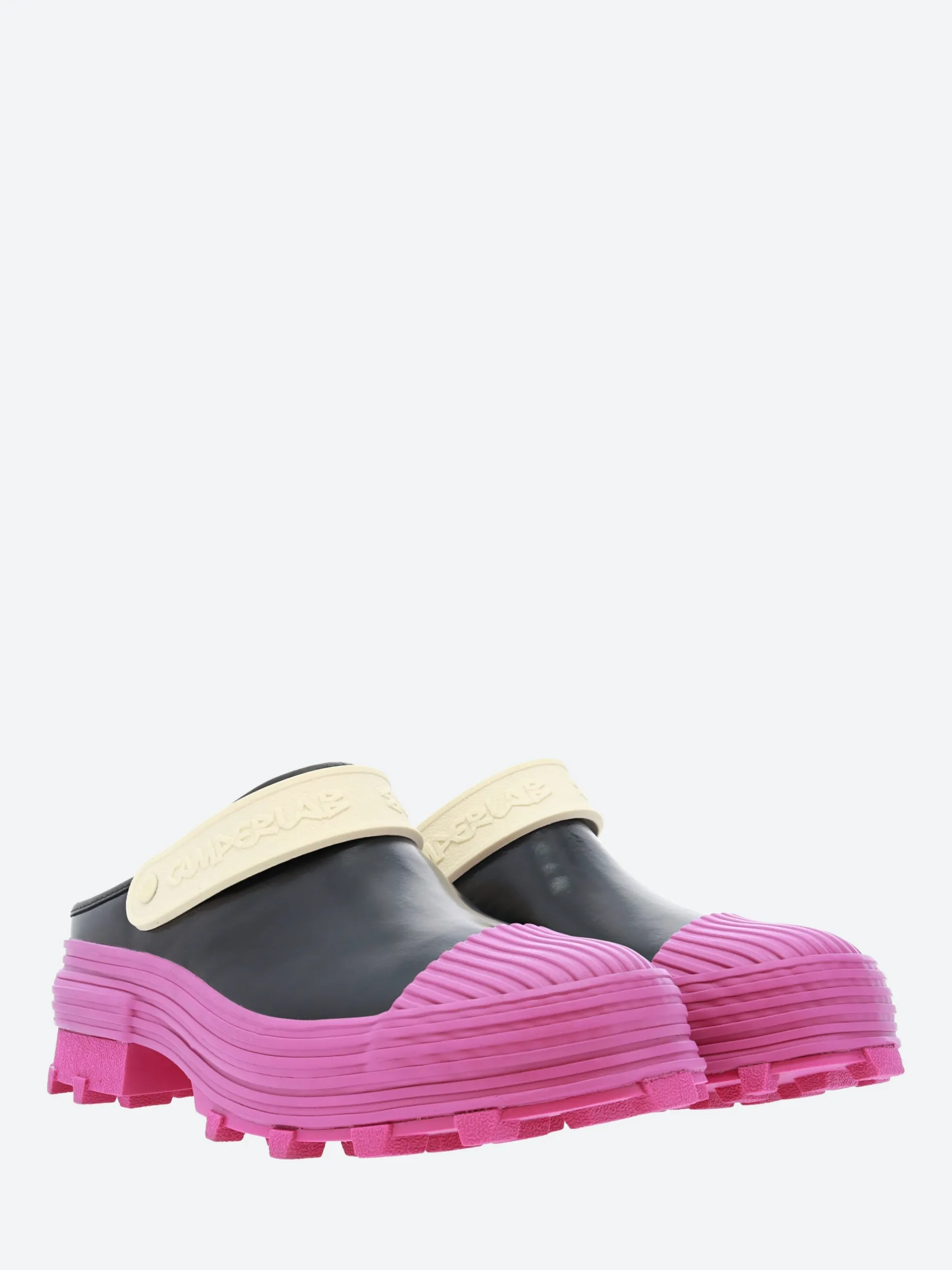 CamperLAB vulcanized leather clogs with slingback straps and toothed rubber outsoles.