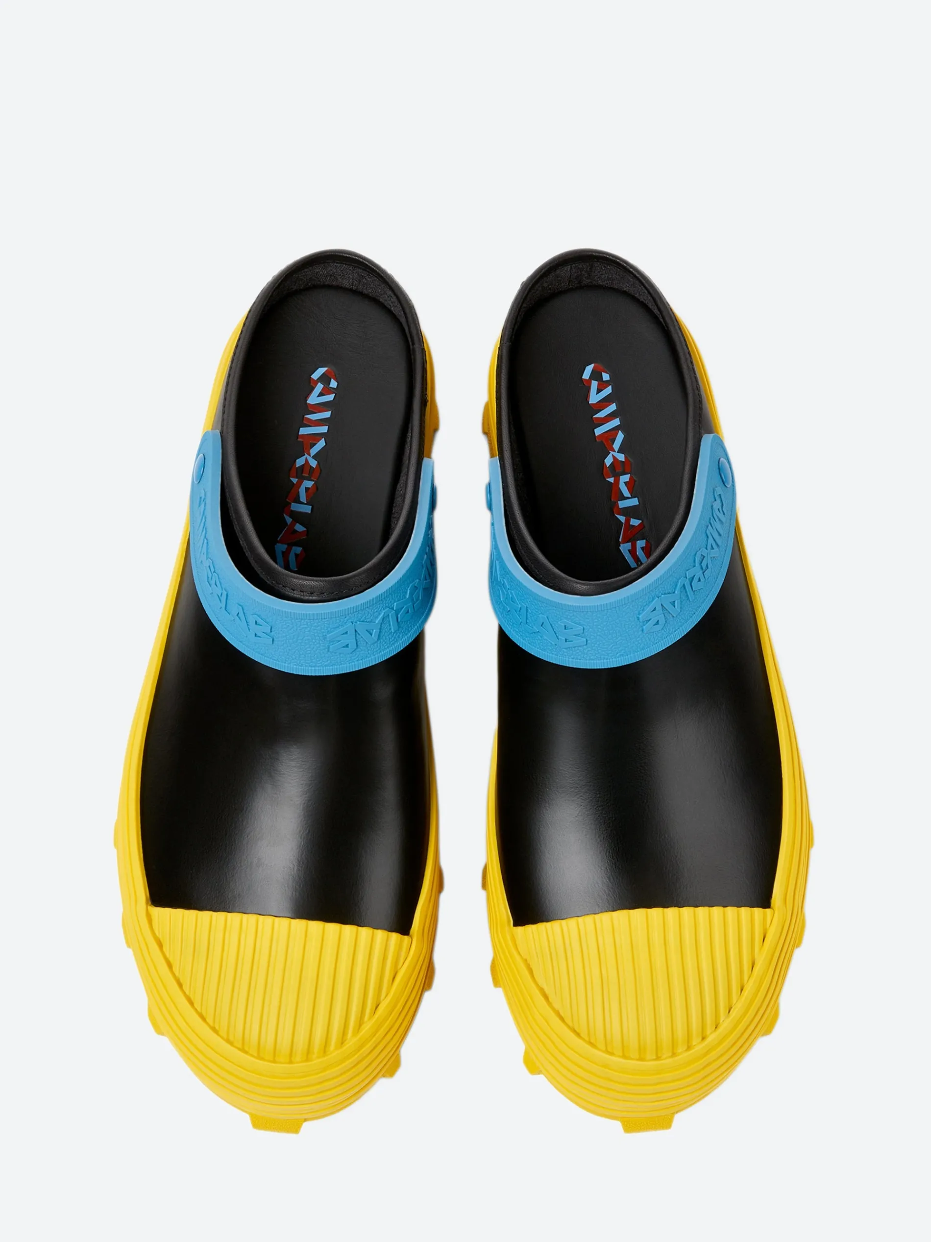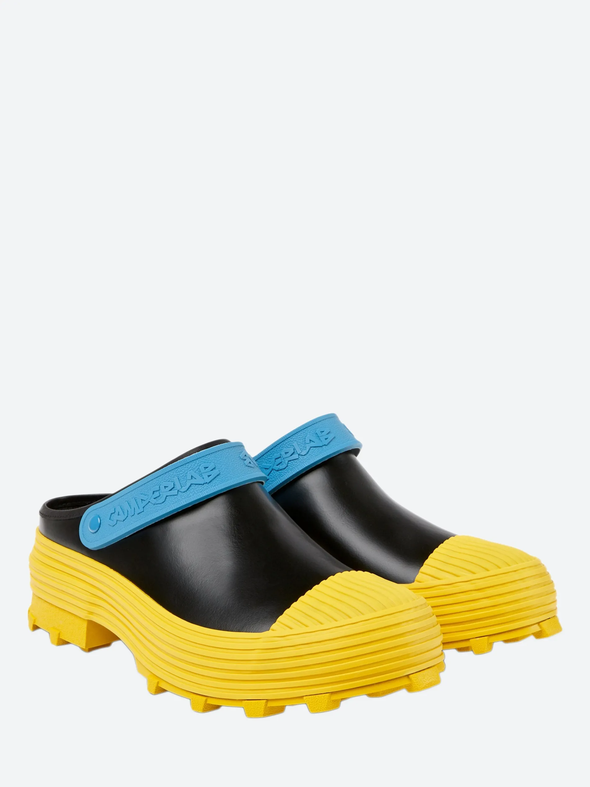 CamperLAB vulcanized leather clogs with slingback straps and toothed rubber outsoles.