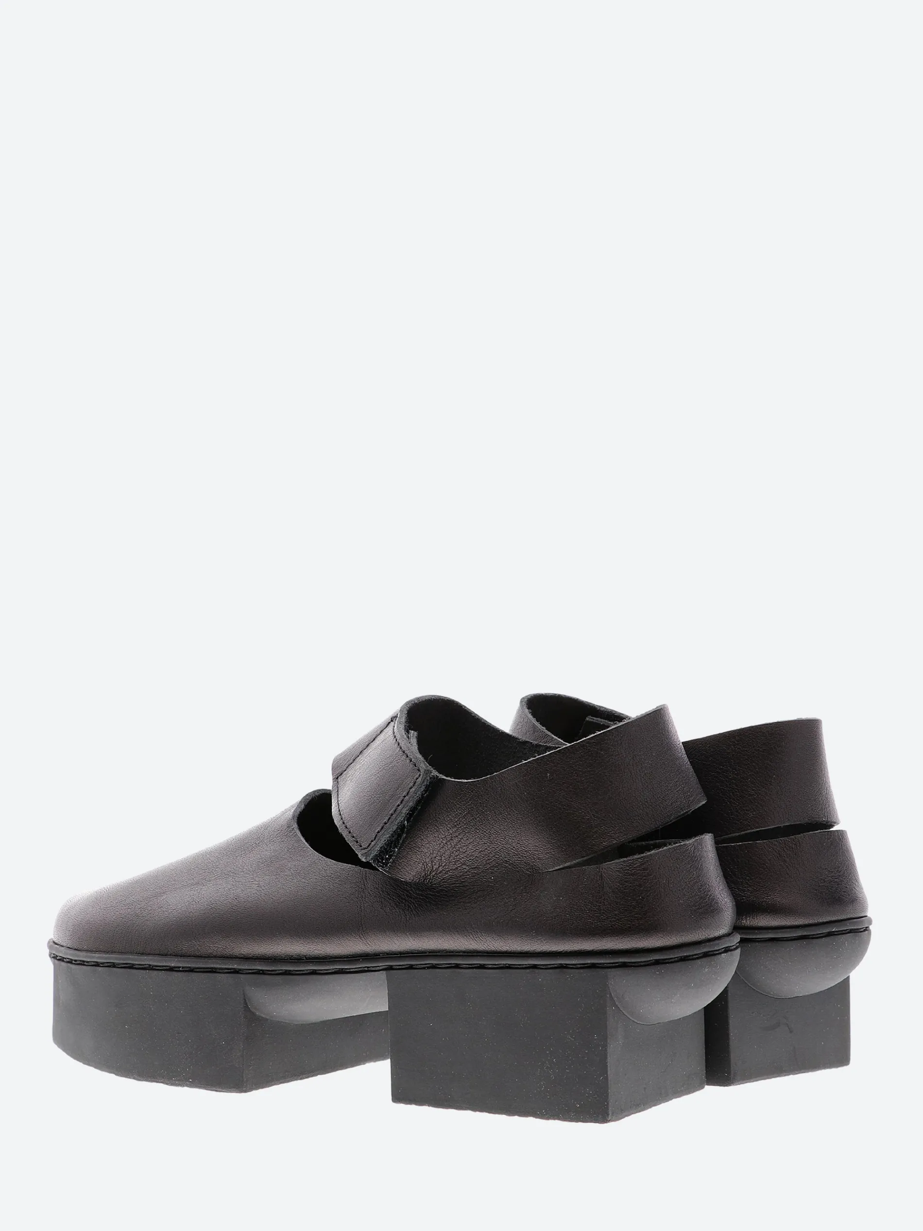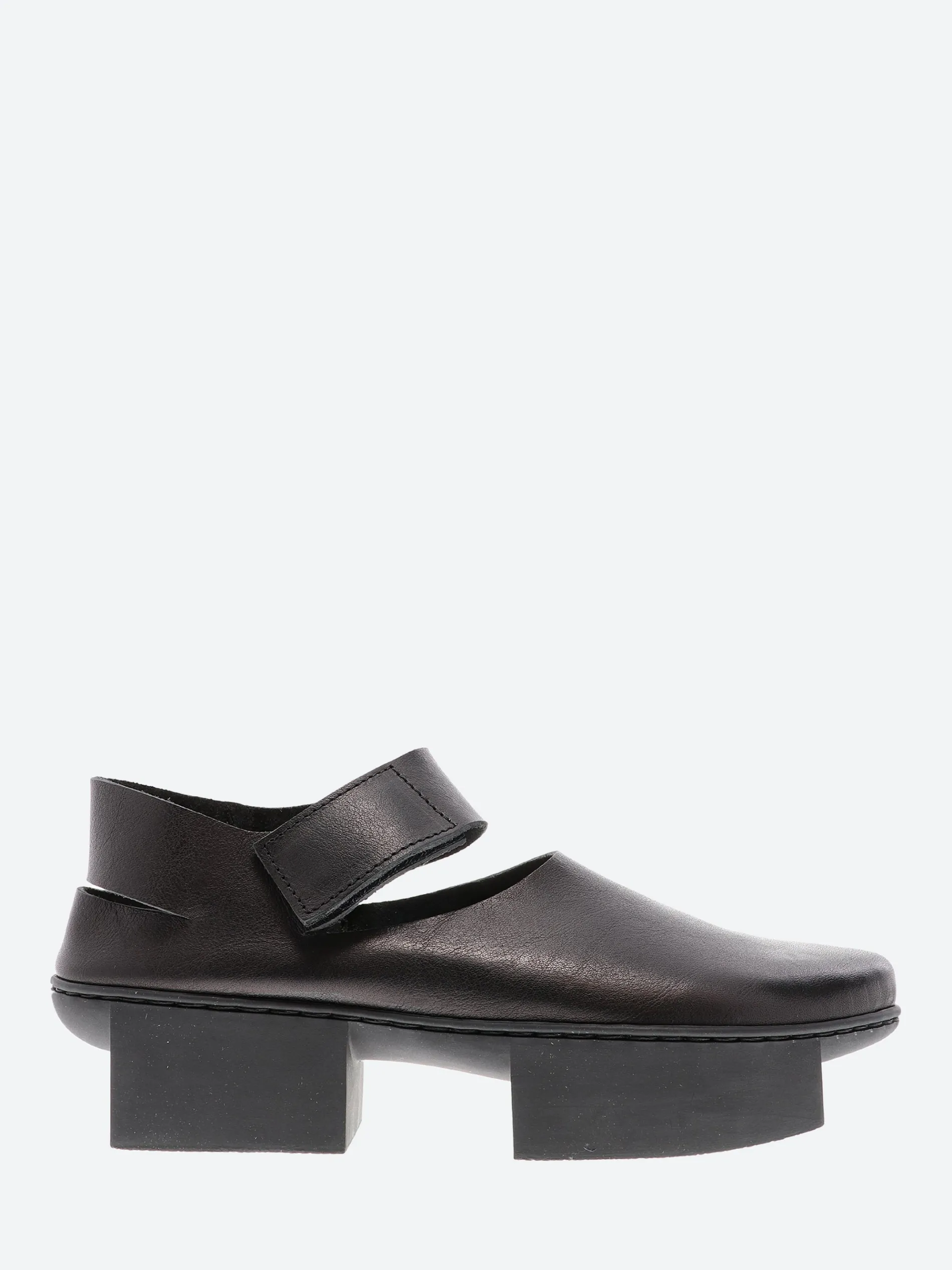 Simple low-cut shoe with exterior Velcro fastening, whose harmoniously balanced contours simultaneously form attractive slits over the foot and at the heel.