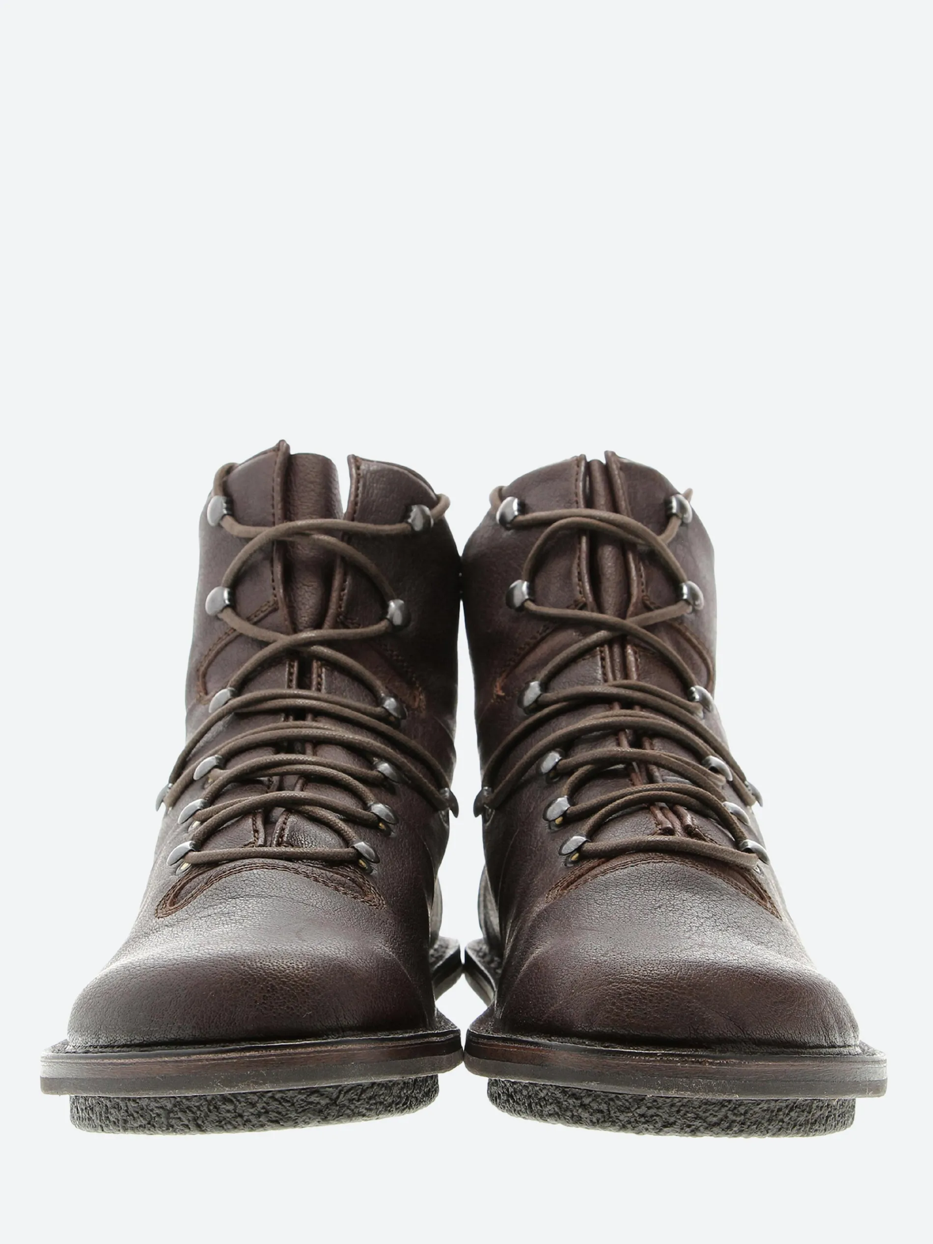 Trippen lace-up boot featuring hooks and eyes in the style of classic mountain boots.