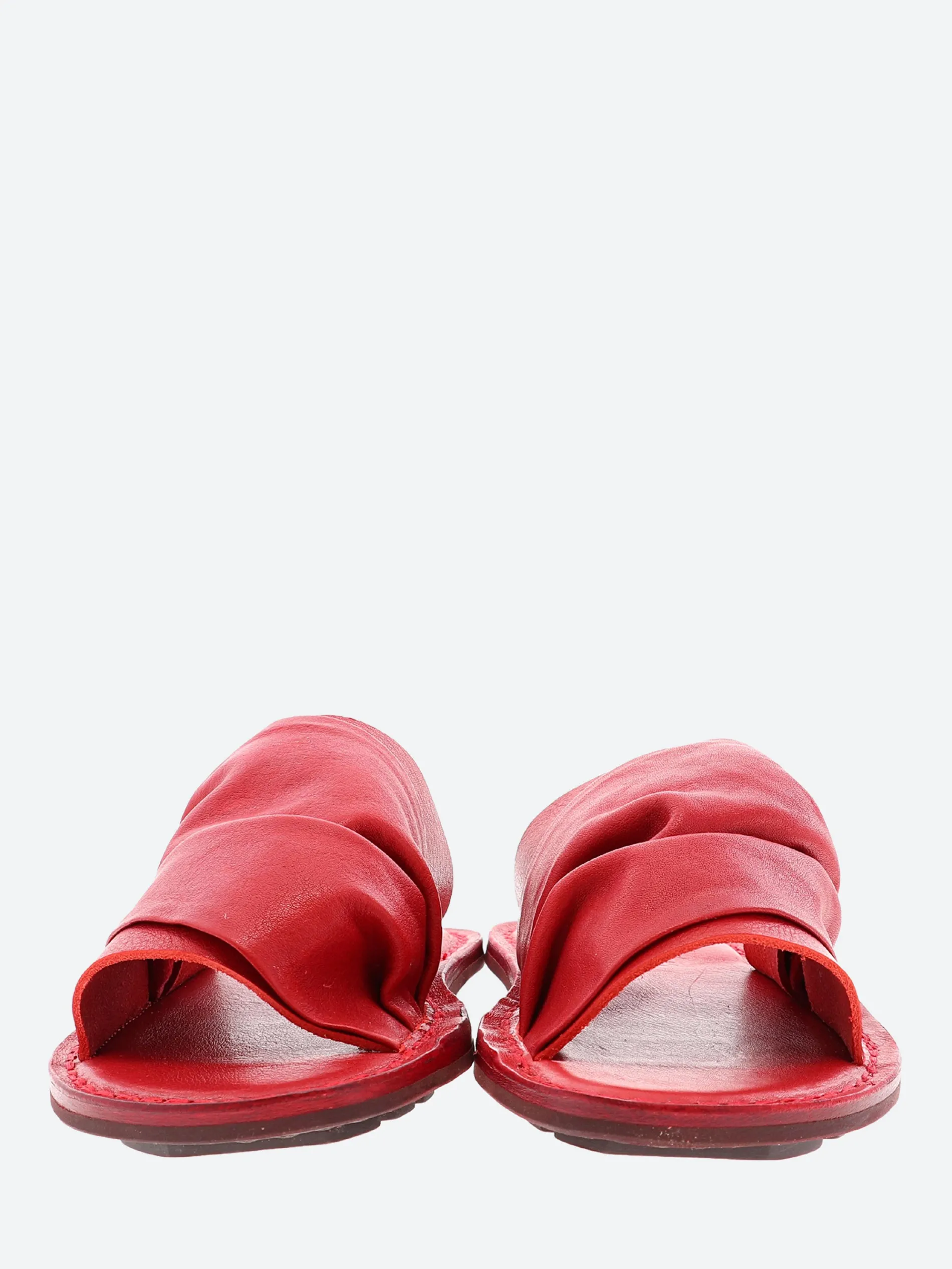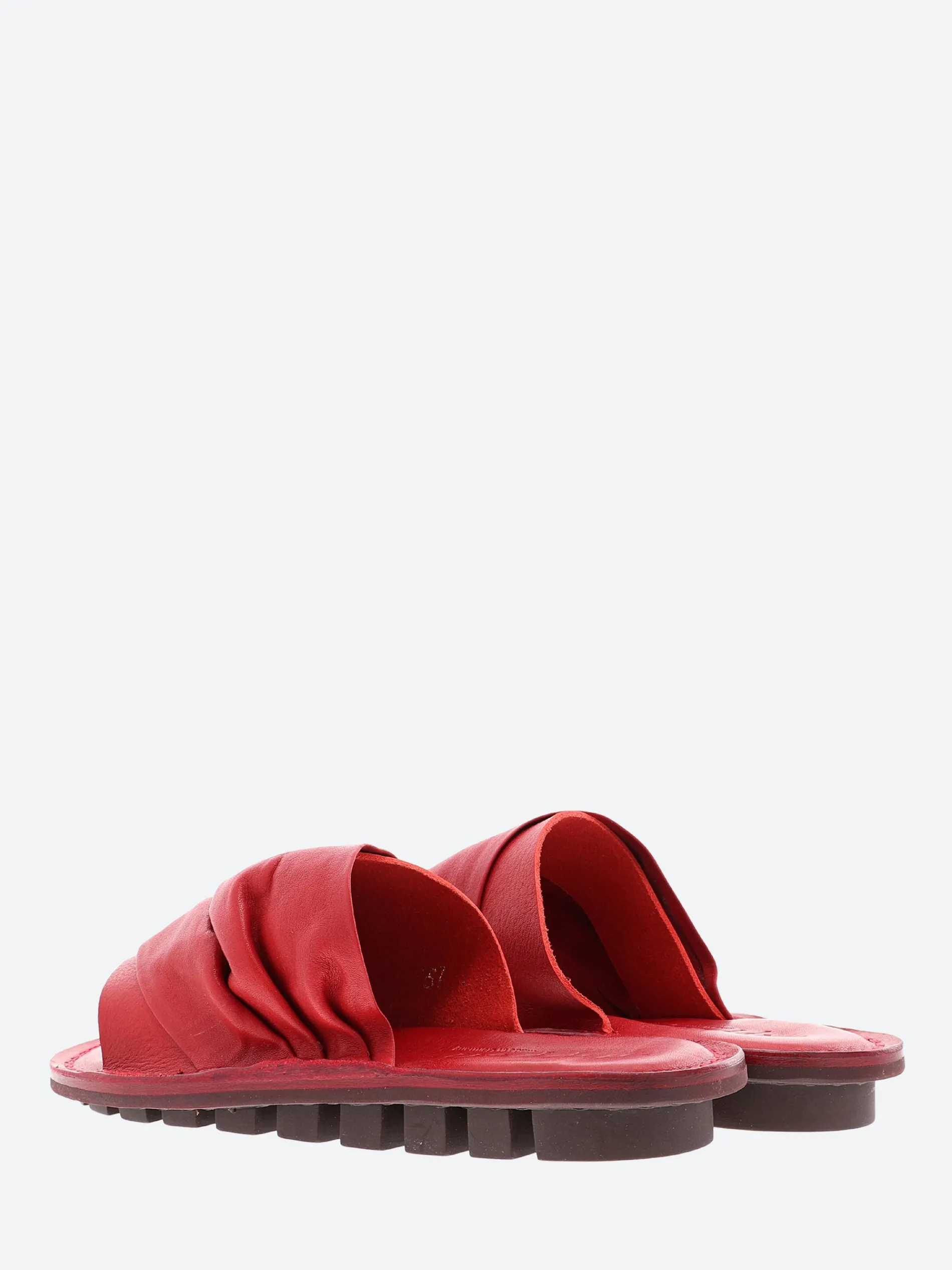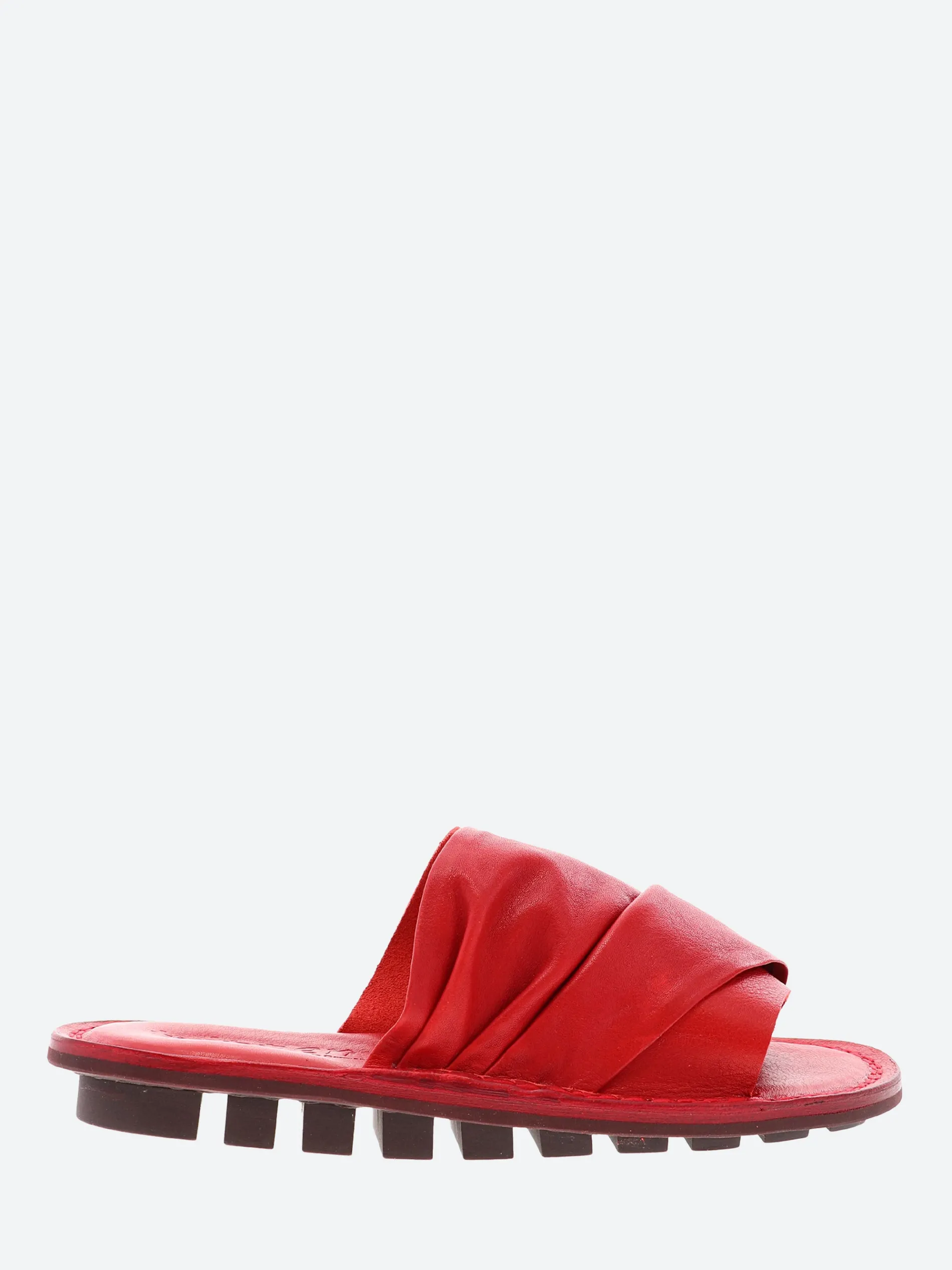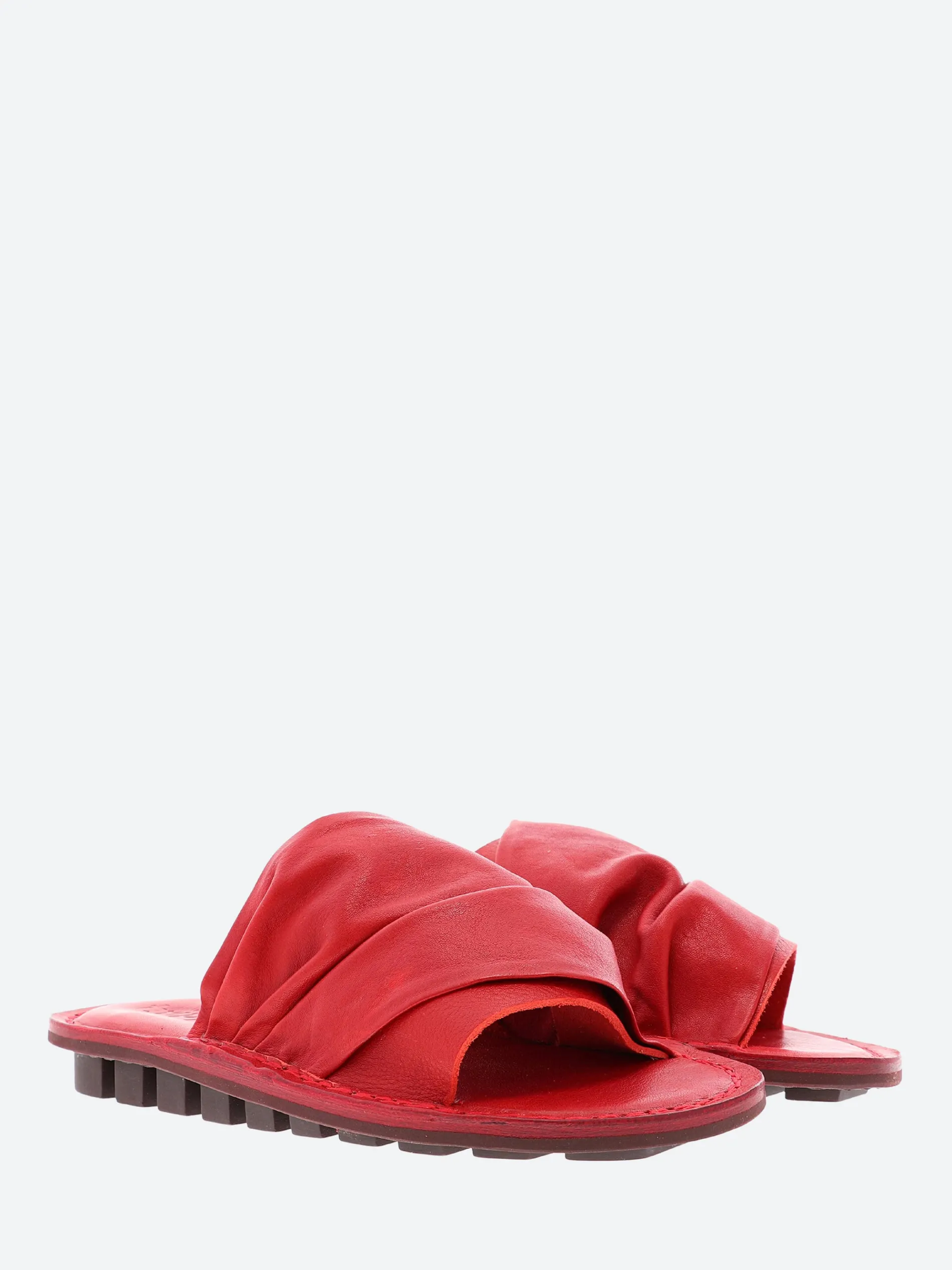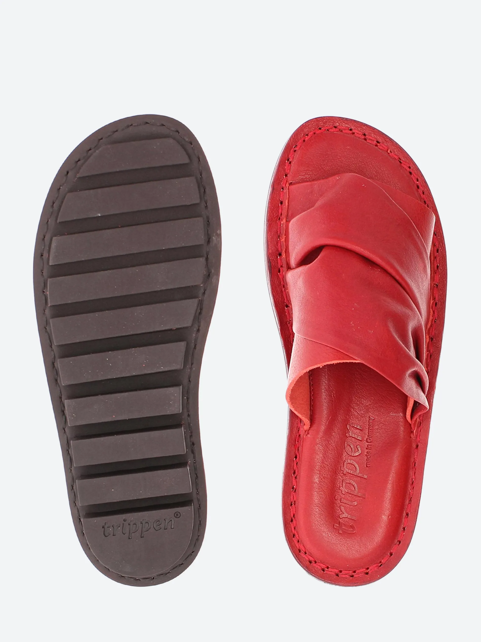 Trippen Drift slip-in sandal. Two straps made of sturdier leather over the instep give support, while the placed strip made of softer leather forms gentle waves.