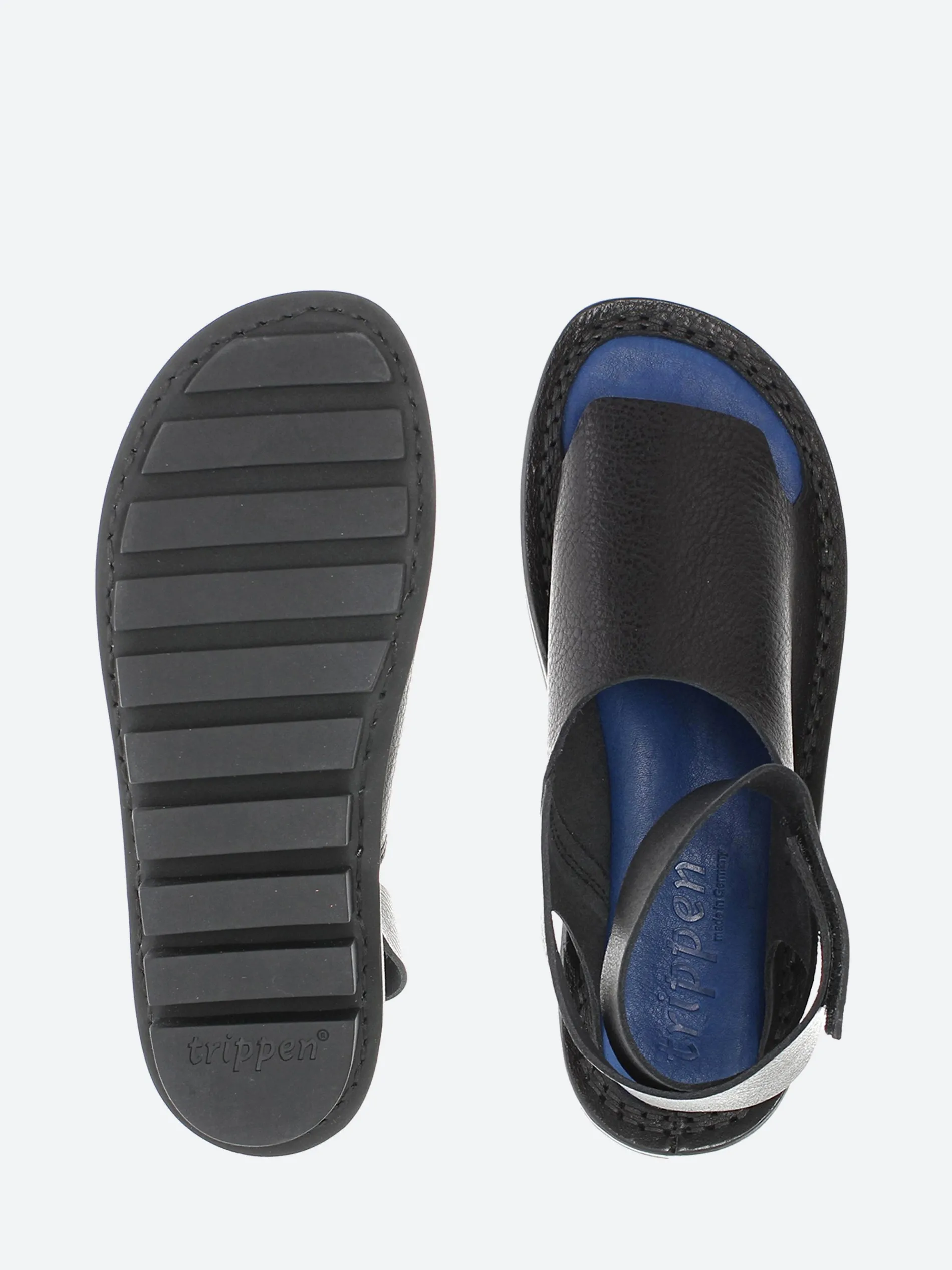 Trippen Hug is a minimalist, feminine version sandal featuring a relatively wide Velcro strap running around the ankle and offering additional support.