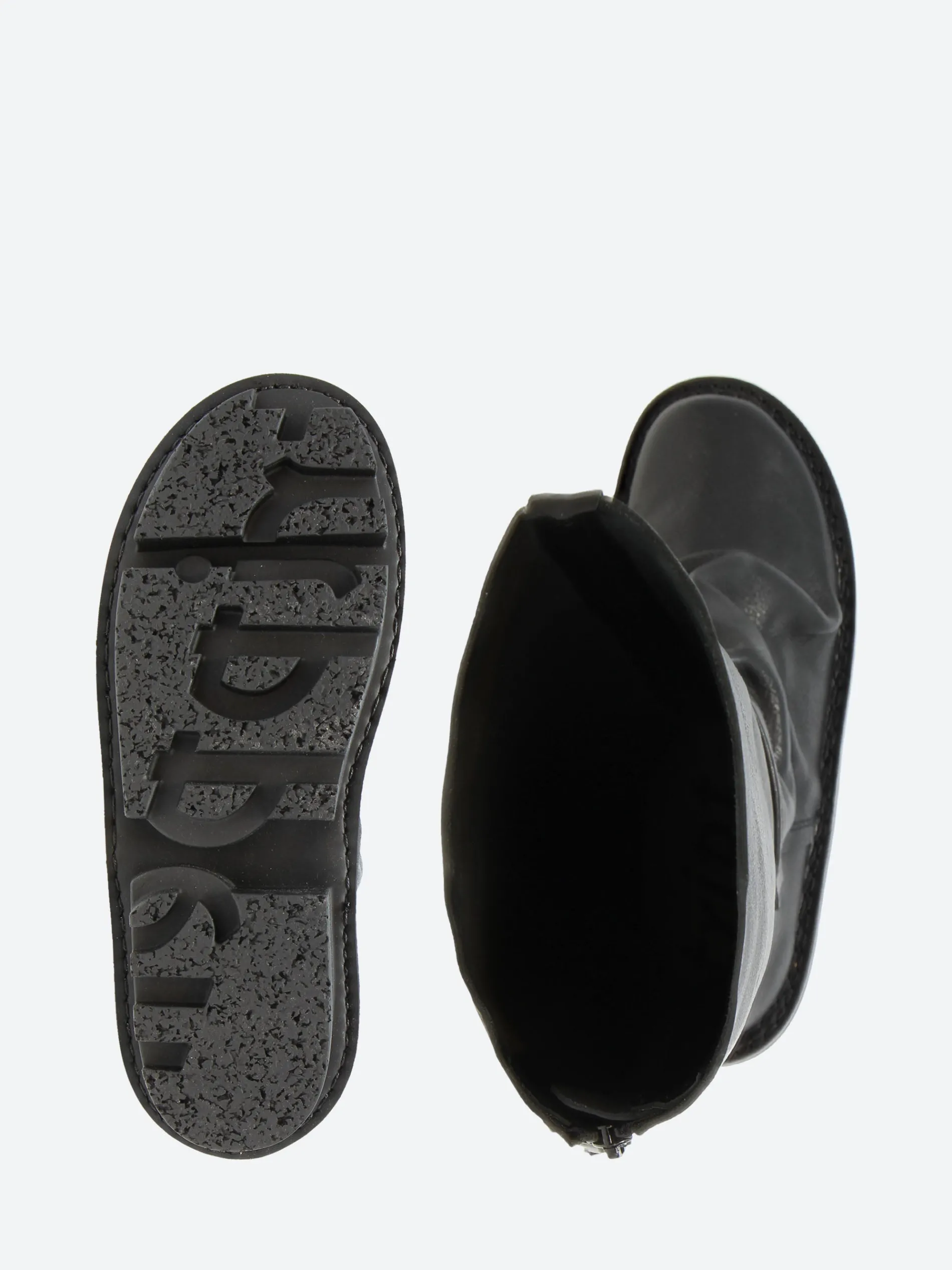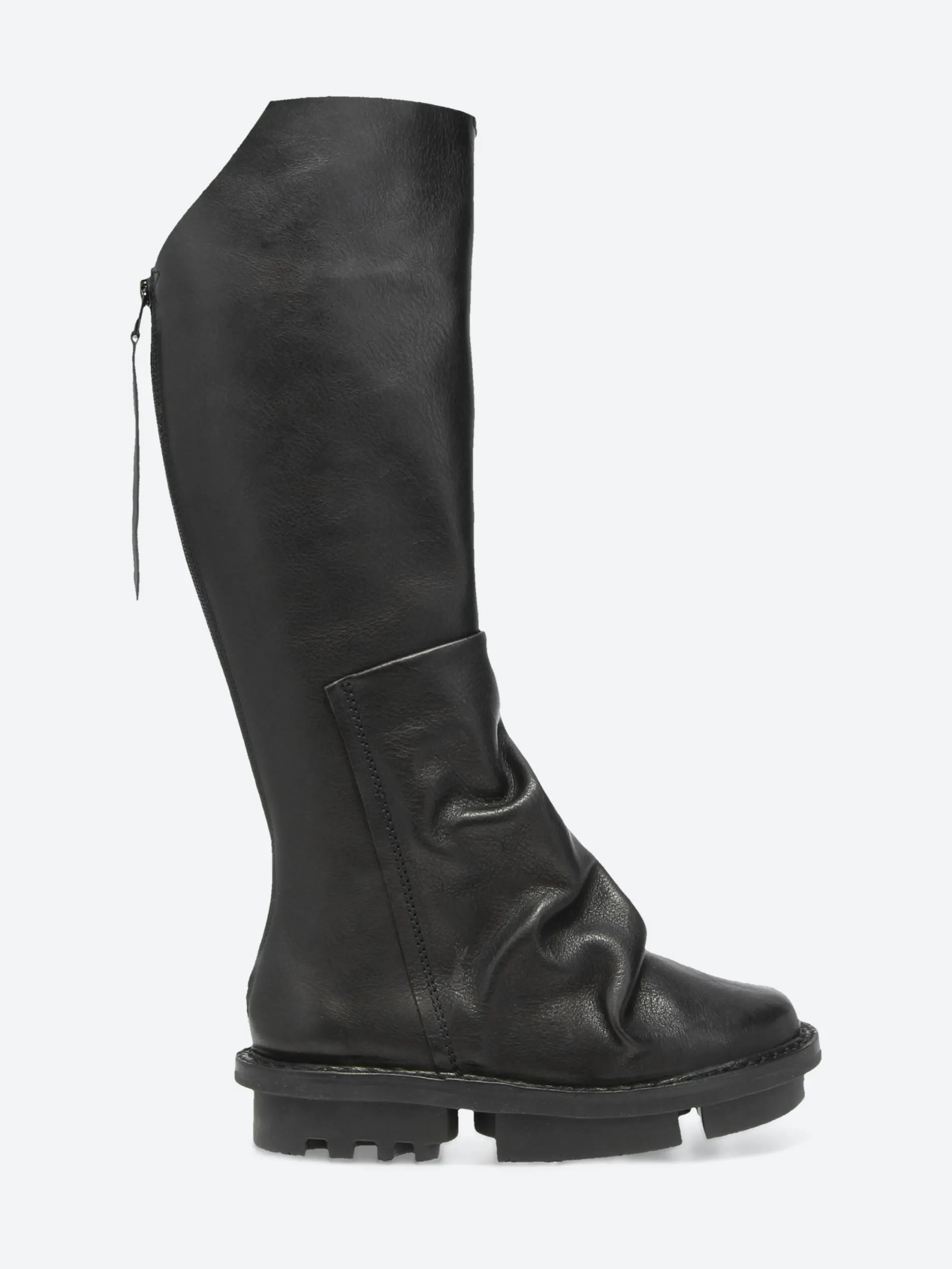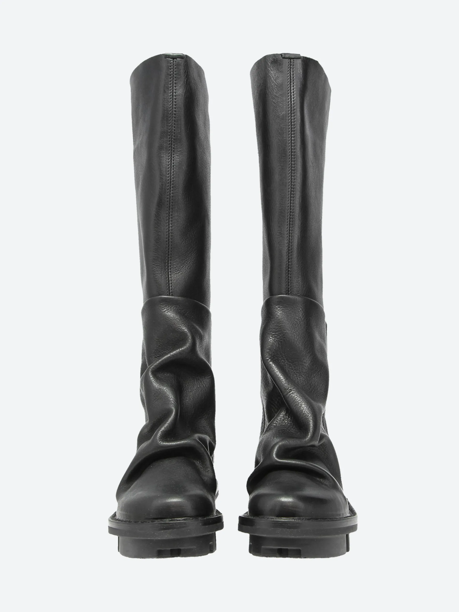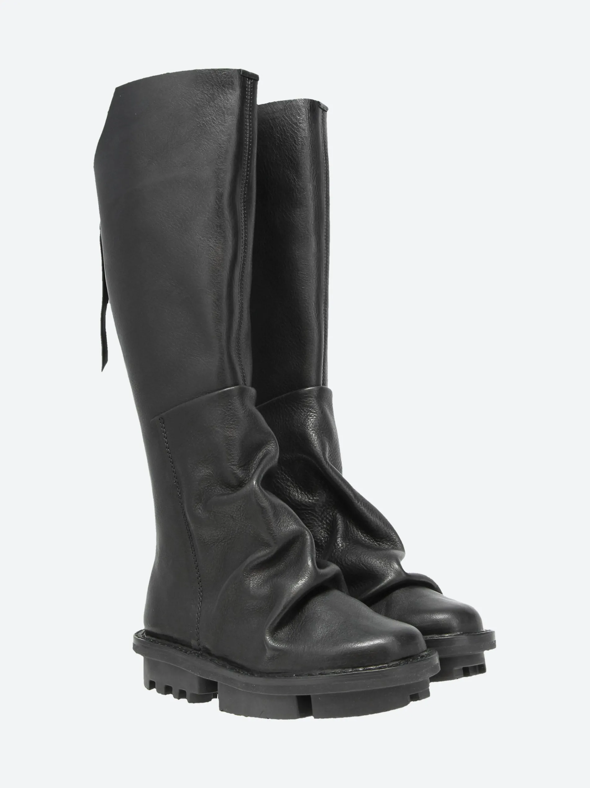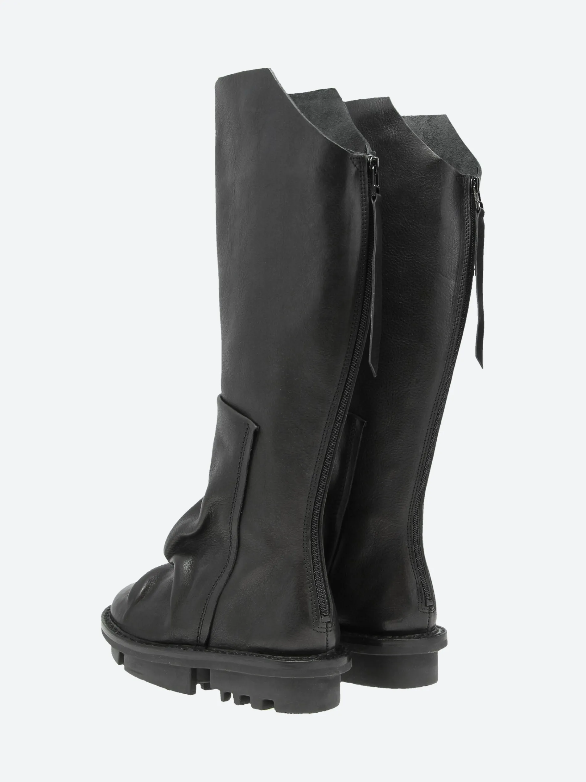 Skyline features a voluminous panel of leather stitched over the instep, completing this knee-high, geometrical boot’s dramatic design.