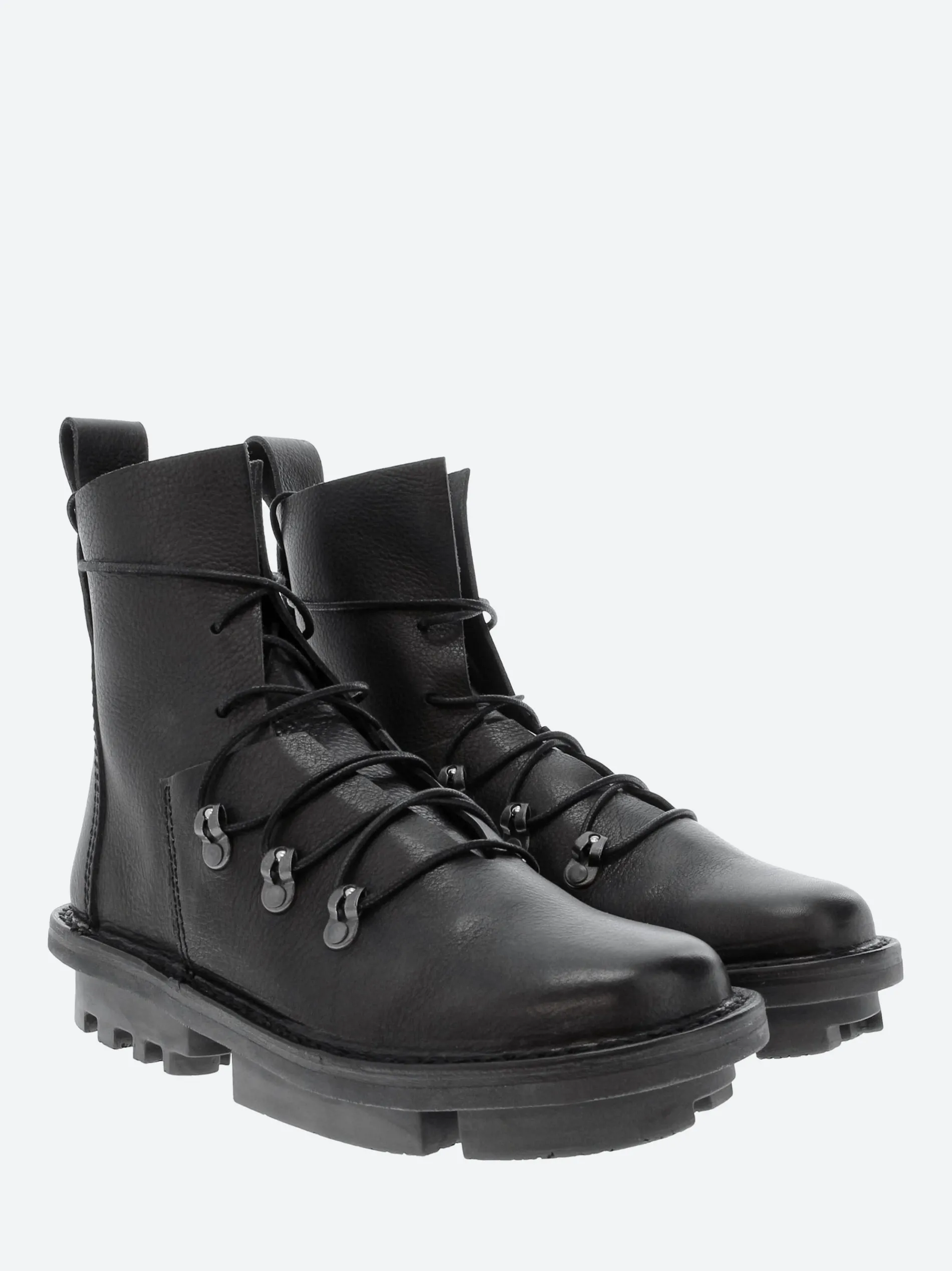 Rugged, lace-up boot with vertically stitched lines and an open, deconstructed form.