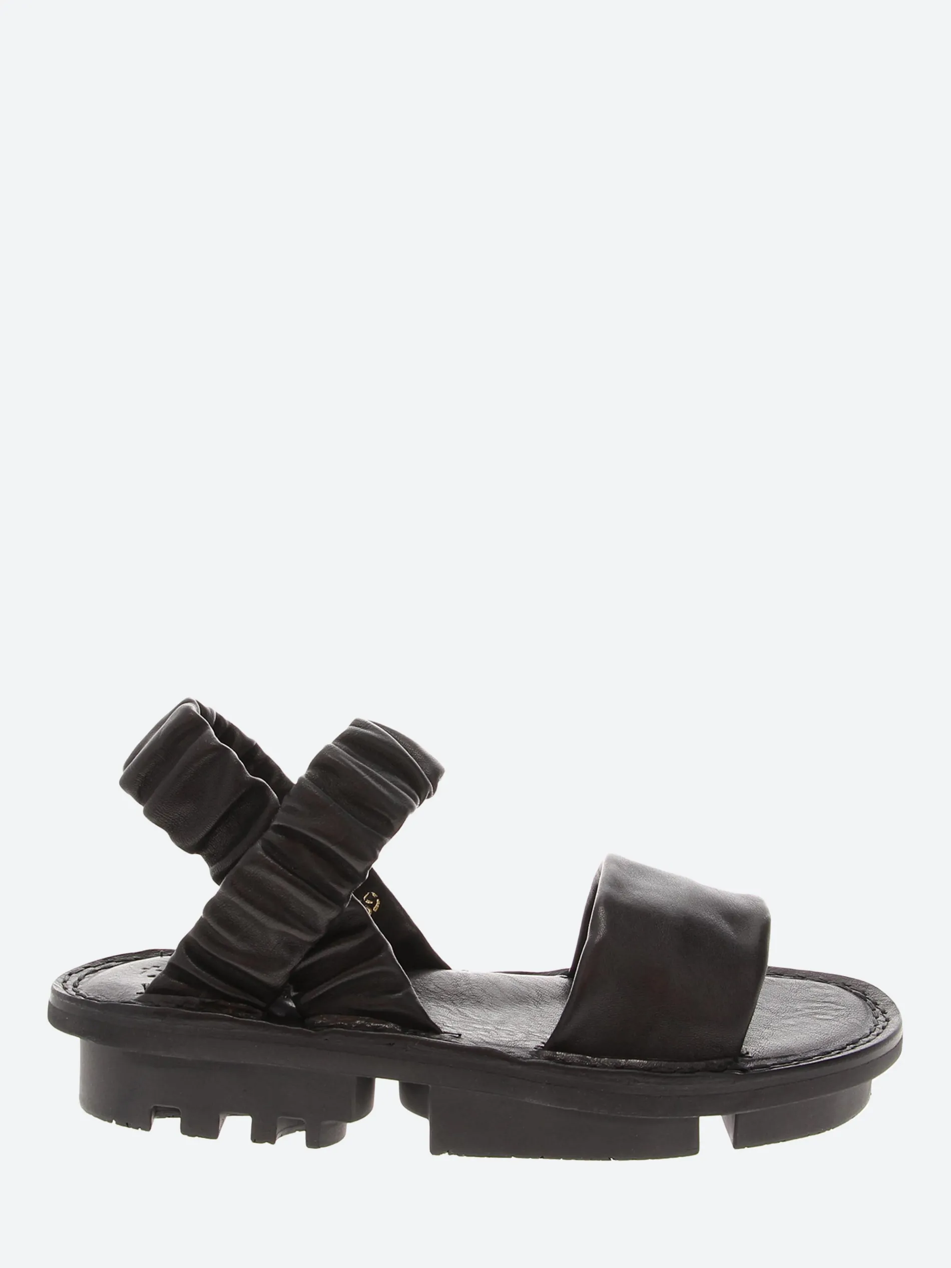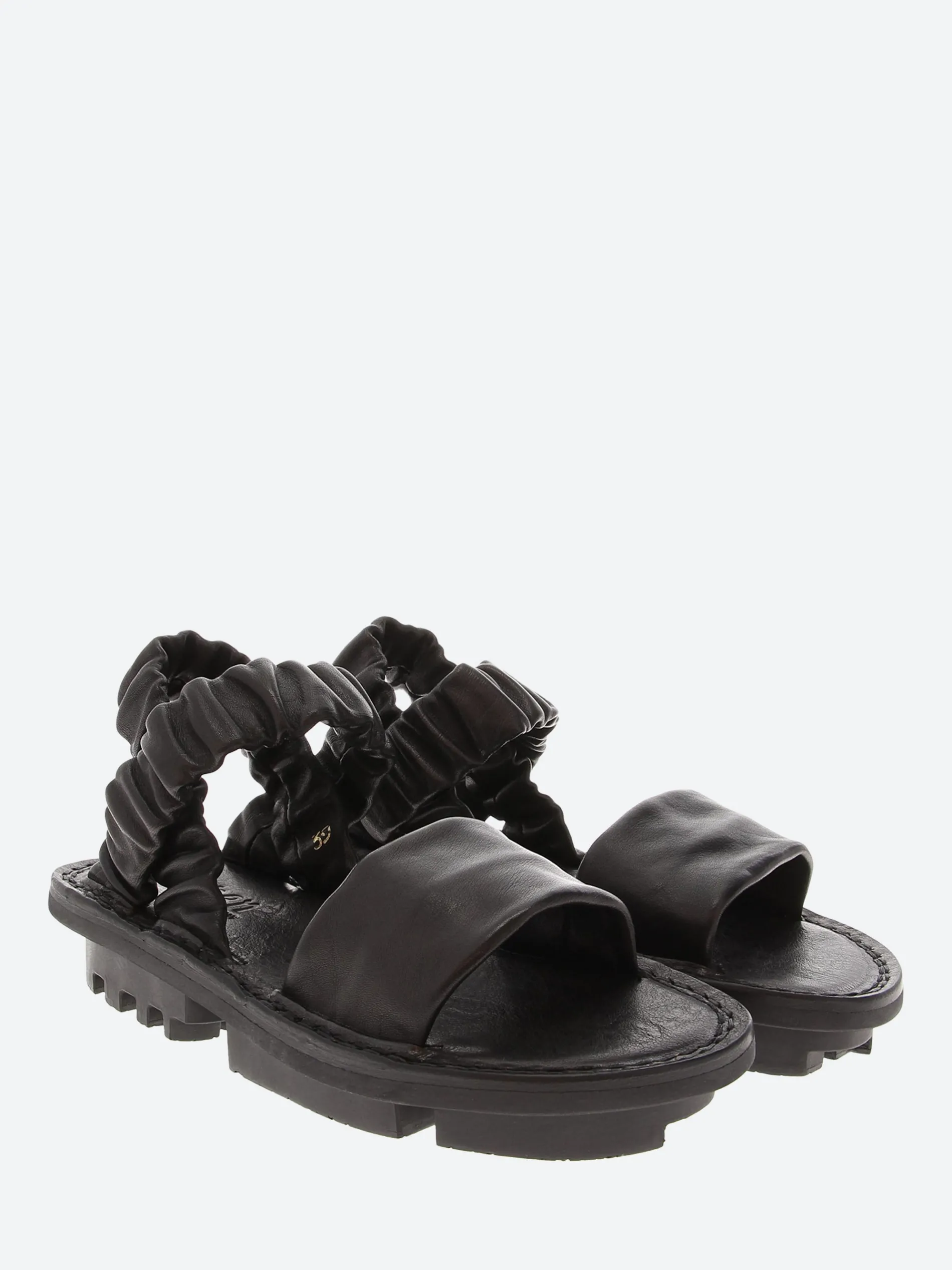 Classic sandal with a smooth leather strap across the front of the foot and leather-covered elasticated straps across the instep and heel.