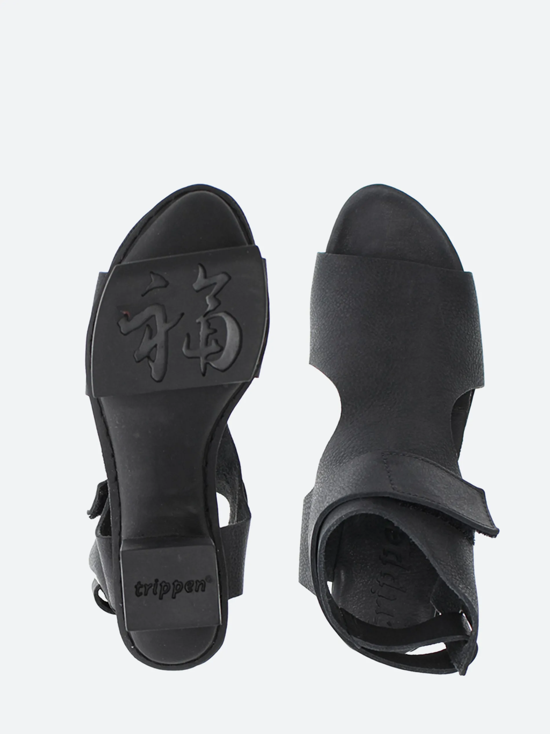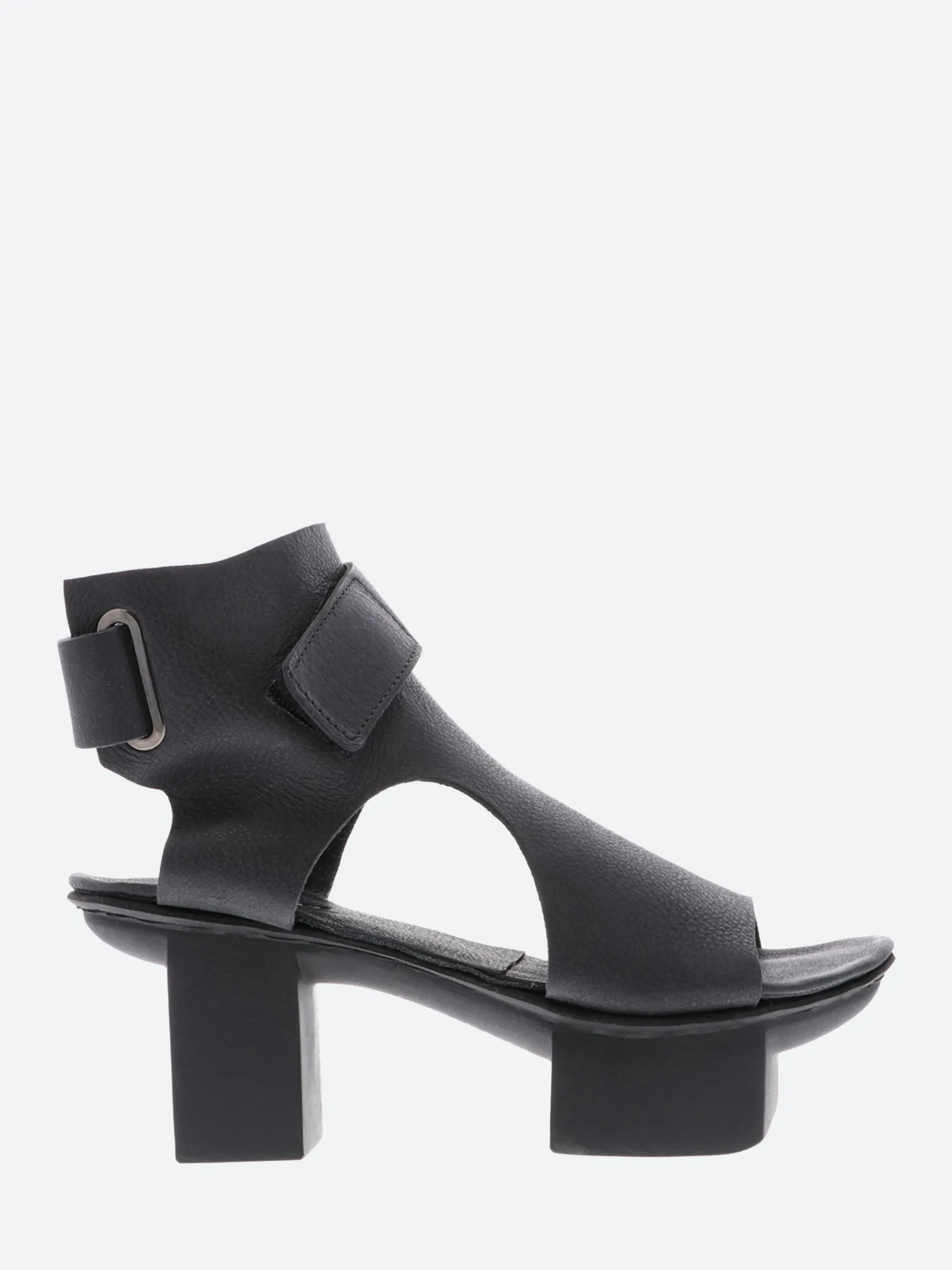High-cut sandal, open at the sides and at the heel. The broad strap, led through a metal loop, runs around the ankle. A Velcro fastener provides optimum support.