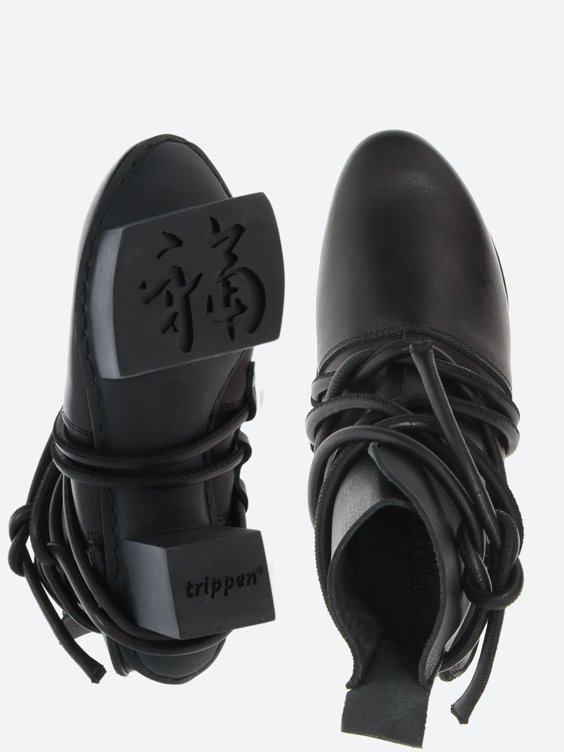 The wide leather cord is wrapped several times around the foot and ankle and fastened with a reef knot. It is riveted on the inside in such a way as to make this ankle boot fully functional despite its unusual appearance.