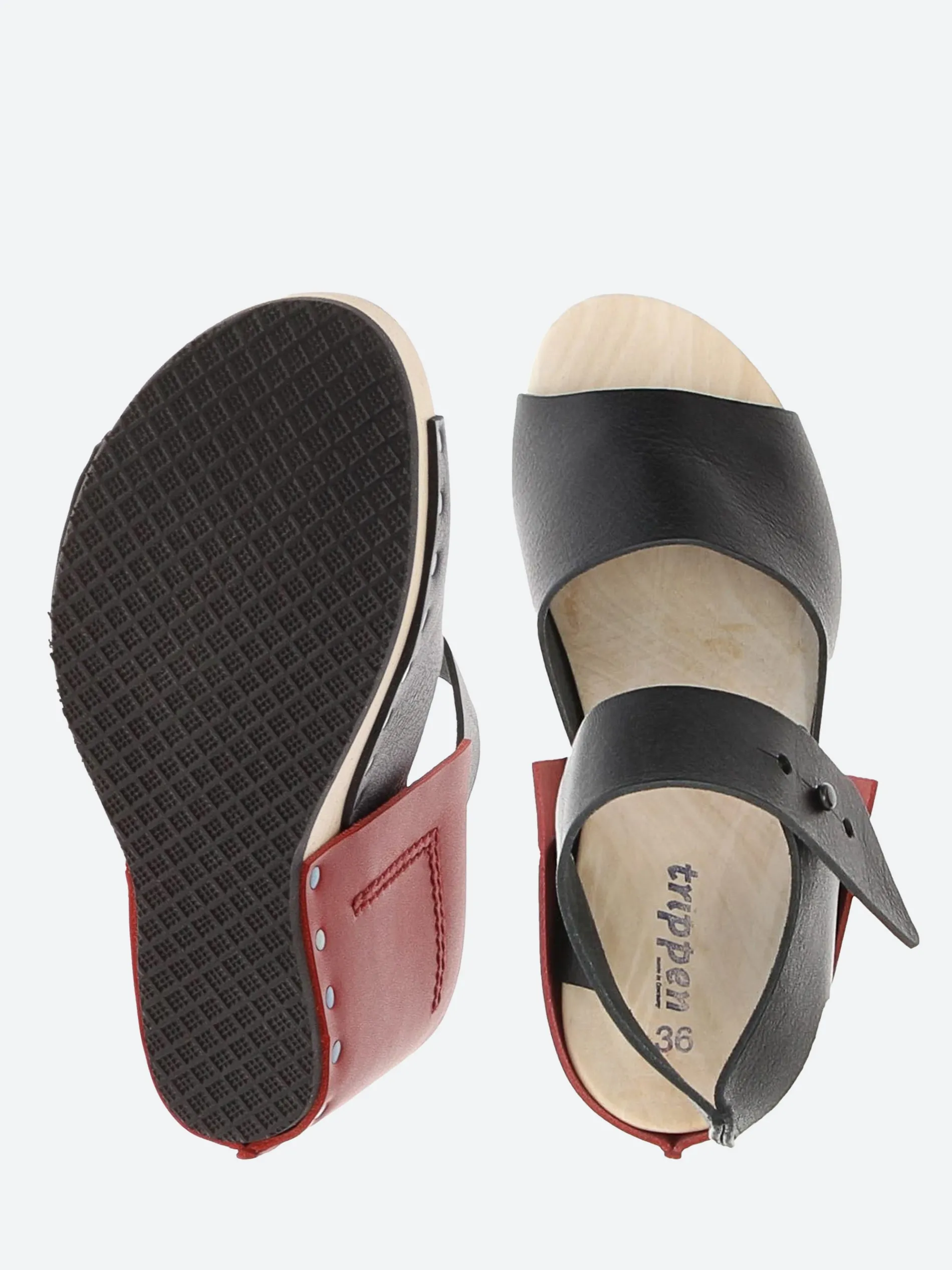 Trippen Wood Stand, this simple sandal on a high wooden sole is characterized by a dominant rectangle of leather wrapped around the heel.
