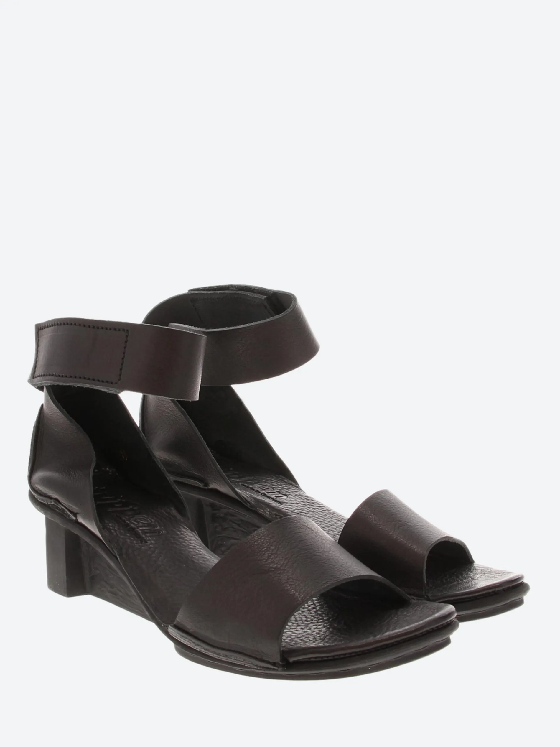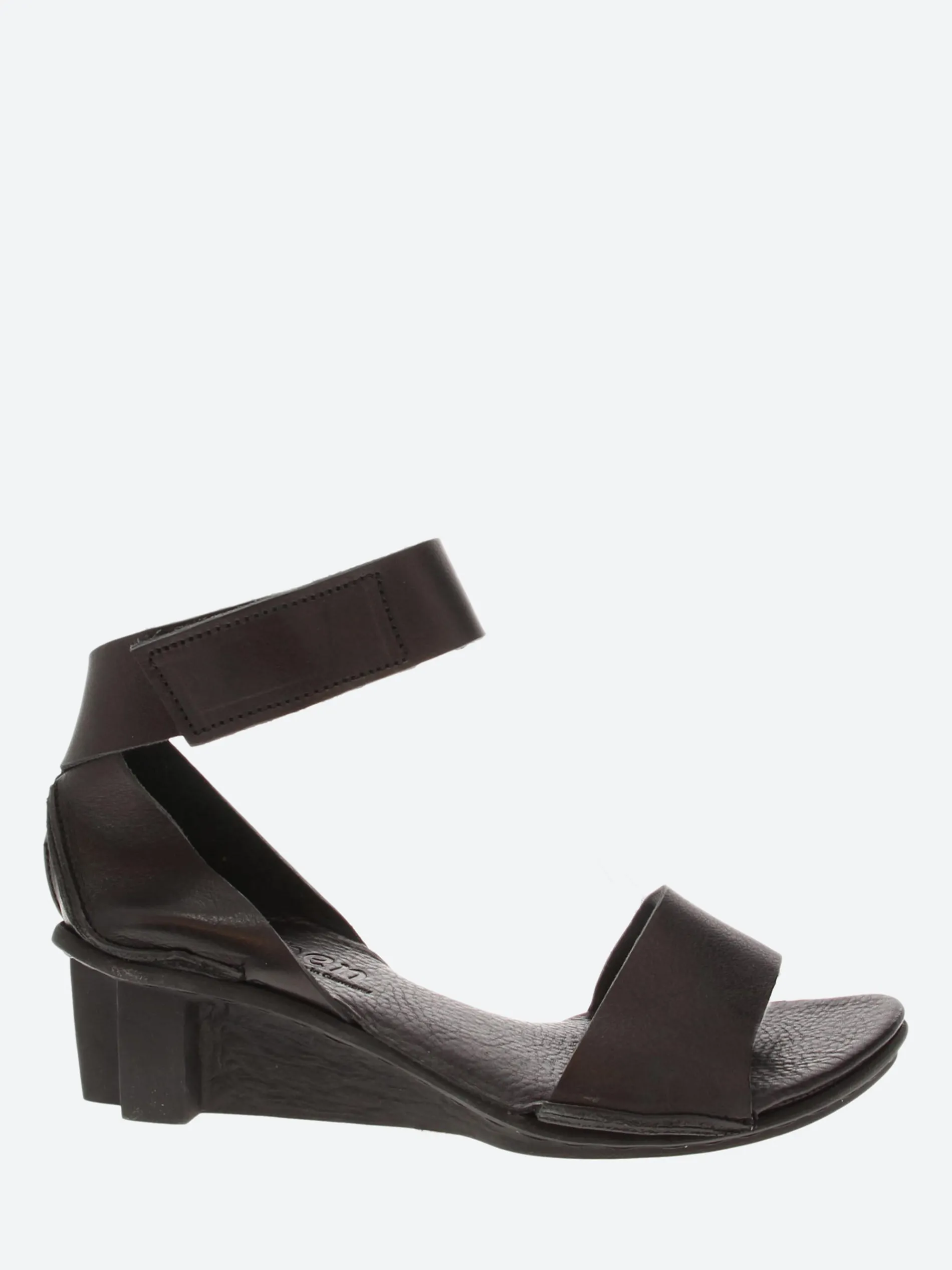 Simple sandal open wide over the toes and closed at the heel with a broad strap running dynamically around the ankle and a Velcro fastening.