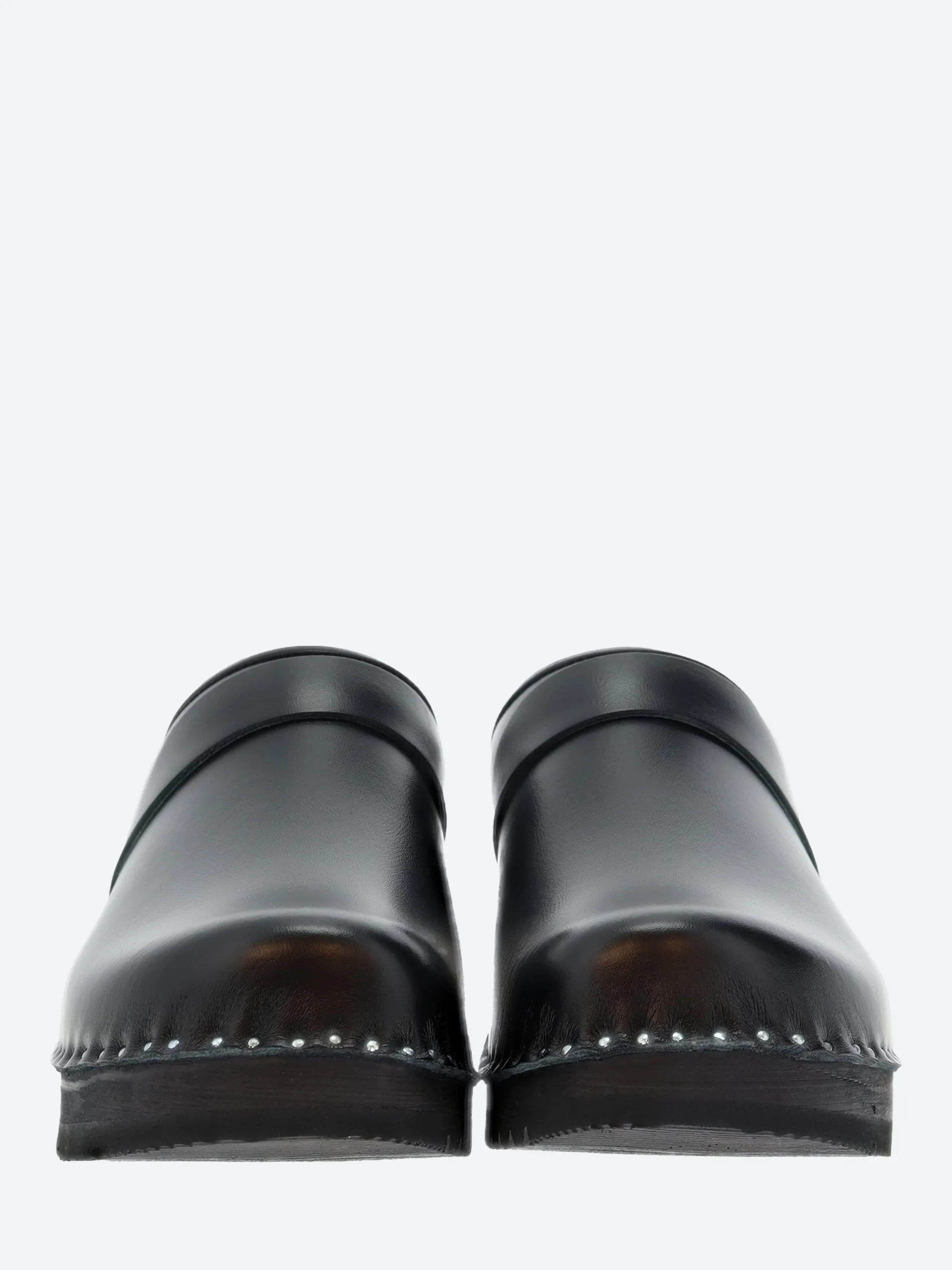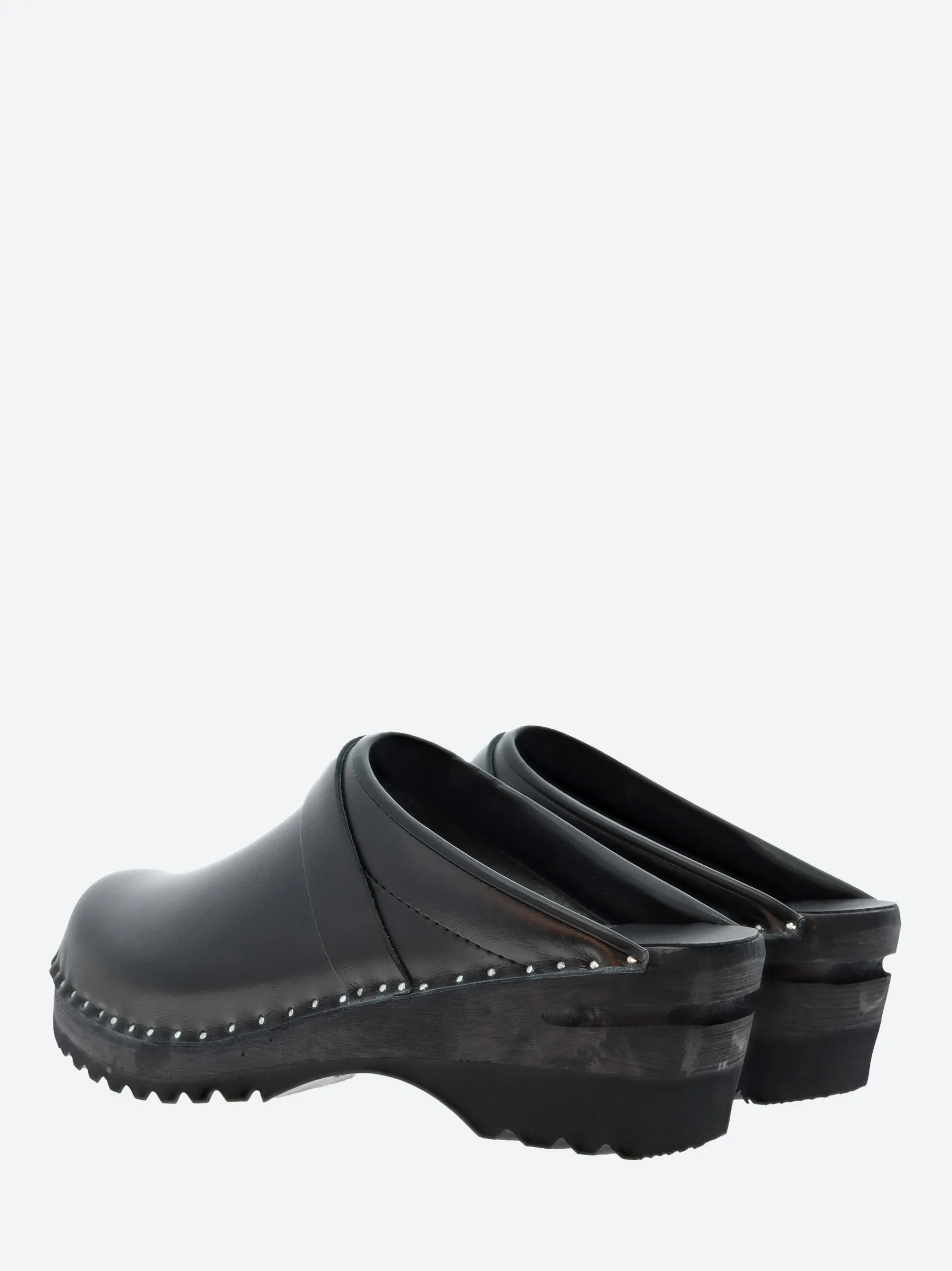 Troentorp Chef clogs has been a popular clog among chefs for years. Here it comes in black leather on black stained ideal bottoms.
