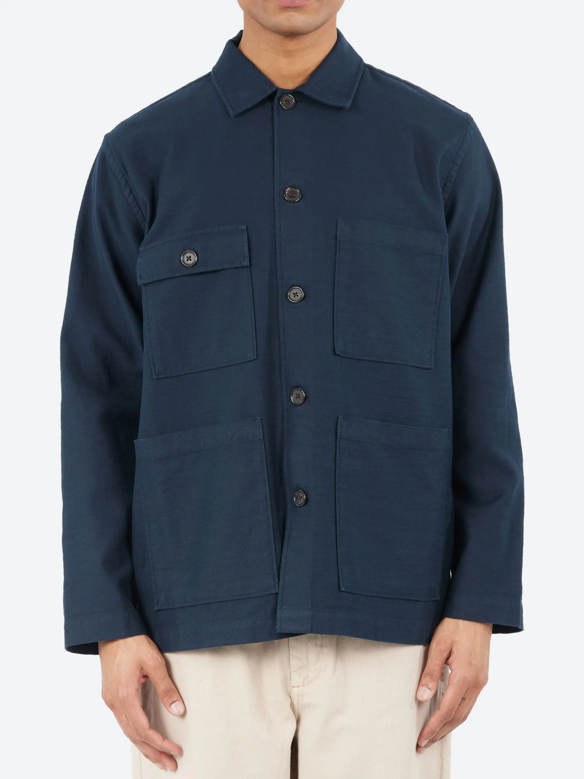The Universal Works Dockside Jacket combines practicality and functionality with its unstructured design. It features a back yoke with pleats for added movement and shape, while the four front pockets are inspired by military fatigue styles. The jacket’s relaxed fit and thoughtful detailing make it an ideal choice for both everyday wear and more rugged tasks.