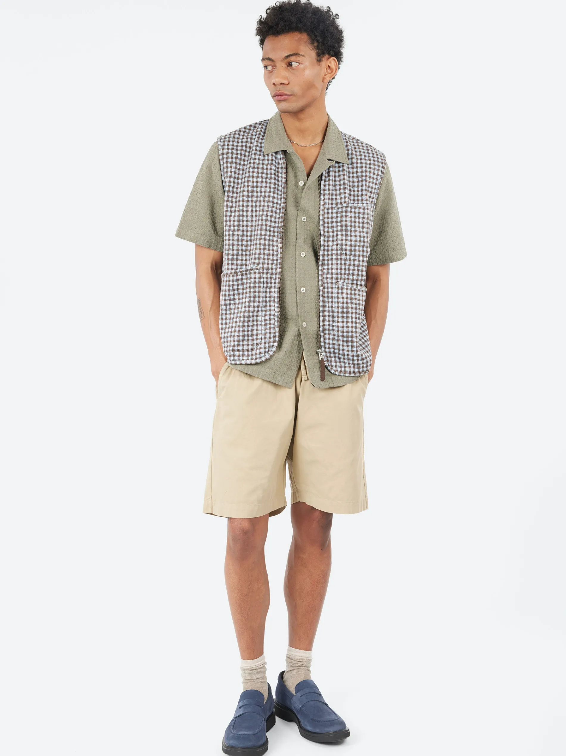 The Universal Works gilet offers a loose fit with a straight cut, featuring a two-way zip for added versatility and styling options. It also includes two angled lower patch pockets and a single chest patch pocket for practical storage and a stylish finish.