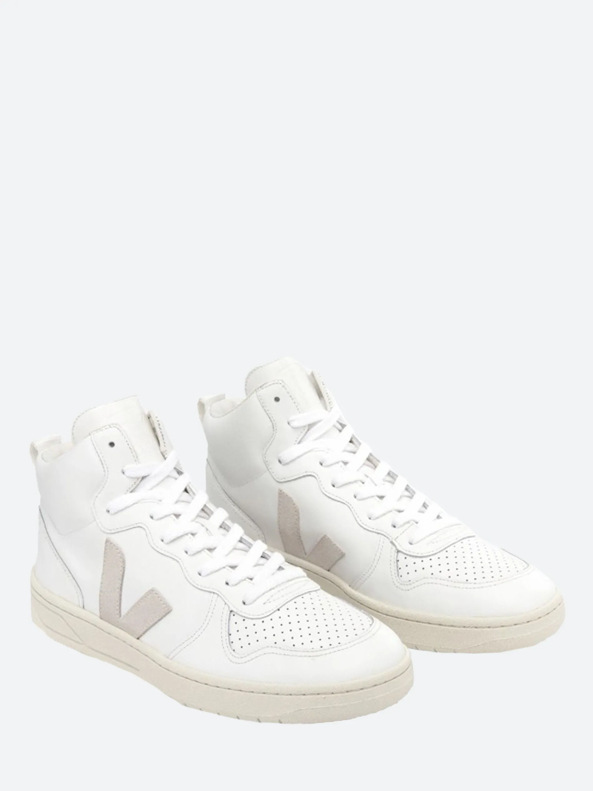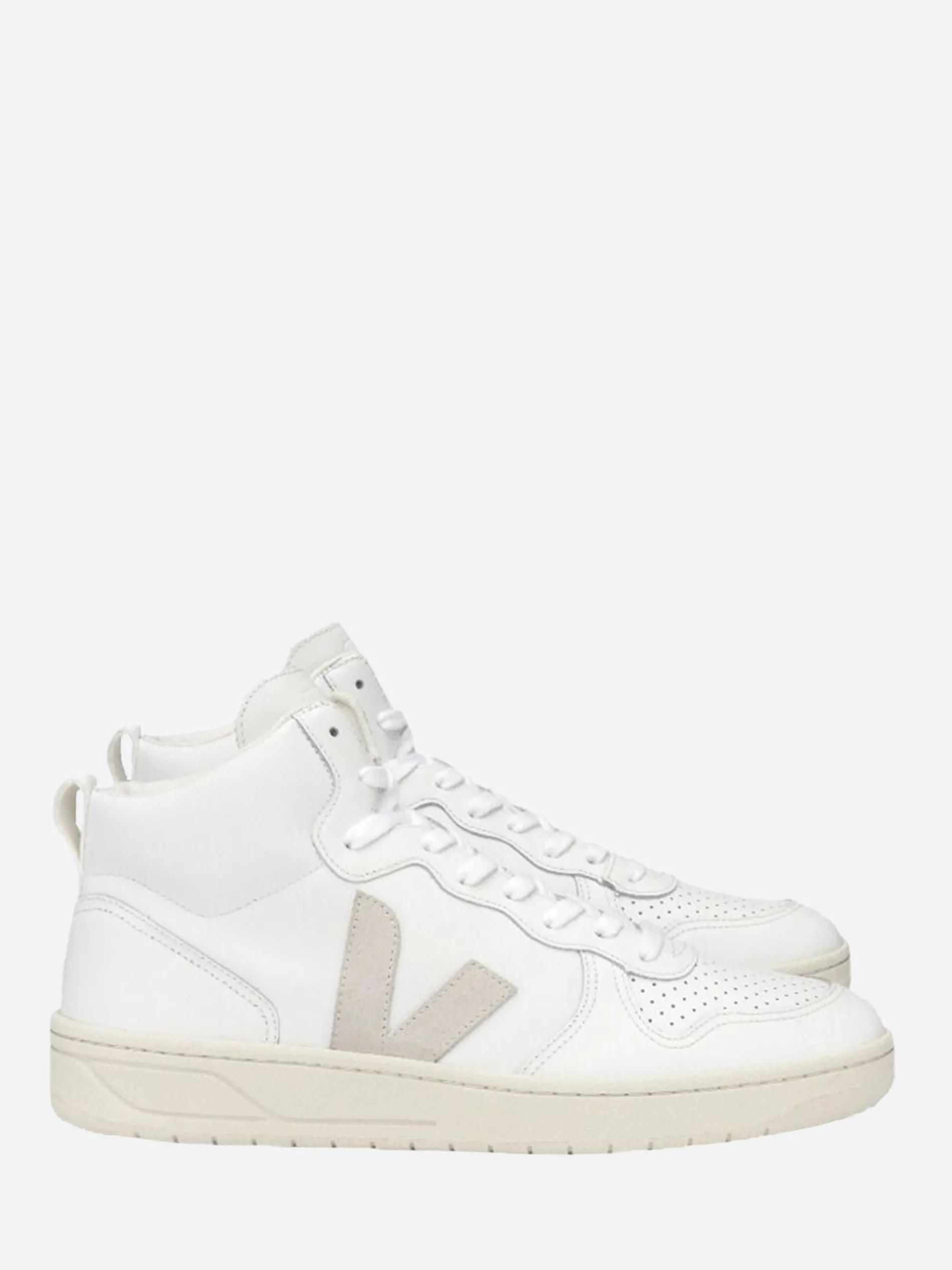 Veja V-15 high top sneakers made from leather. The leather come from farms in Rio Grande do Sul. It is tanned in Brazil according to REACH standards. The tanneries supplying VEJA leather are certified L.W.G. Gold by the Leather Working Group, which promotes sustainable practices that have a positive impact on the environment in tanneries.