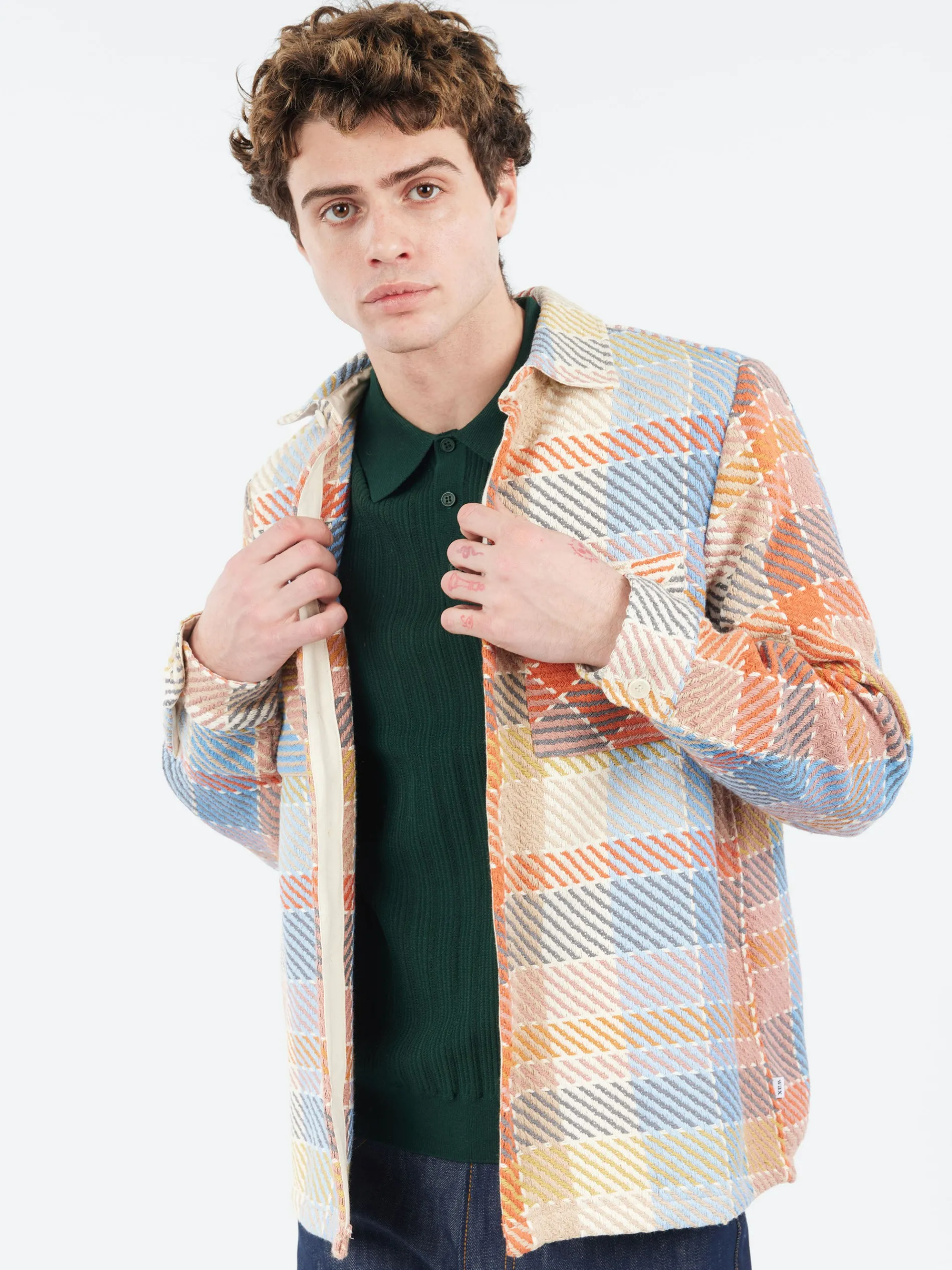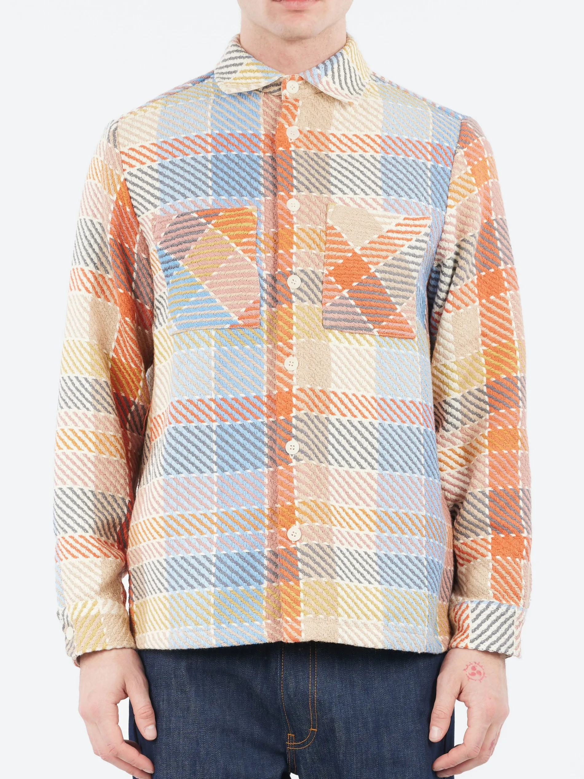 The Wax London signature piece. The pike check Whiting has become a staple and for SS25 we’ve reimagined it with a fresh blend of coral, orange hues, and pale blue yarns. Crafted from a fabric made sustainably by a family-run French mill using recycled cotton, this effortlessly wearable overshirt combines timeless style with responsible craftsmanship.