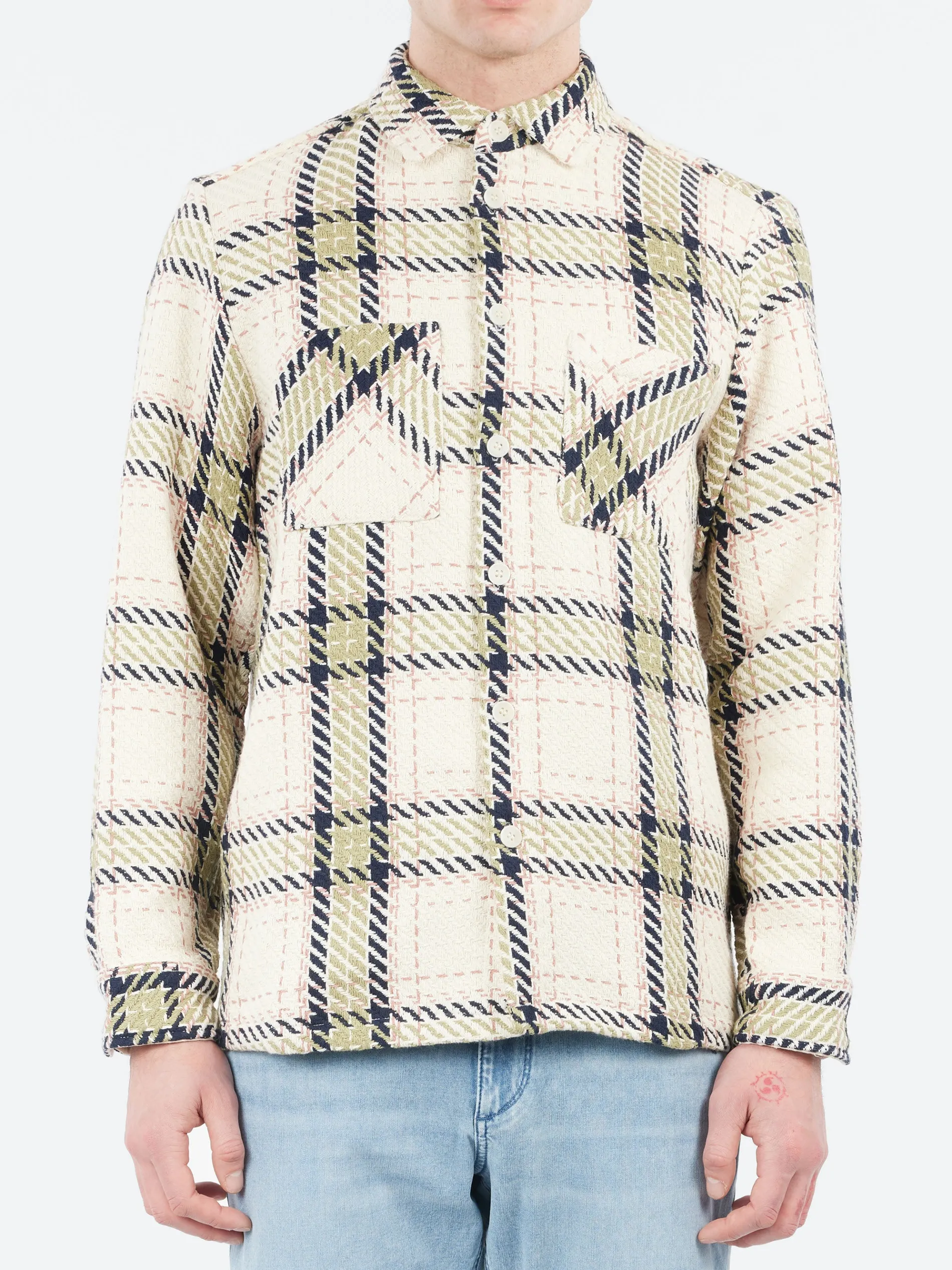 The Wax London signature piece. The Whiting, a year-round staple, returns in a new harp check woven design that mixes ecru, sage green and coral yarns. This fabric is made sustainably by a family-run French mill using recycled cotton and features environmentally-friendly Corozo nut buttons and front patch pockets.