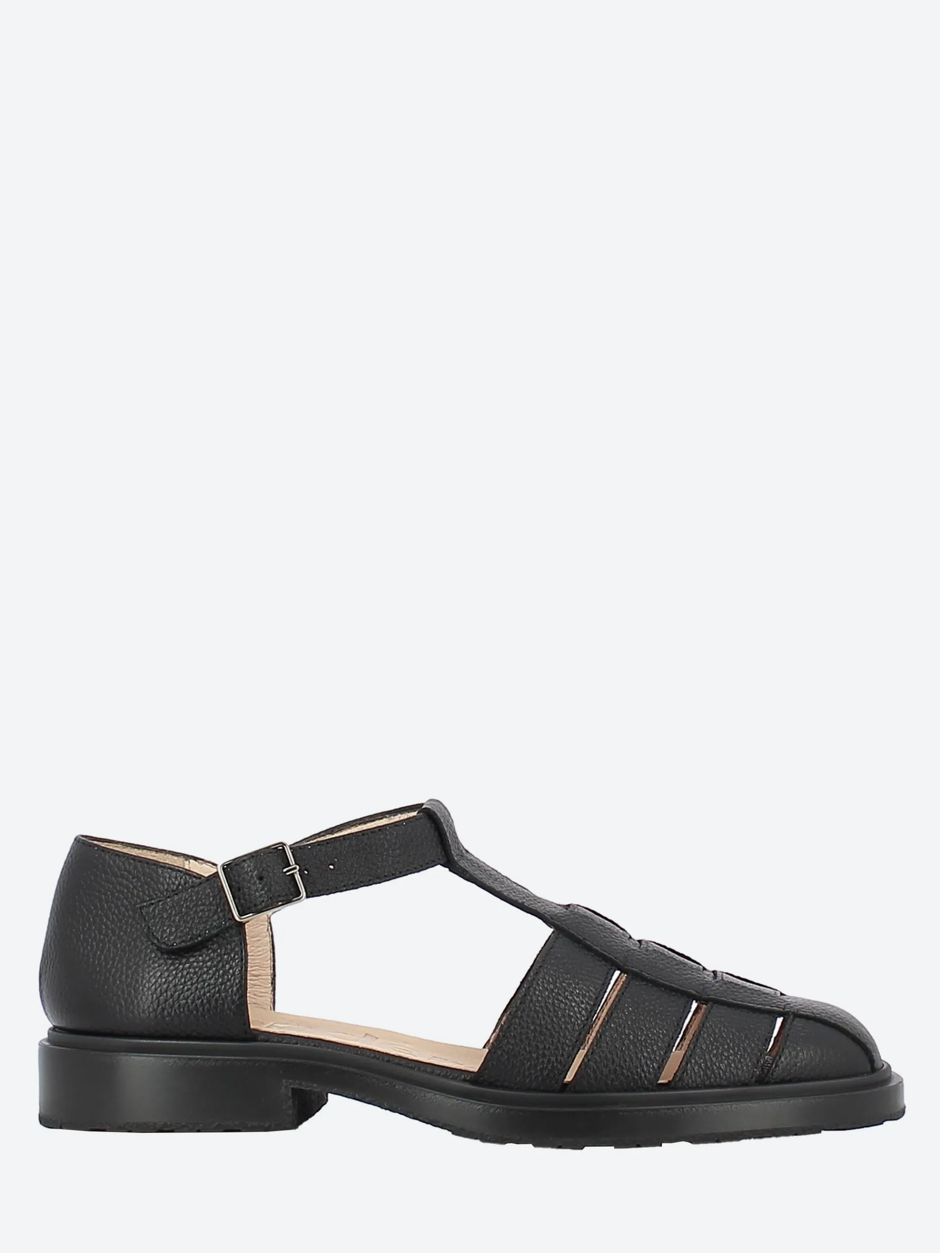 Closed toe fisherman sandal in pebbled leather on a low profile rubber sole.