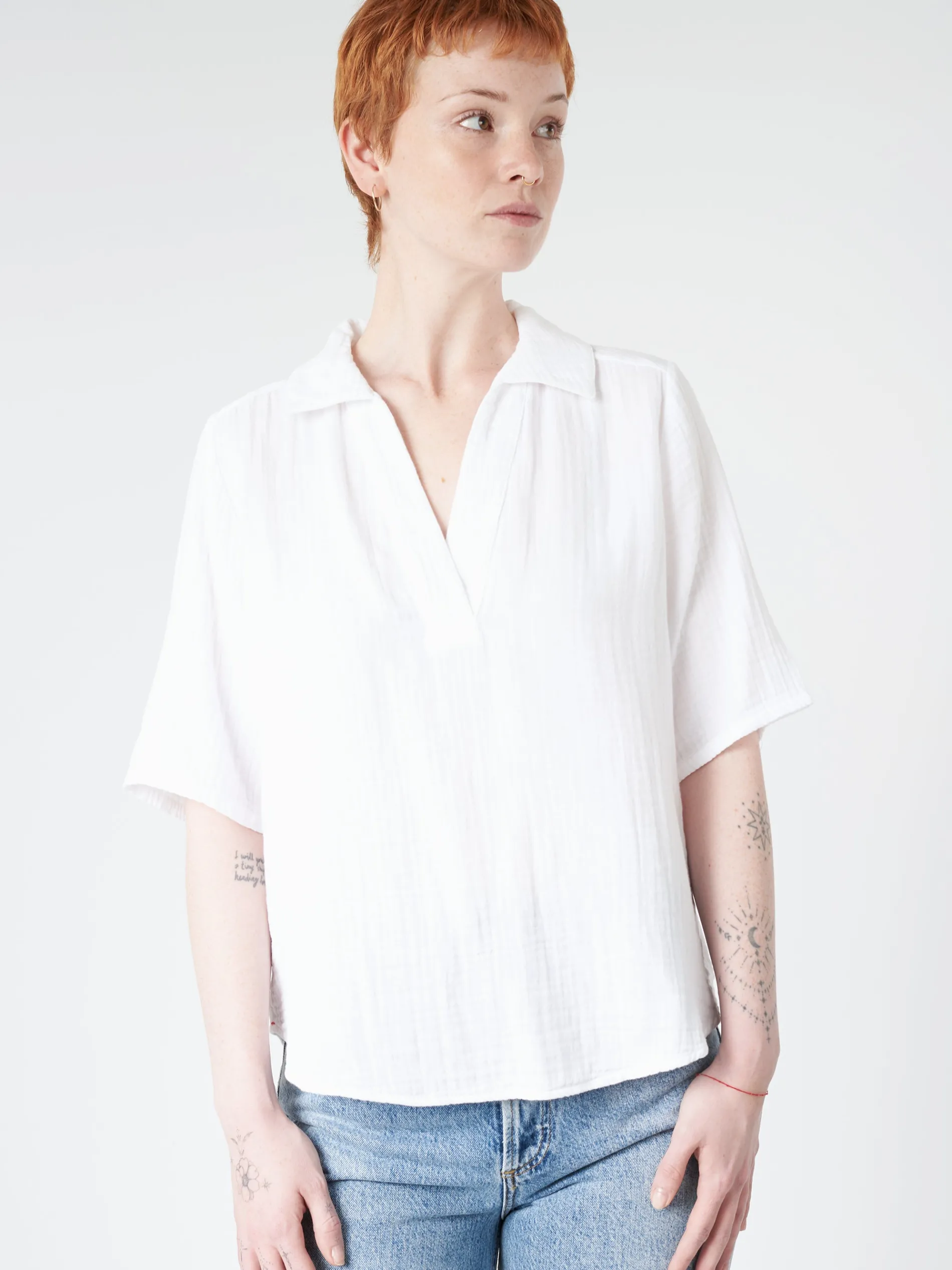 The Ryder Top is an effortless warm-weather staple, cut from washed double faced cotton gauze with an easy, deep V-neckline.