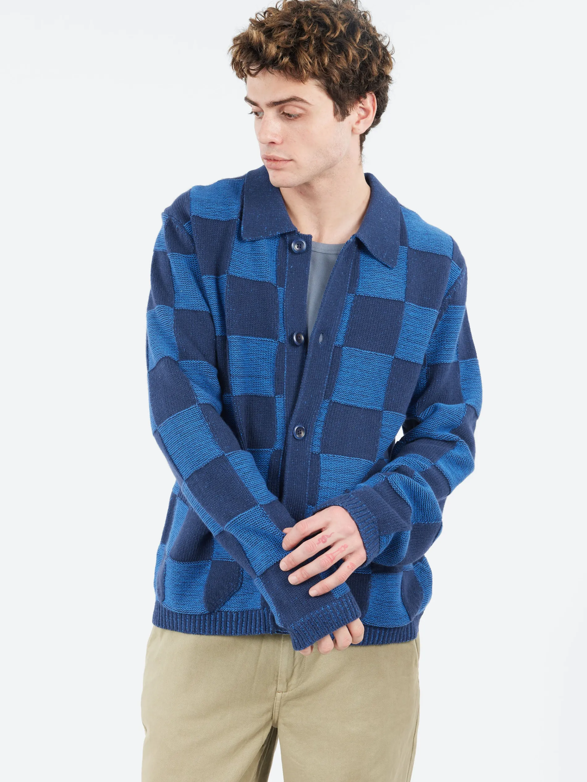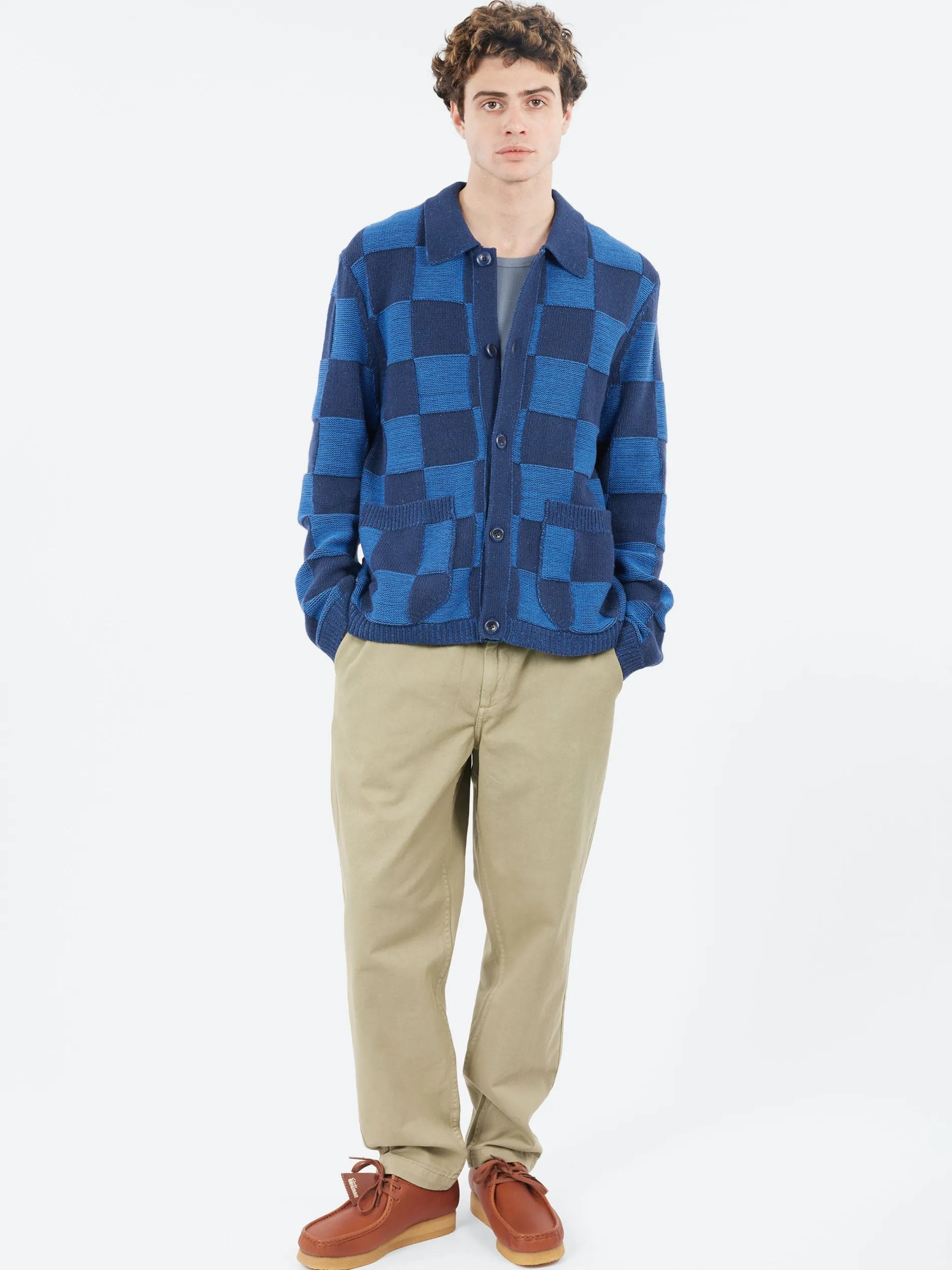 The YMC Baker Cardigan is a collared knitted cardigan made from a wool and cotton blend. It features a checkerboard plated knit design that adds texture and visual interest. The cardigan includes lower patch pockets for practicality and a corozo button fastening for an eco-friendly touch. A stylish and cozy piece, perfect for layering.