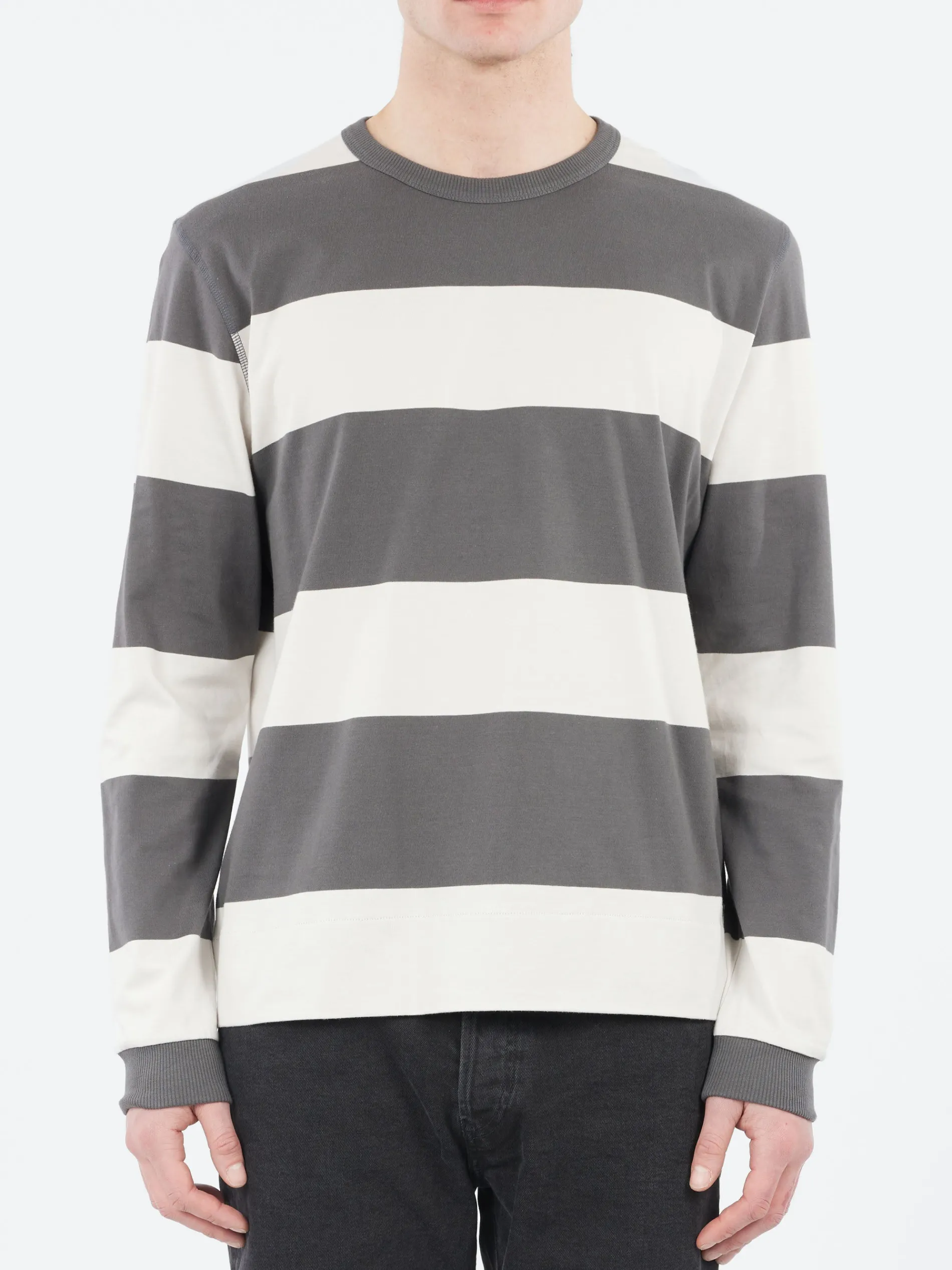 The YMC C86 Top is a long-sleeve crew neck top made from midweight Portuguese cotton jersey. It features a bound-style rib neckband and cuffs for a clean, structured finish. The contrasting two-tone stripe adds a bold design element, while the deep hem gives it a relaxed, stylish look.
