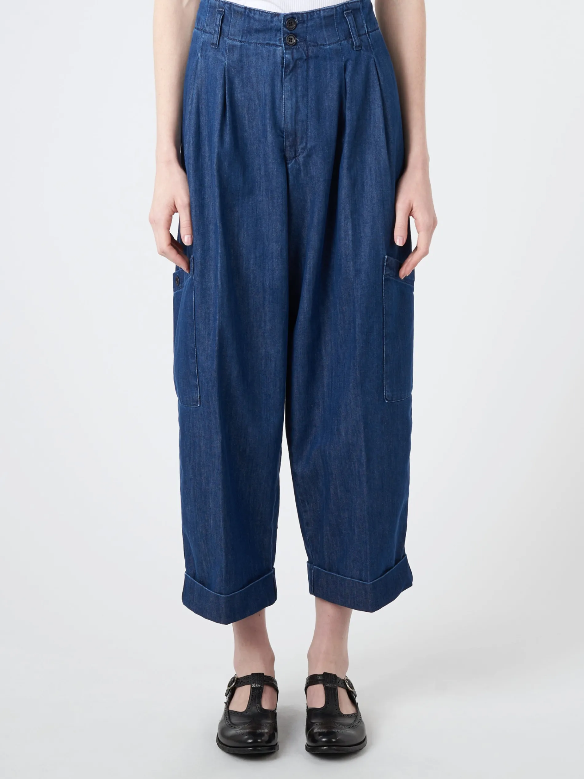 High-waisted wide leg trouser made from a 8.6oz washed denim recycled cotton blend.