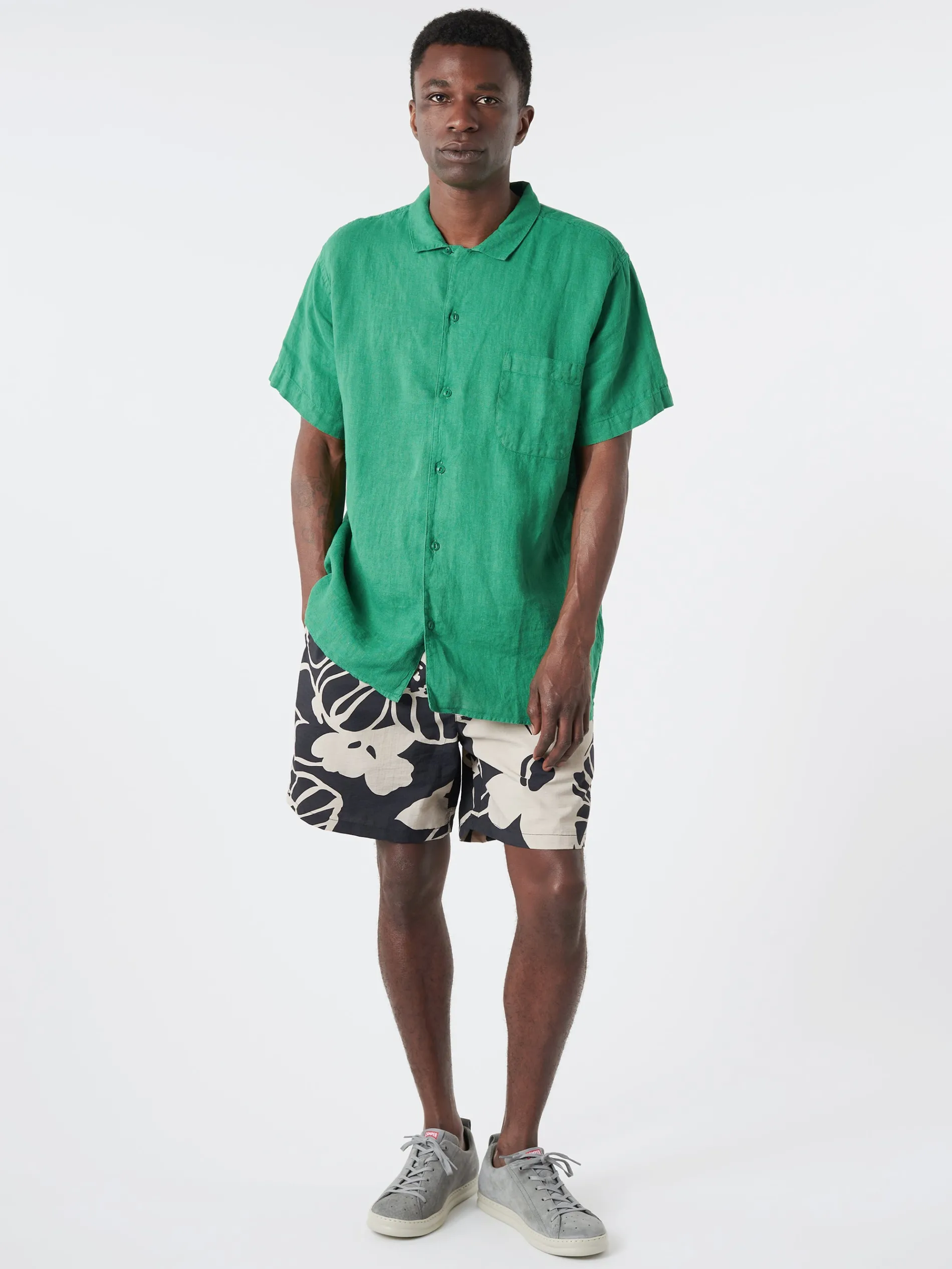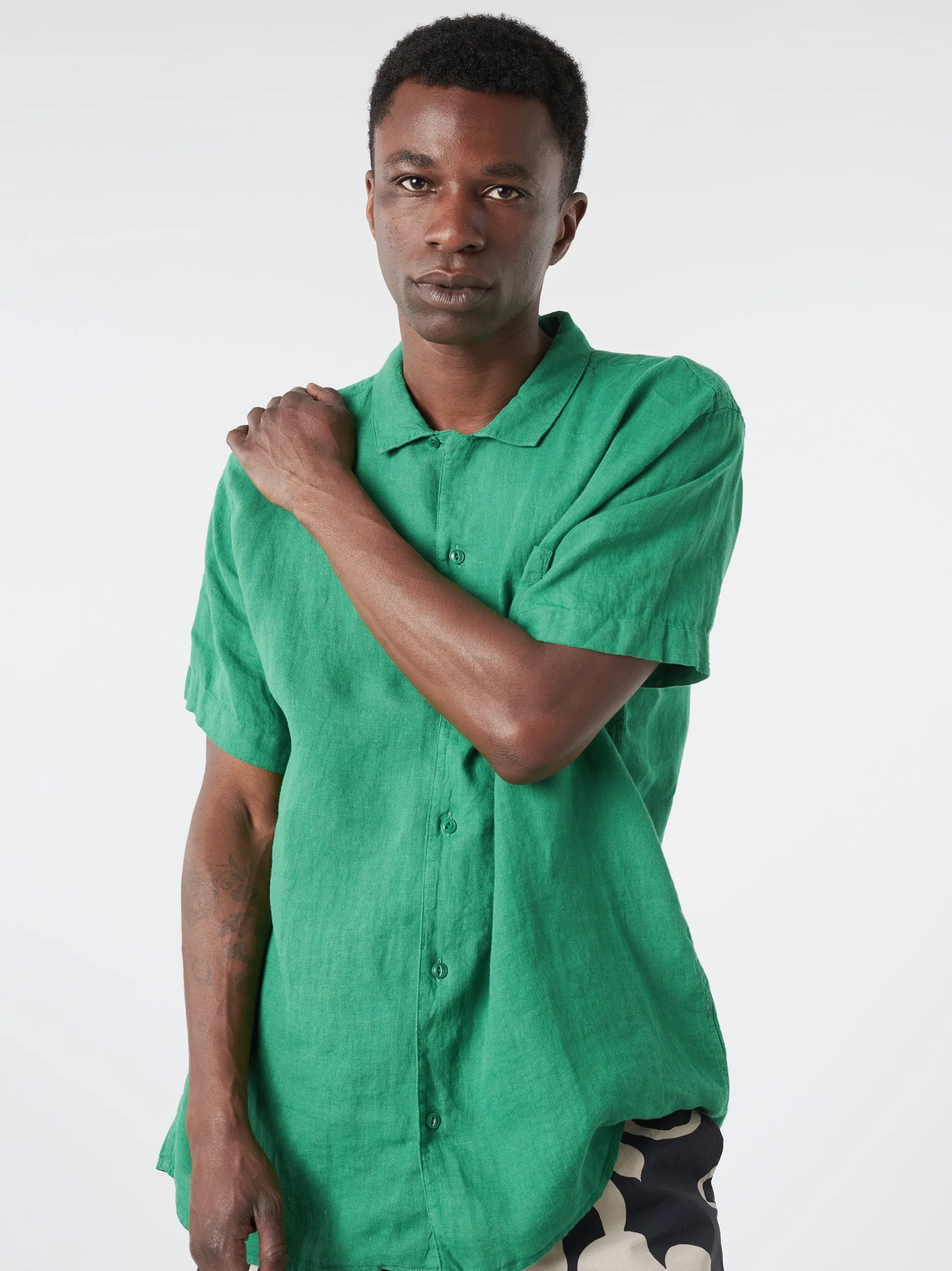 Boxy fit short sleeve shirt in garment dyed and washed linen.