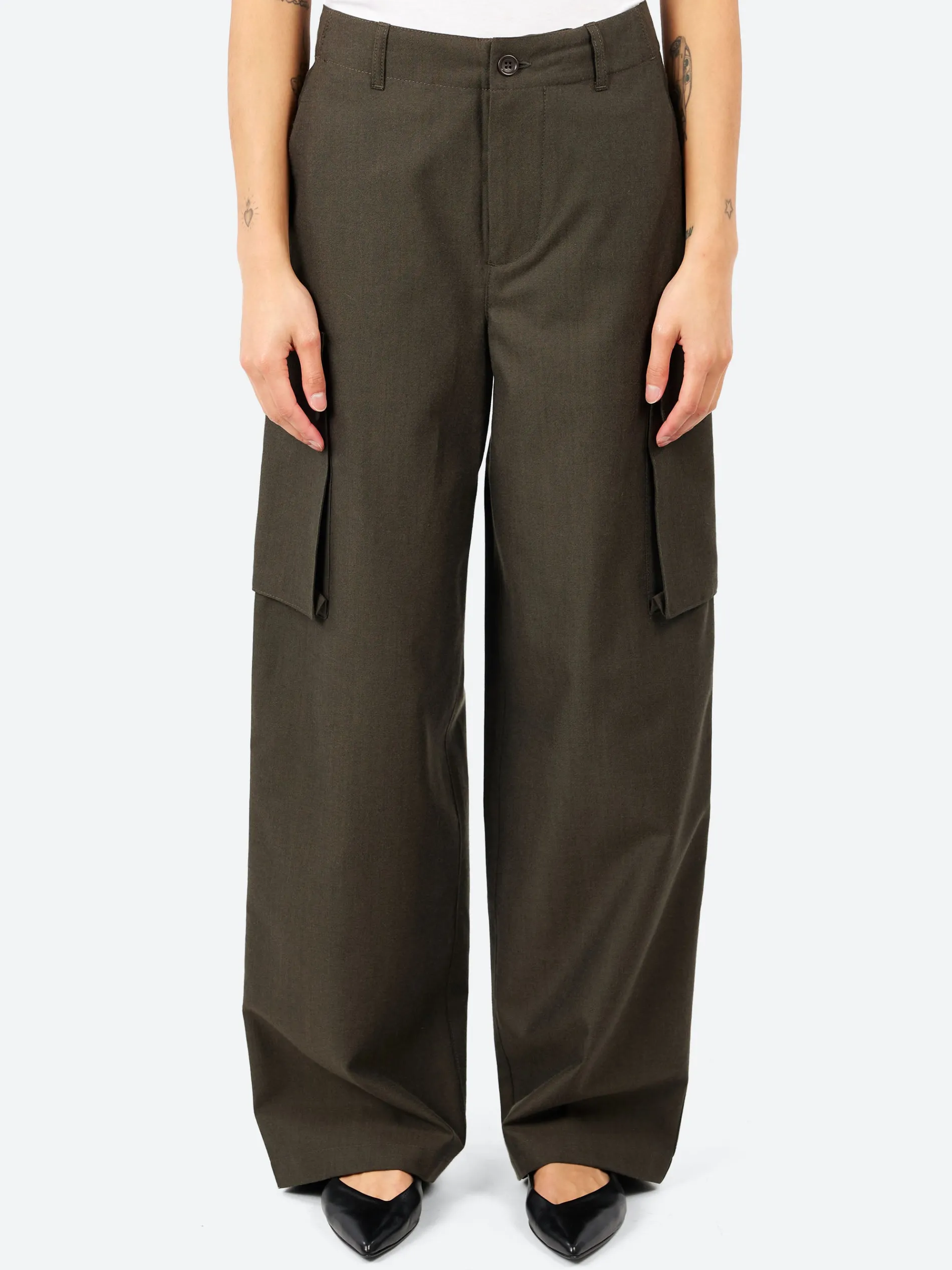 The YMC Stoosh trousers are made from a Portuguese wool blend, offering a stylish yet durable fit. They feature utility-inspired bellowed cargo pockets, a welt back pocket, and a corozo button waist with a YKK zip fly. With a grown-on style waistband, these trousers provide a sleek, functional look.