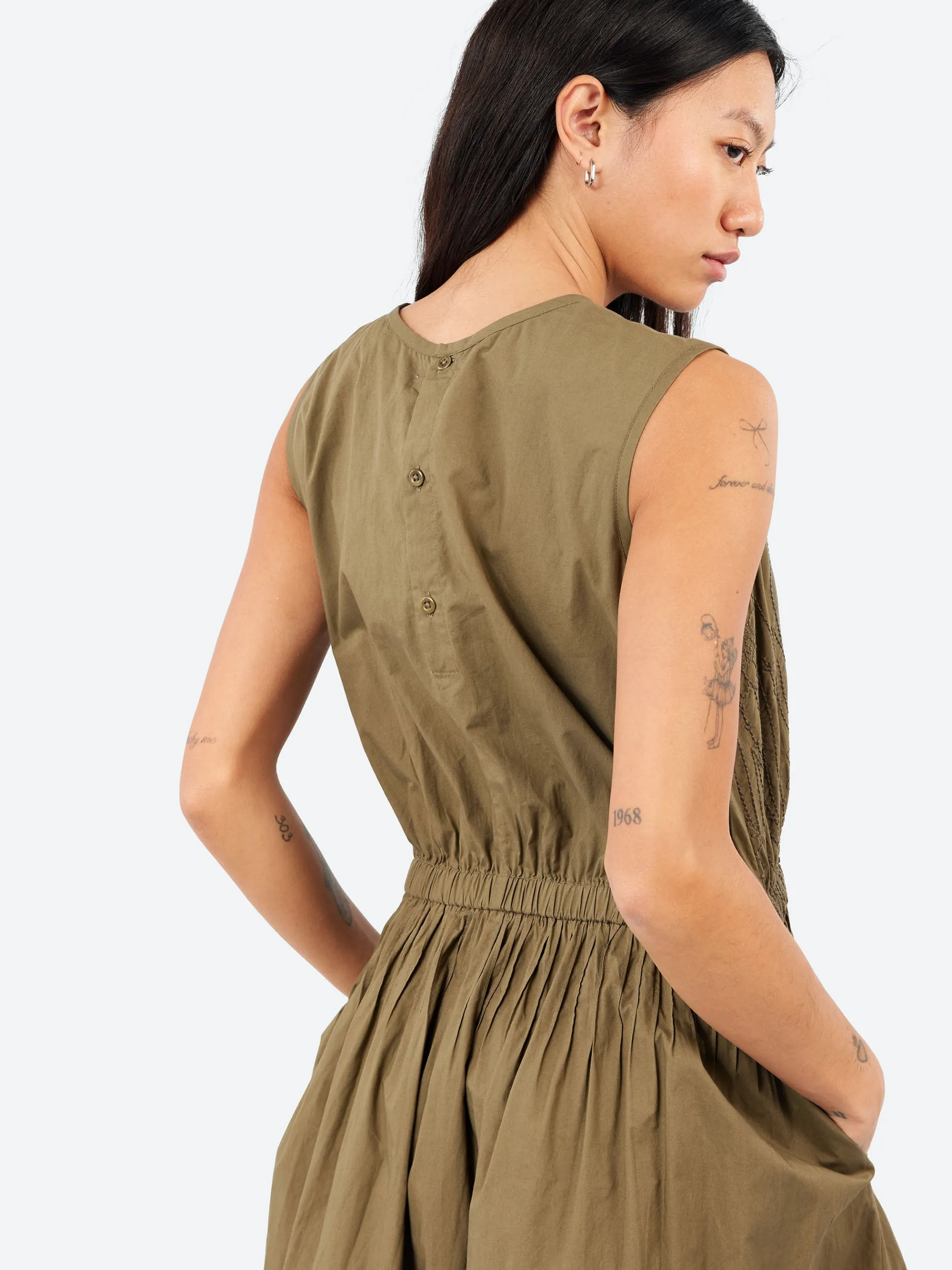 The YMC Sleeveless Mid-Length Dress is crafted from lightweight cotton poplin and garment-dyed for a soft, unique finish. It features charming sunflower embroidery panels and a back neck opening with corozo buttons. The dress is French seamed for added durability and offers a regular fit, making it a perfect blend of style and comfort.